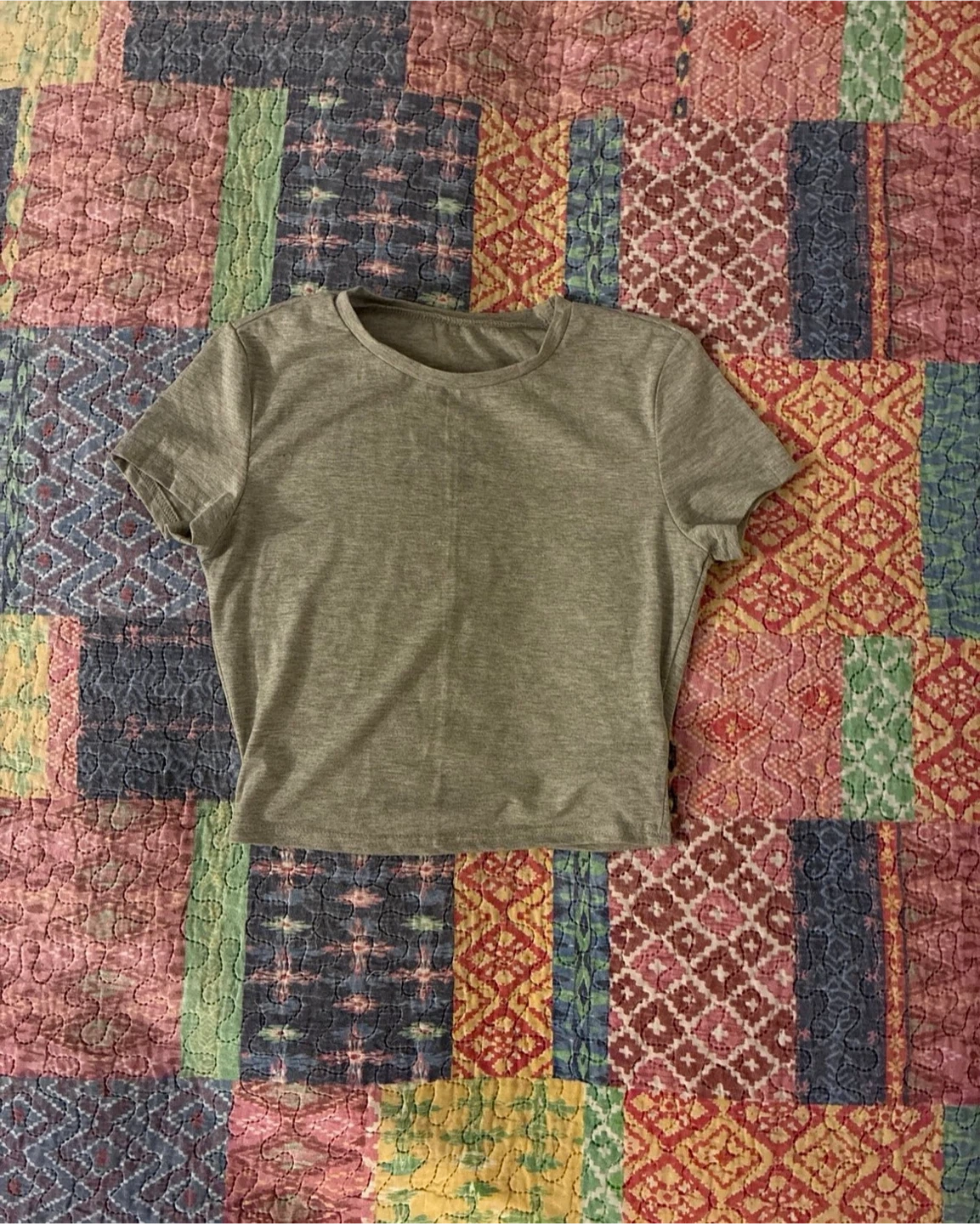 This is a simple grey crop top t-shirt with short sleeves and a crew neck. It's made from a soft, breathable fabric. This top is a versatile wardrobe staple.