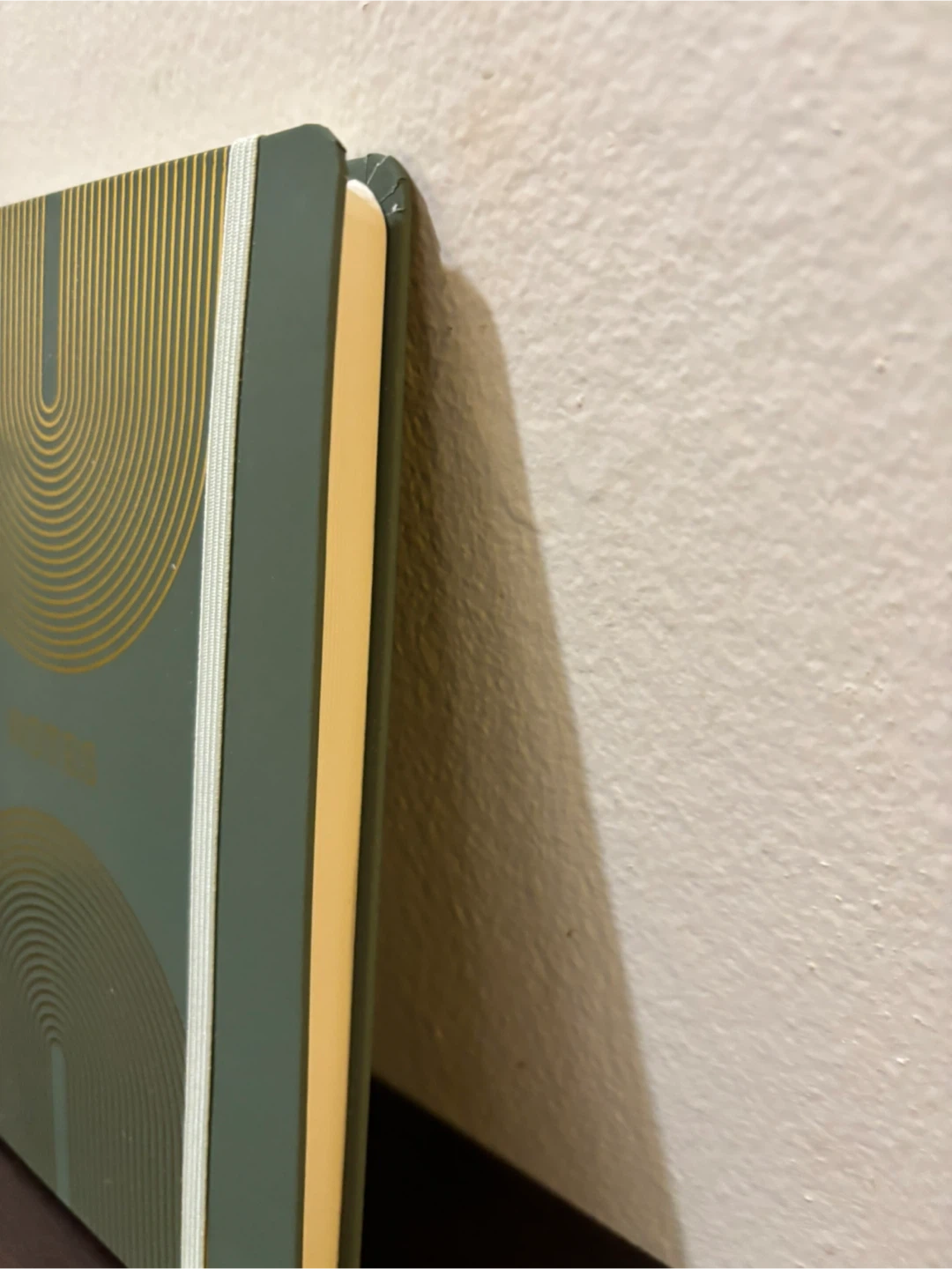 This is a green notebook with gold foil. It features a stylish gold geometric design. The notebook has an elastic band closure and a cream-colored page edge.