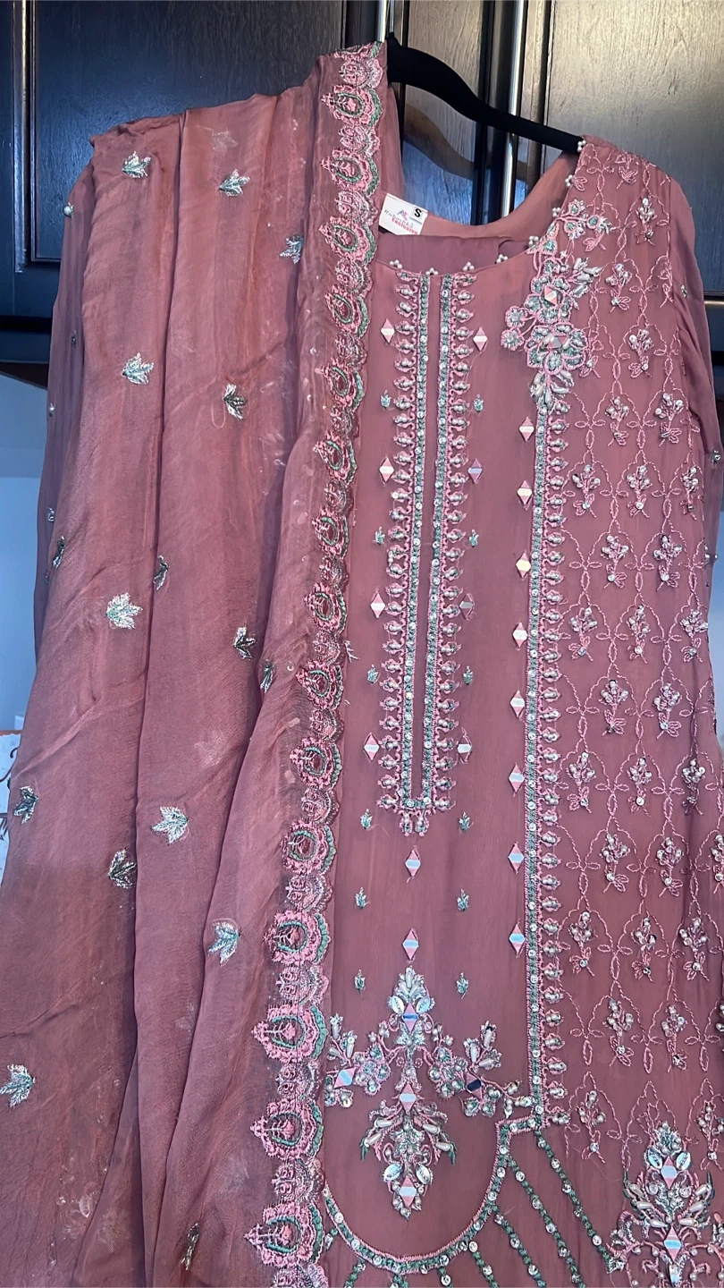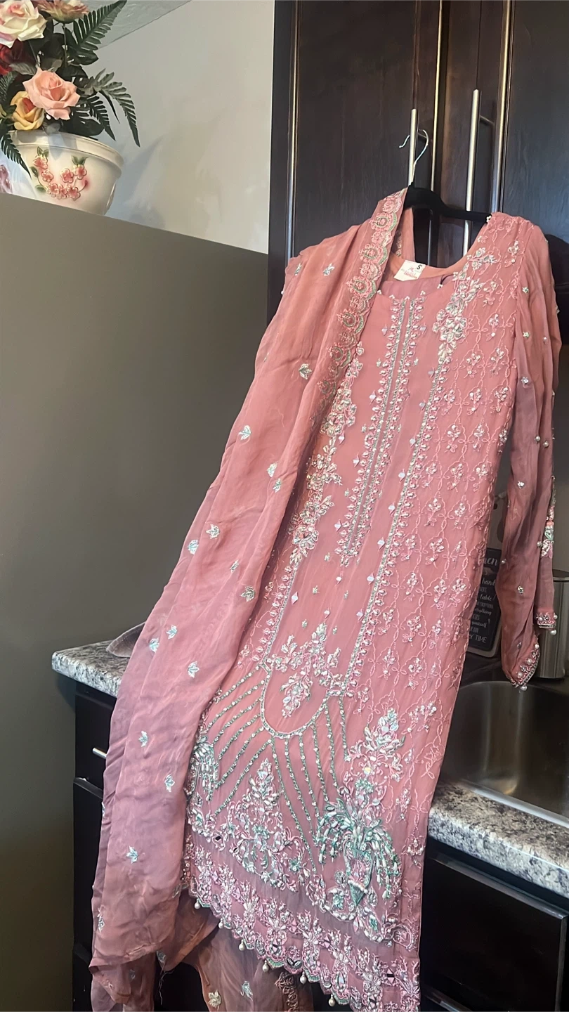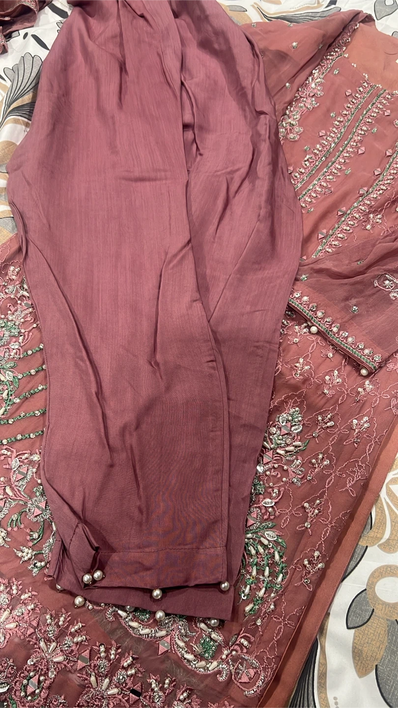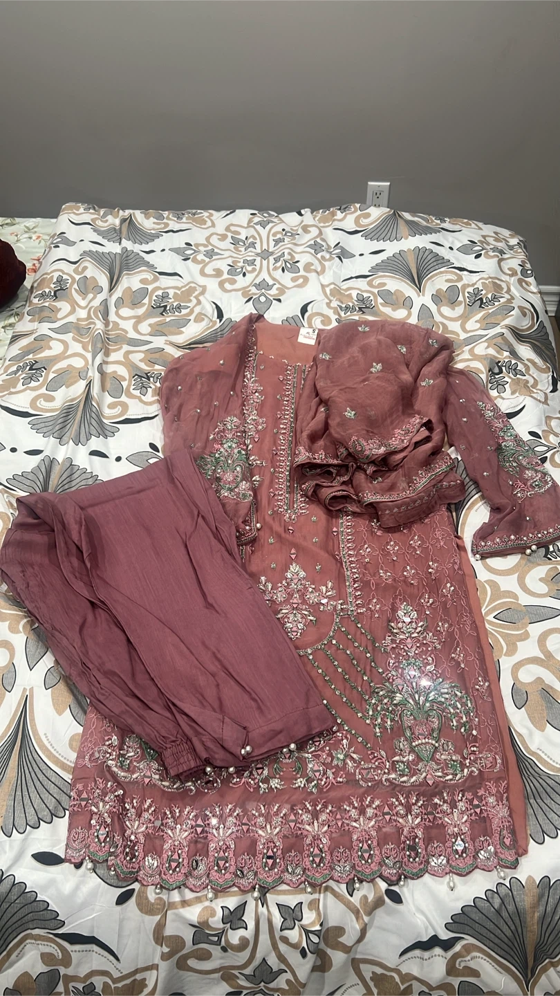 Beautiful dusty rose 3-piece lawn suit with intricate embroidery and pearl bead detailing on the sleeves and pants. Comes with a coordinating dupatta. Perfect for any festive occasion!