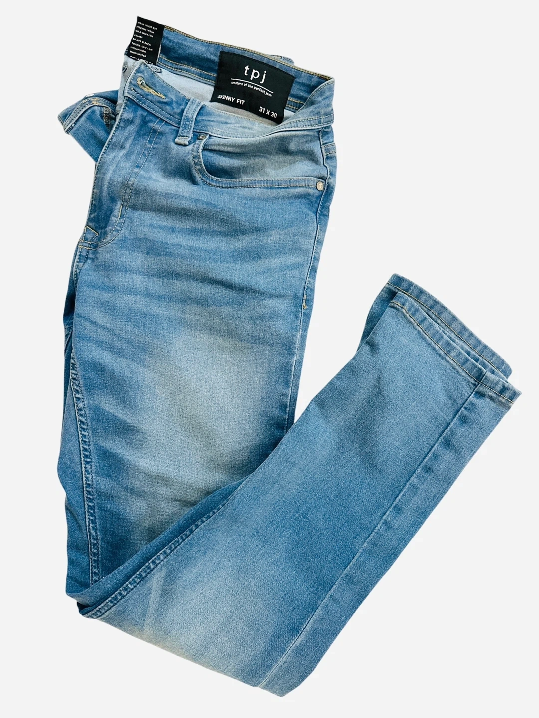 These TPJ skinny fit jeans come in a light wash blue. They're a size 31 waist and 30 inseam. The denim material offers a comfortable stretch. Perfect for casual wear!