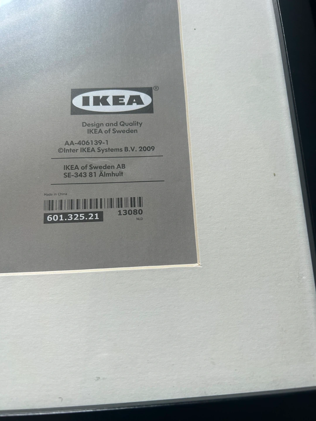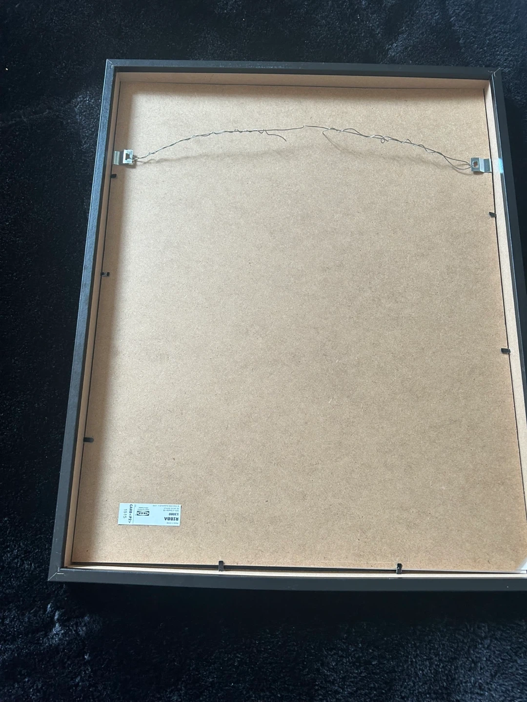 Black RIBBA frame from IKEA. It fits a 40x50 cm picture with the mat or a 29x39 cm picture without the mat. Easy to hang on the wall!