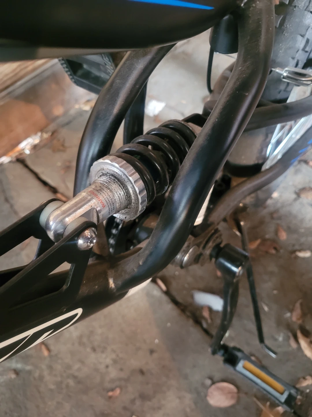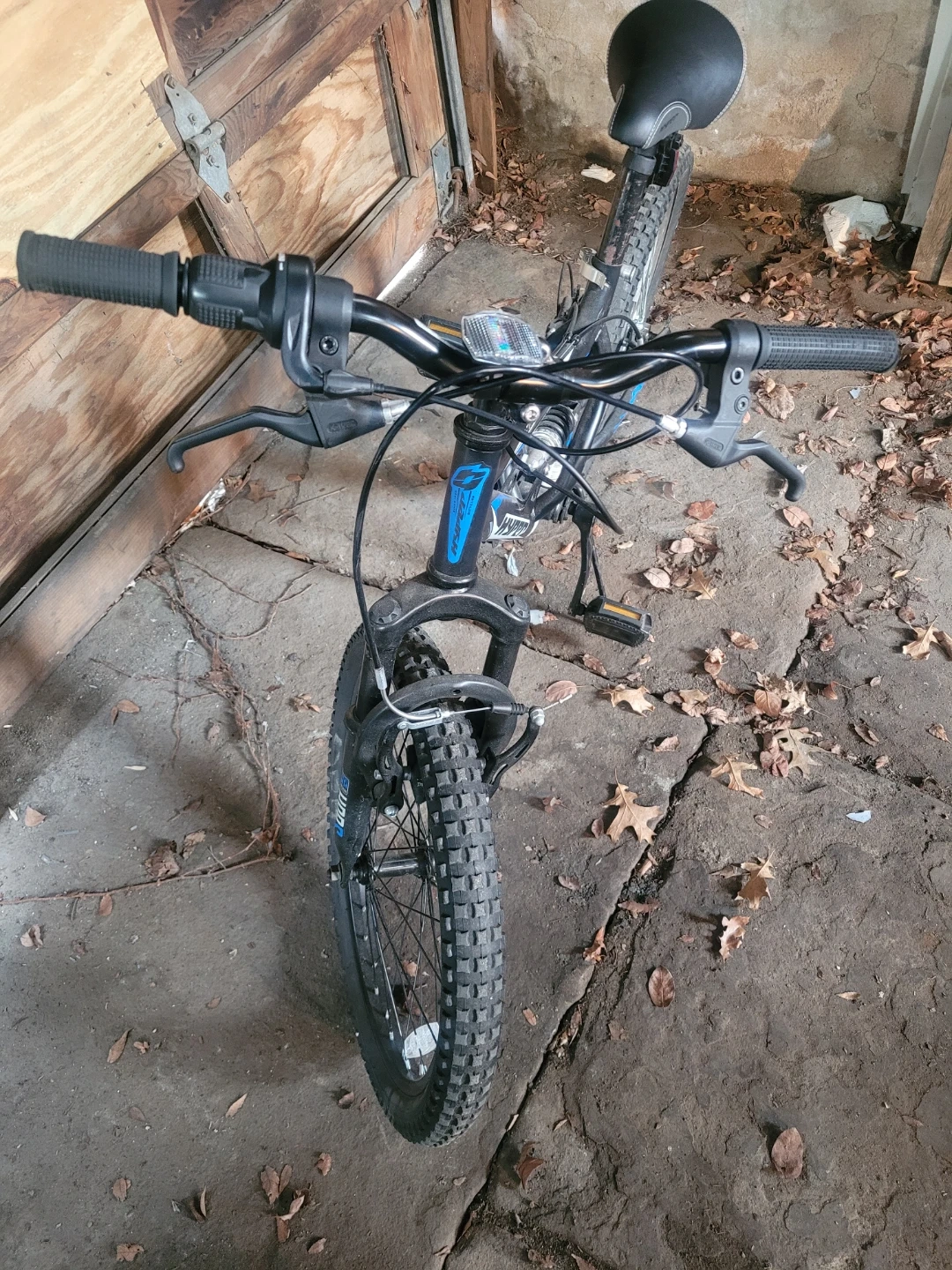 This is a used kids mountain bike with front and rear suspension. It features a multi-speed gear system. The frame is black with blue accents.