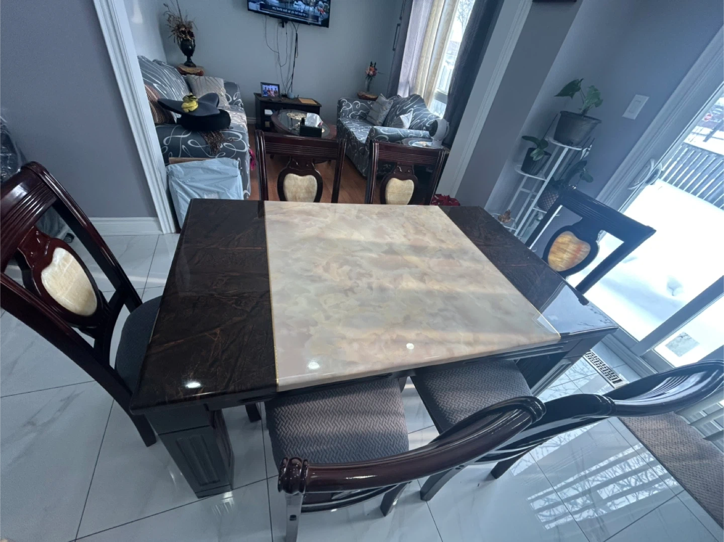 A dining table set featuring a dark wood frame with a marbled top. It comes with six matching chairs upholstered in a dark grey fabric. This set is perfect for family meals or entertaining guests.