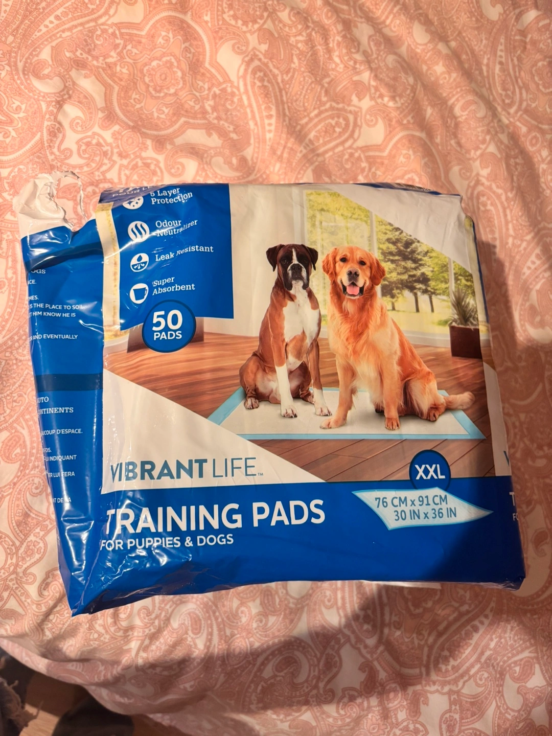 Selling a pack of Vibrant Life training pads for puppies and dogs. These are XXL size, measuring 76 cm x 91 cm (30 in x 36 in). They offer 5-layer protection, are odour neutralizing, leak resistant, and super absorbent. There are about 40 left in the pack.