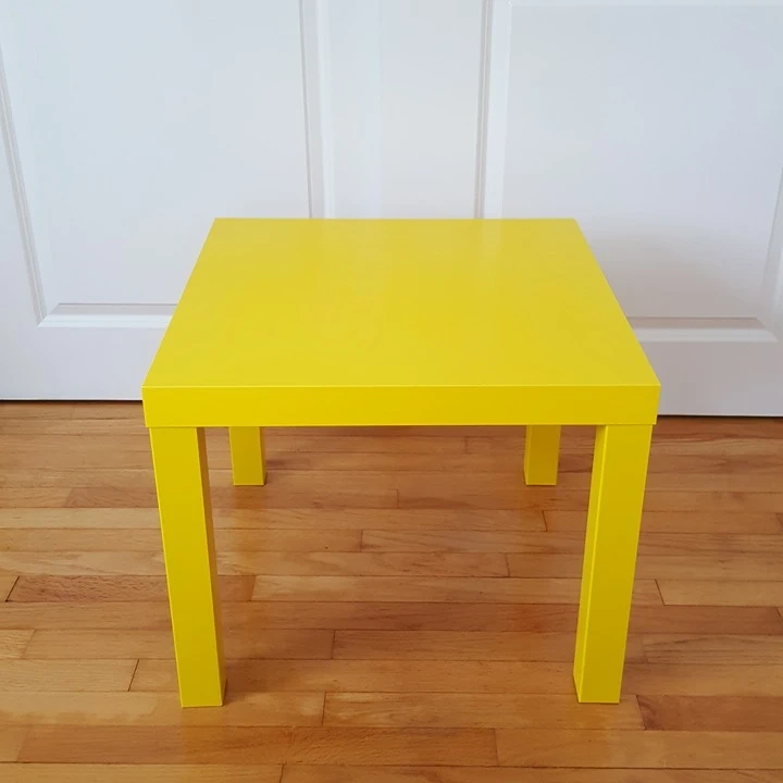 This is a happy bright yellow square side table. It's perfect for holding a drink or a small lamp. The simple design fits in many spaces.