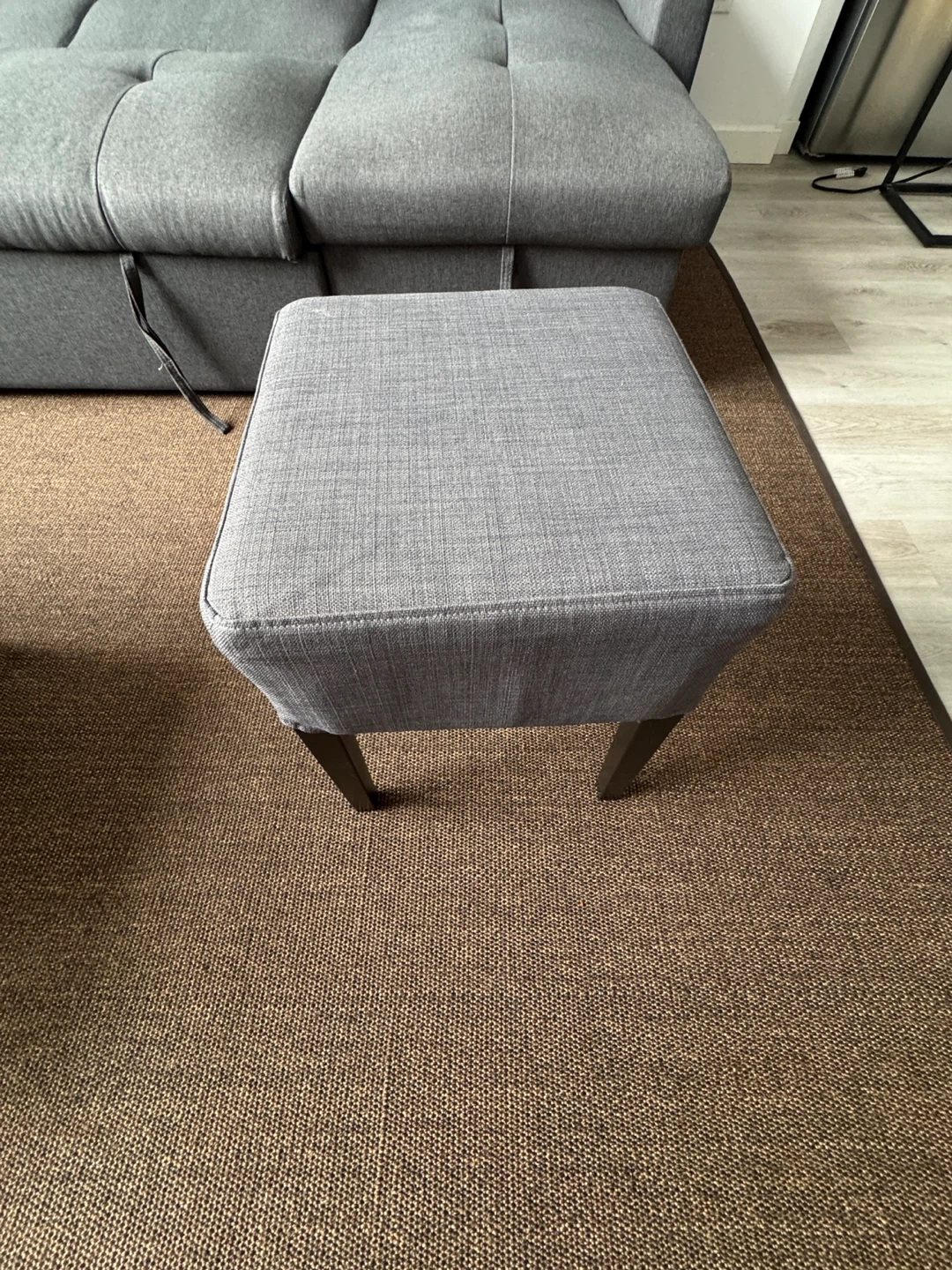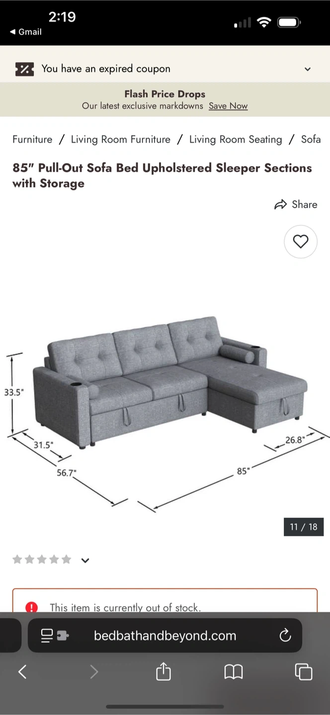 Bed, Bath and Beyond gray sectional sofa that easily converts into a pull-out bed. It's perfect for guests. The sofa features convenient cup holders and hidden storage, making it both functional and stylish. Pillows and blankets can be stored inside. Free ottoman chair included!