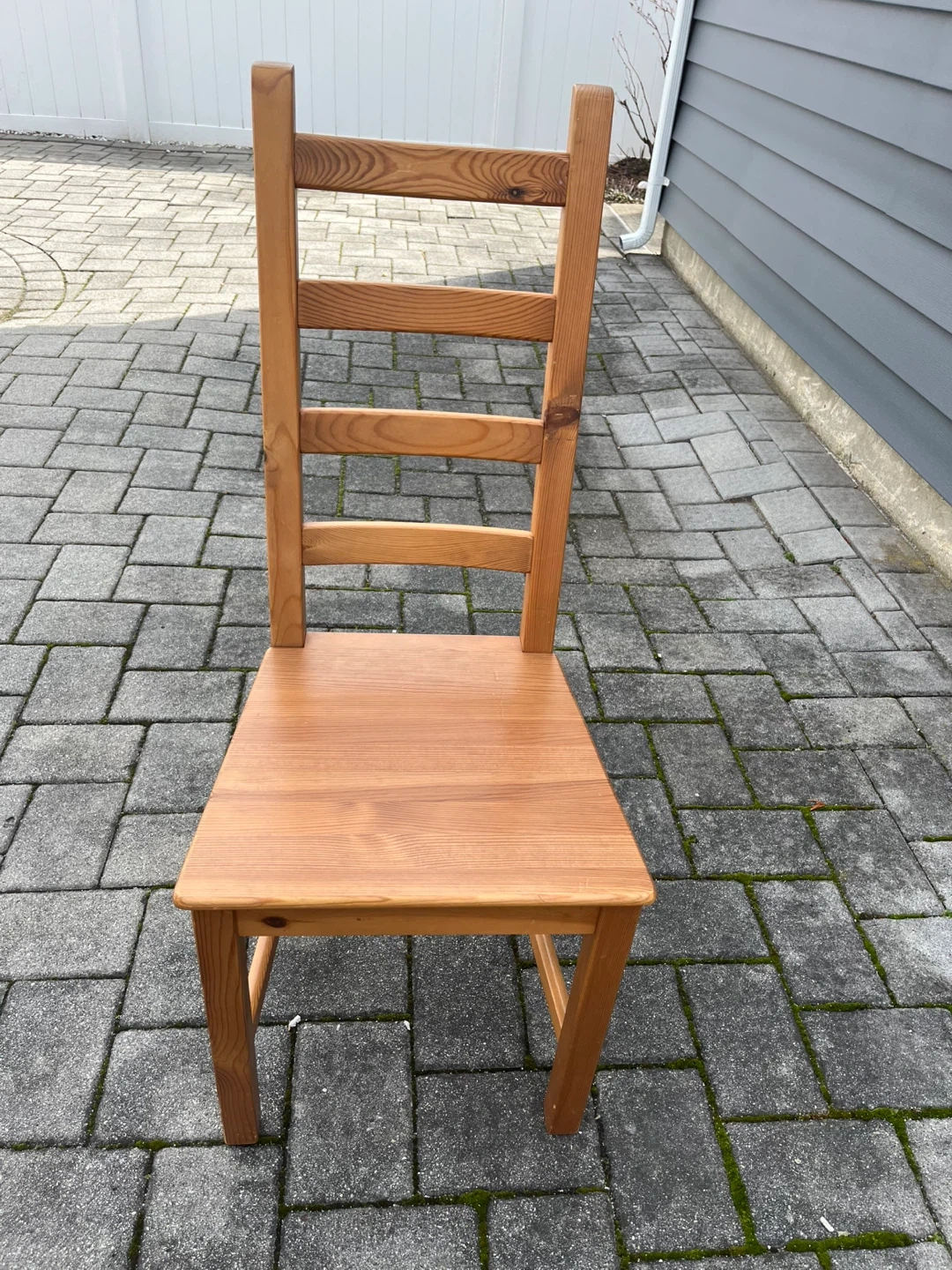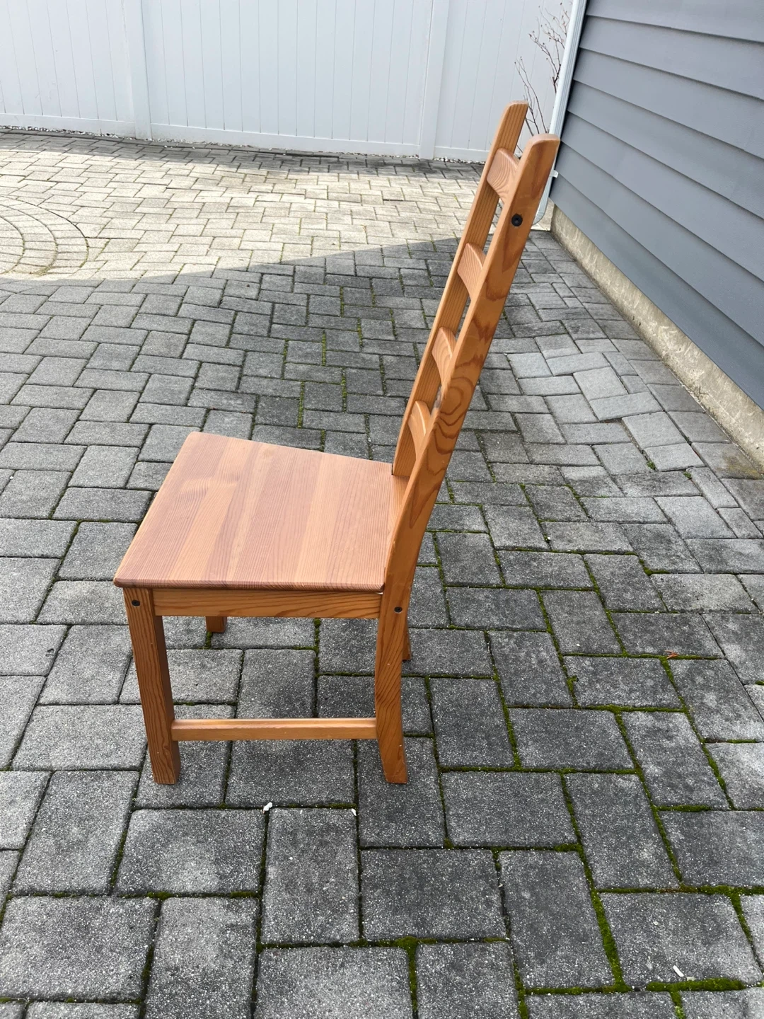 This is a sturdy wooden dining chair. It's made of solid wood with a natural finish. The chair has a slatted backrest for comfort. It's ready for your dining room! 6 chairs $5 each