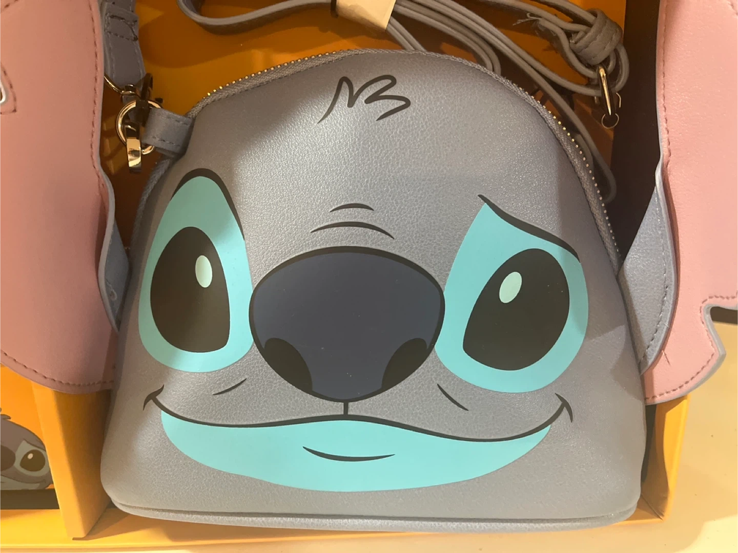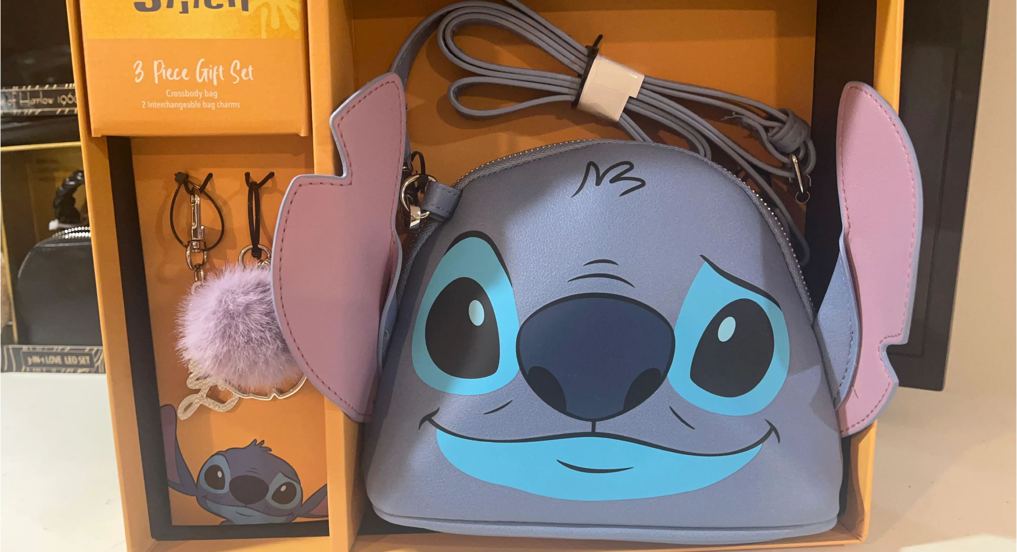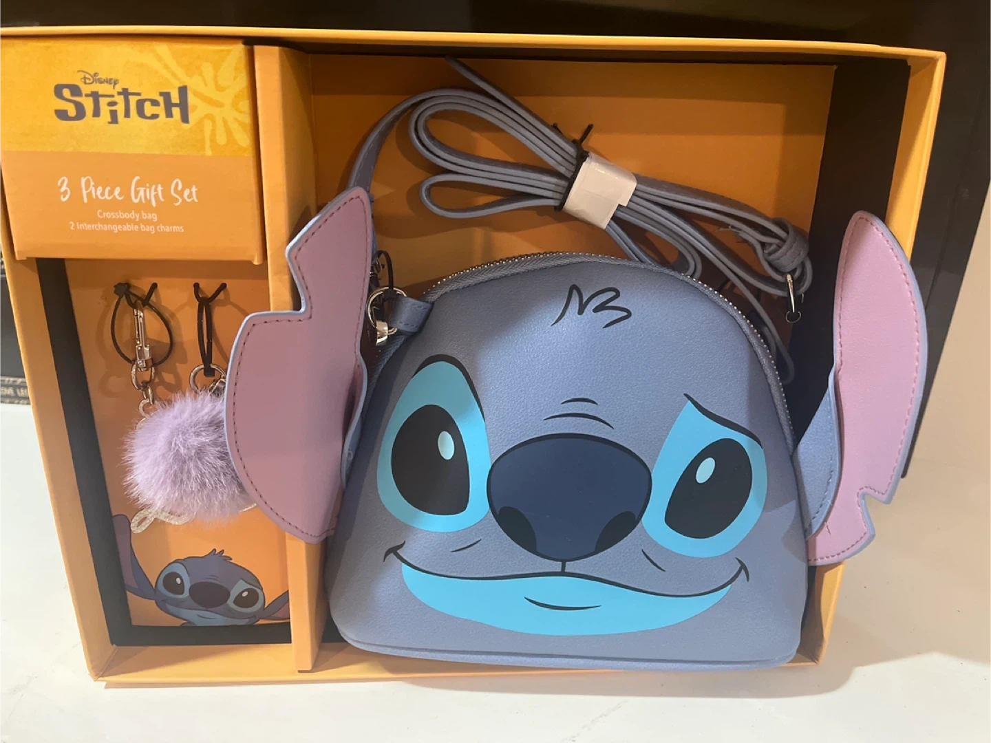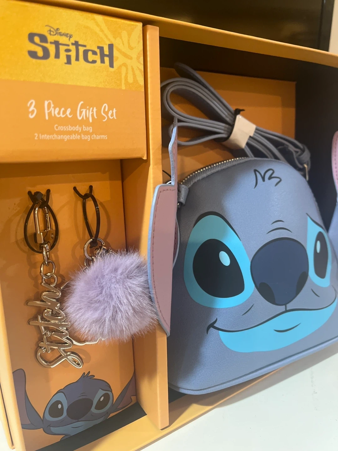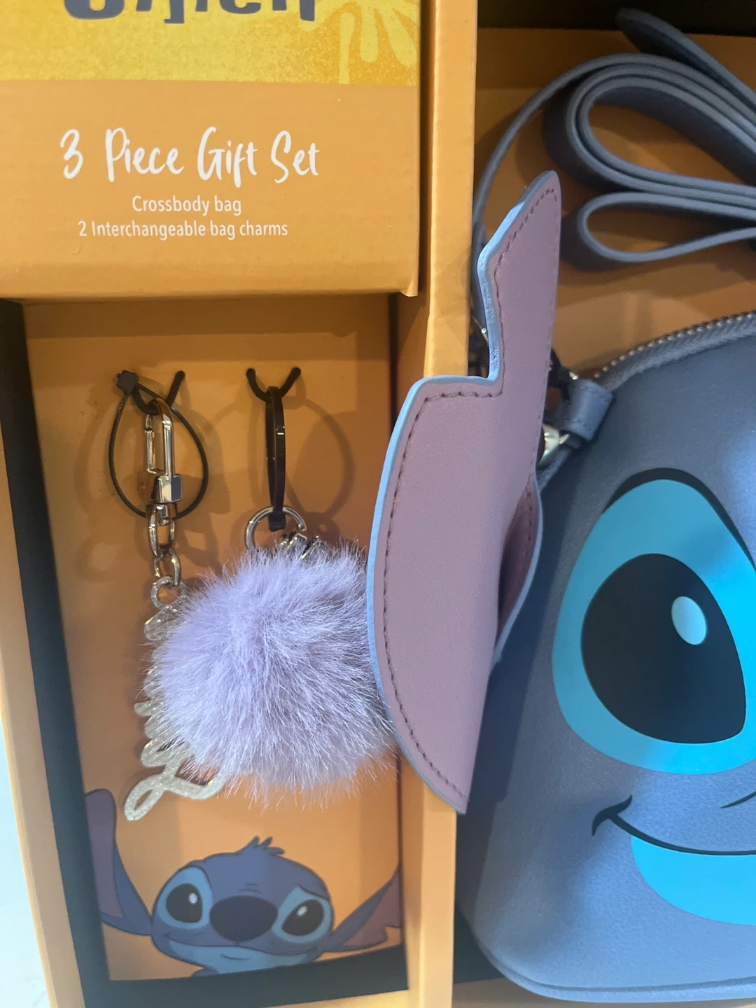 This is a Disney Stitch 3-Piece Gift Set that includes a crossbody bag and two interchangeable bag charms! The bag is a cute light blue with Stitch's face on it. It comes with the original box