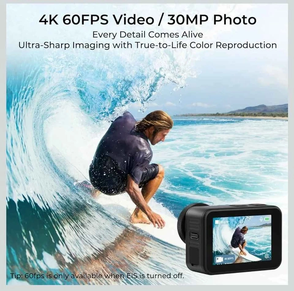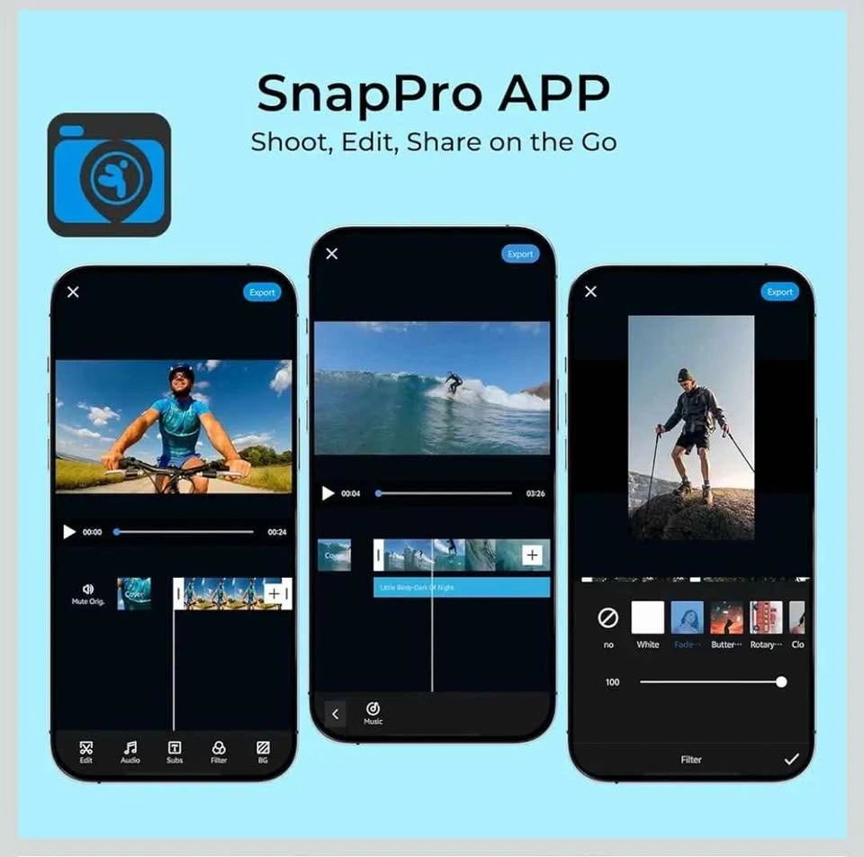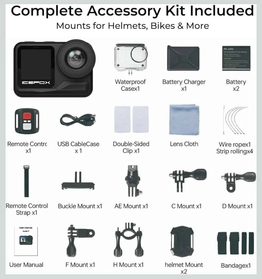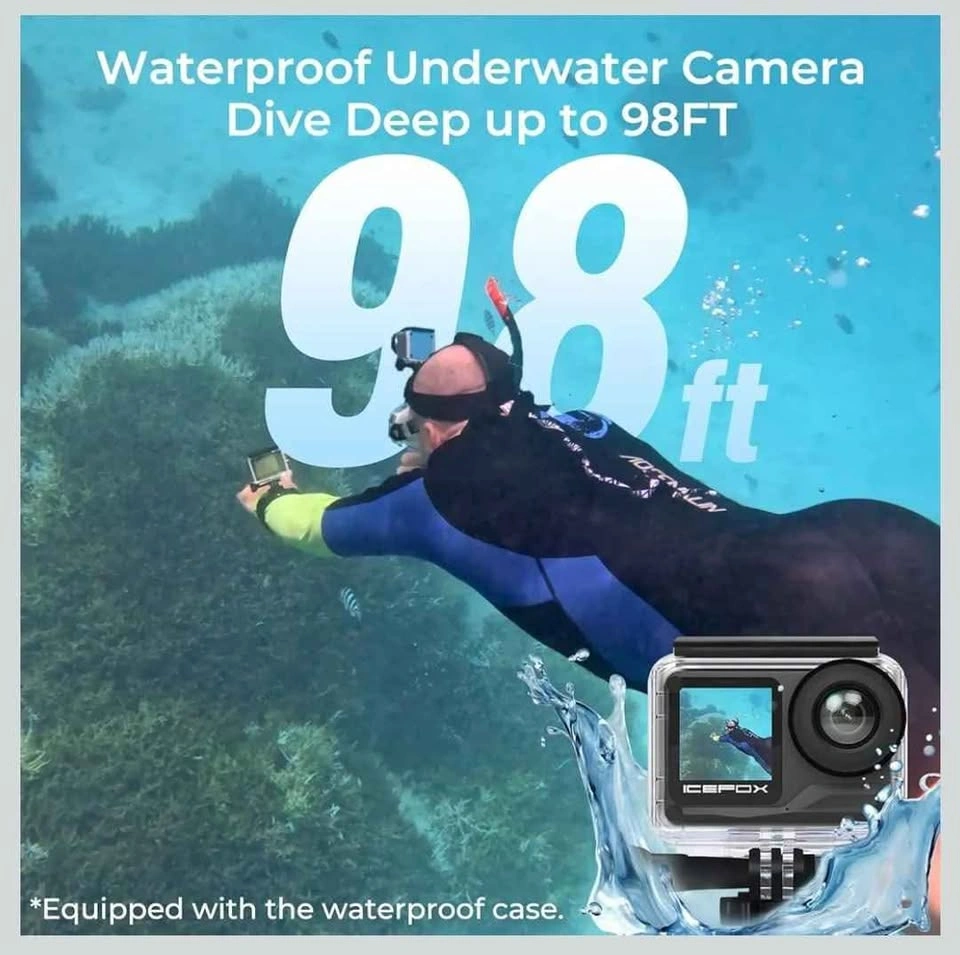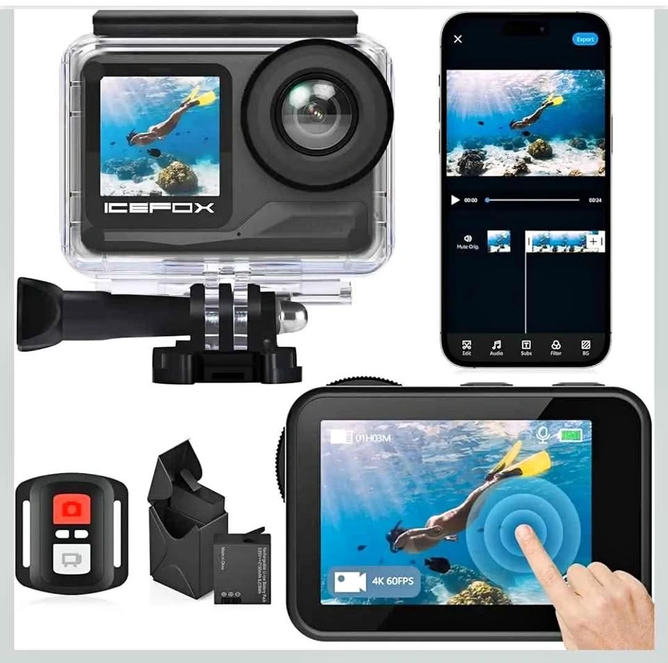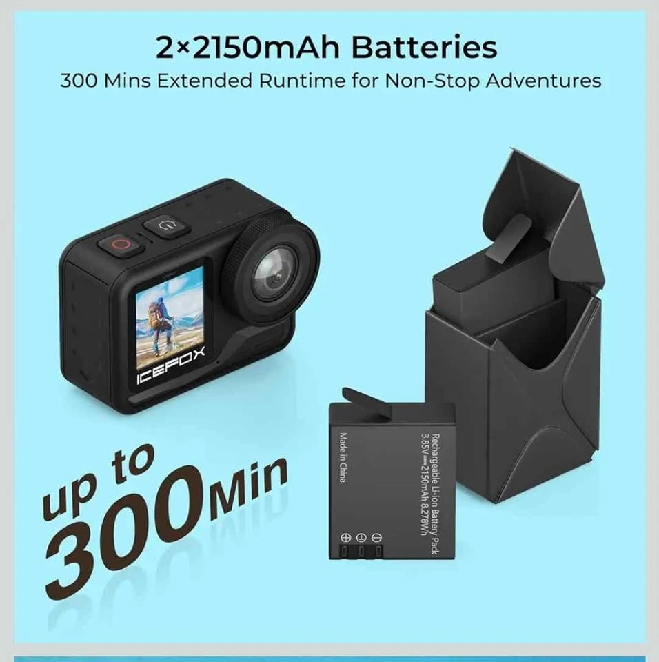 25BRAND NEW icefox i7 Action Camera with 2X 2150mAh Batteries, 5X Zoom, and WiFi Remote Control. It's also waterproof and supports video & photo editing. Powered by Snappro App. icefox i7 action camera, 4K 60FPS action cam, 30MP sports camera, underwater action camera, waterproof camera, EIS stabilization camera, WiFi action camera, Snappro app camera, video and photo editing camera, 5X zoom action cam, action camera with remote control, rechargeable action cam, action camera with 2 batteries, travel action camera, extreme sports camera, helmet camera, biking camera, surfing camera, compact 4K camera, outdoor adventure camera
