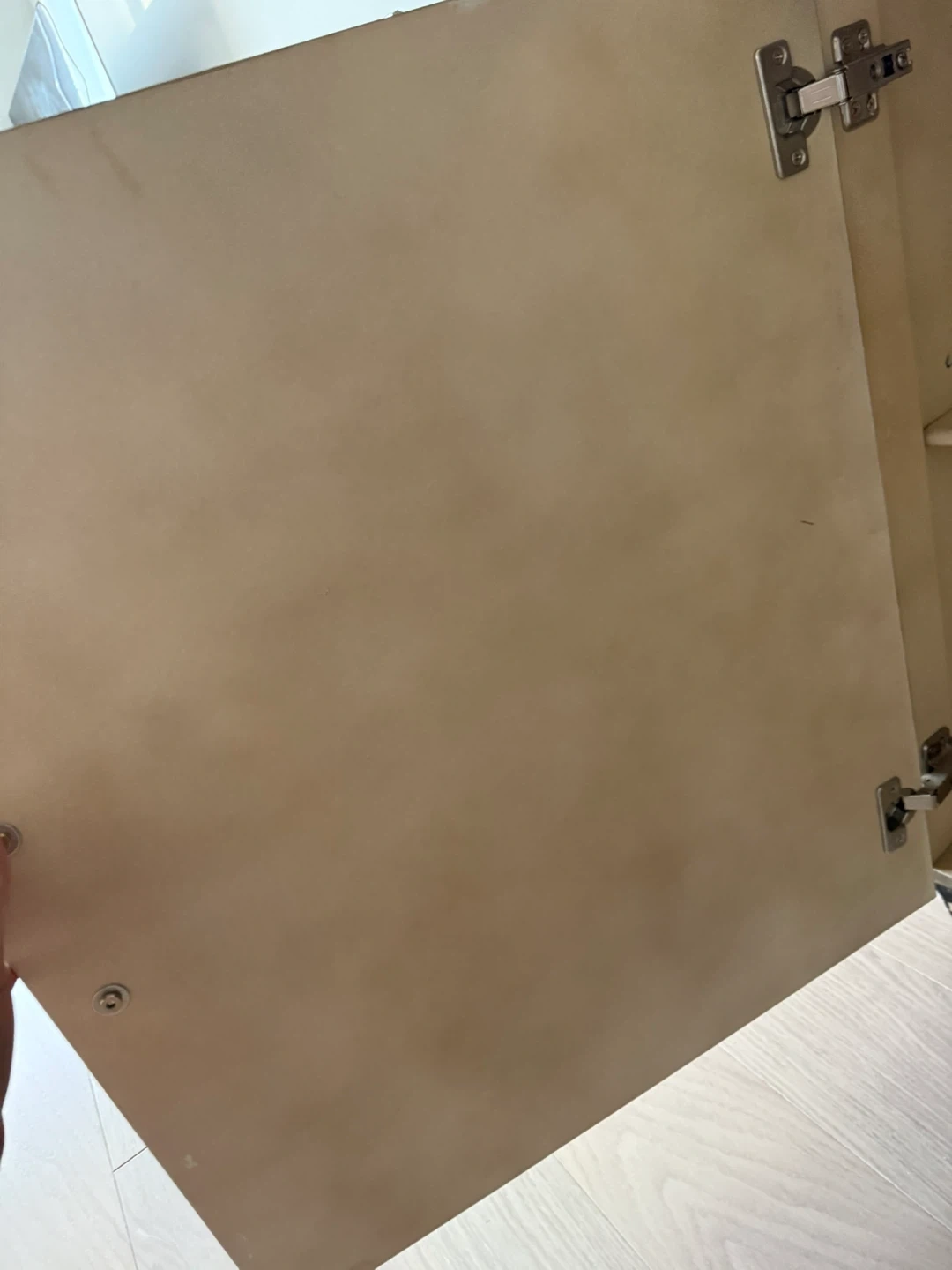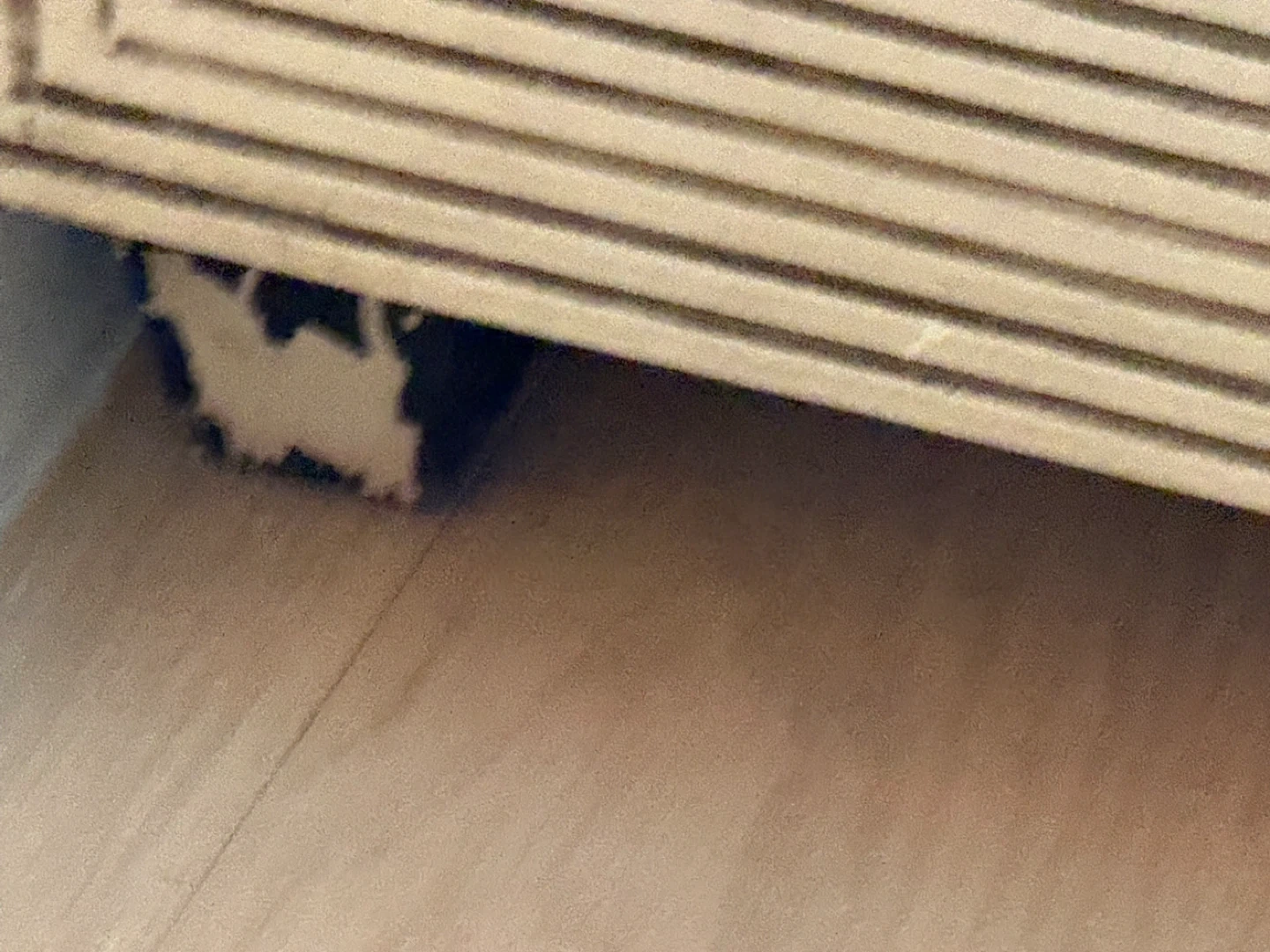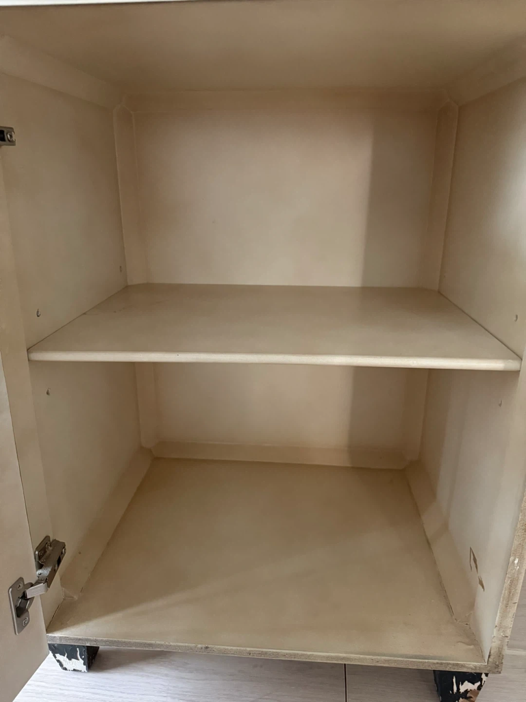 Gorgeous Wooden cabinet with a unique geometric line pattern on the front. Features a single door with a black handle. Interior storage space. Legs are peeling and deteriorating badly but you could buy replacement legs on Amazon for under $15. The door also needs adjusting.