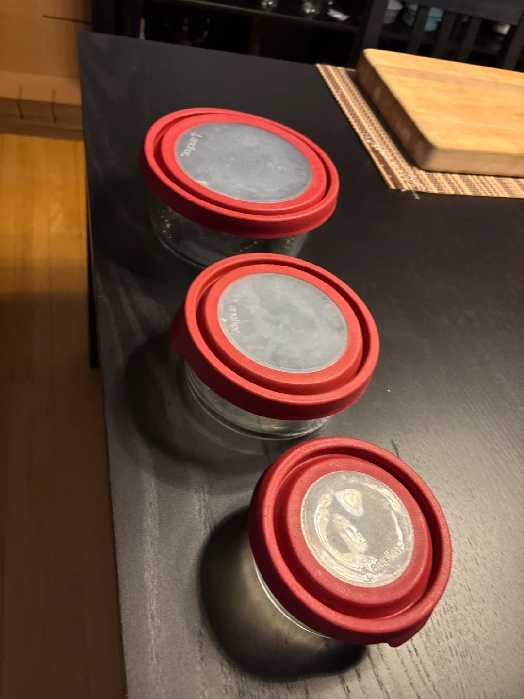 Set of three Anchor Hocking glass storage jars with red lids. Clear glass bodies. They're great for storing dry goods or leftovers.