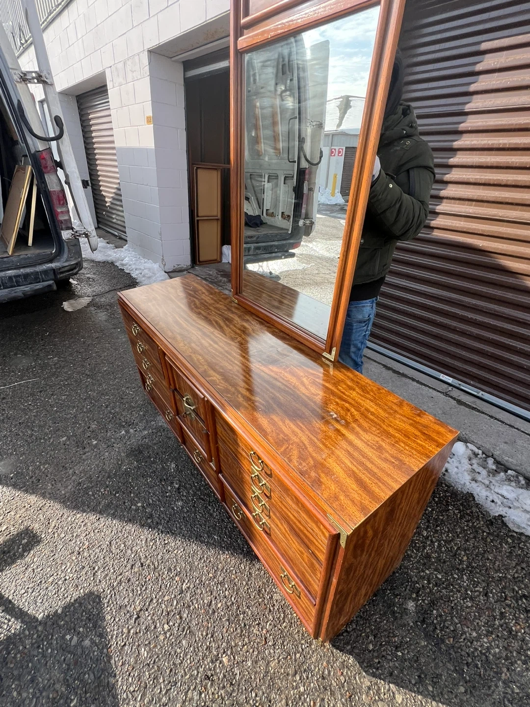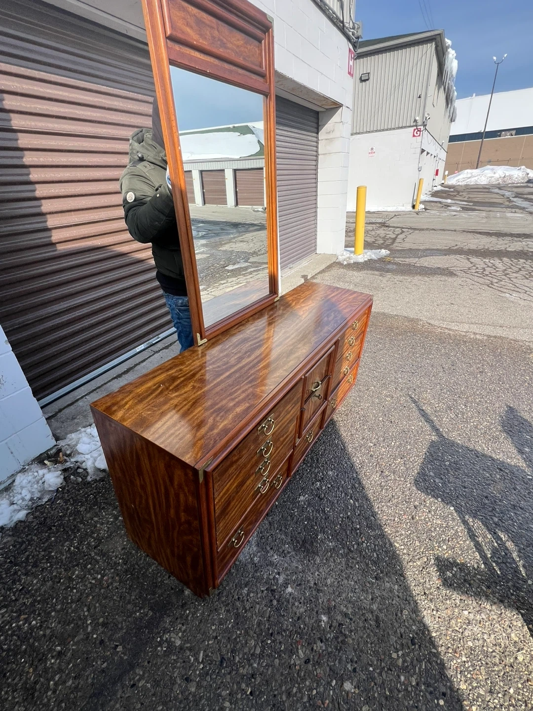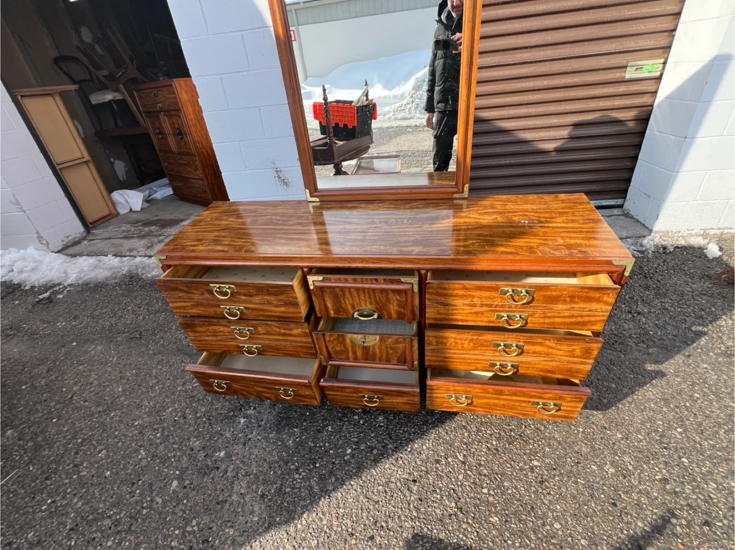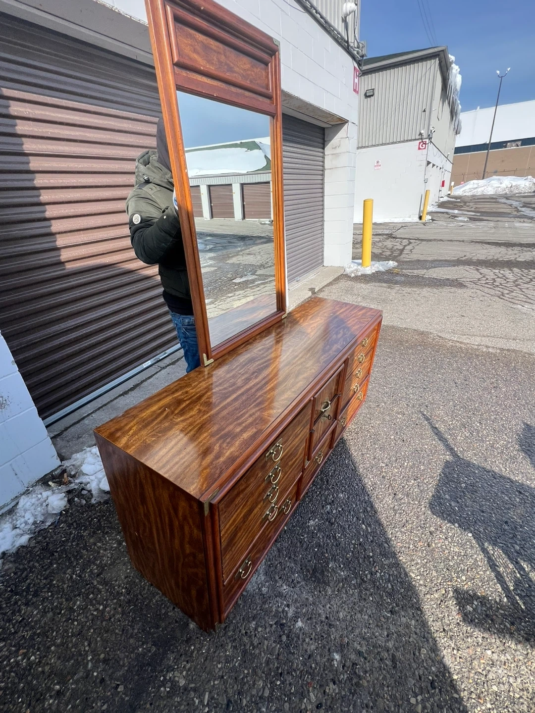 This is a beautiful used wooden dresser with a matching mirror. It's got lots of drawer space for all your storage needs. The wood finish is rich and warm. It's a classic piece that'll add style to any bedroom!