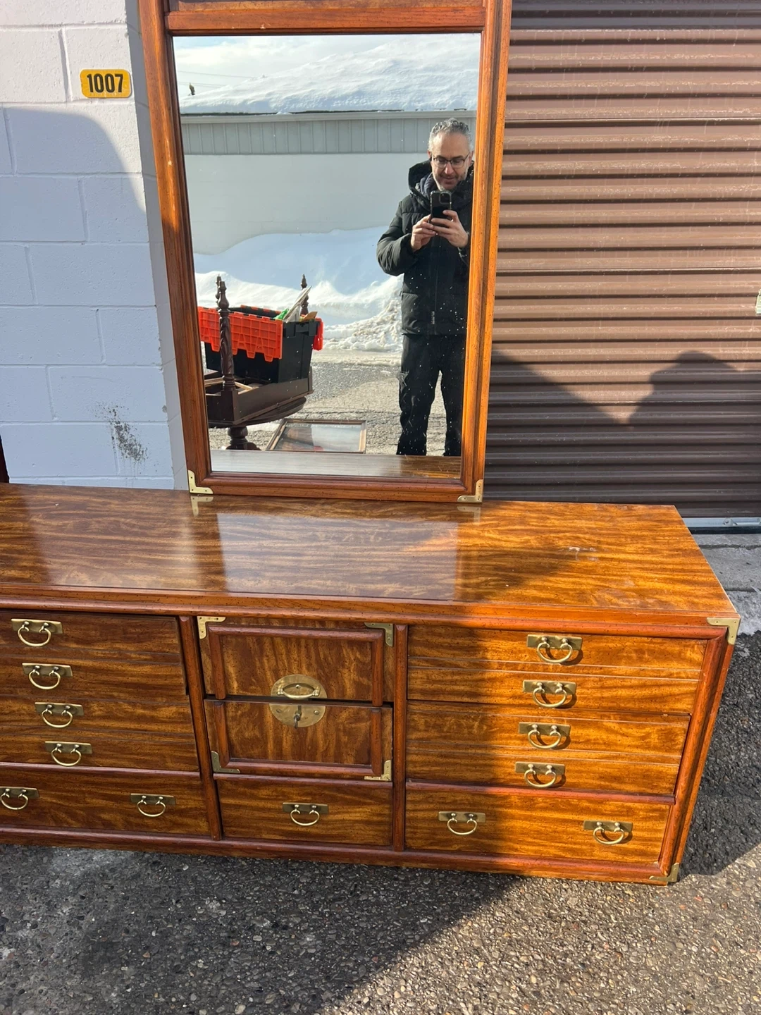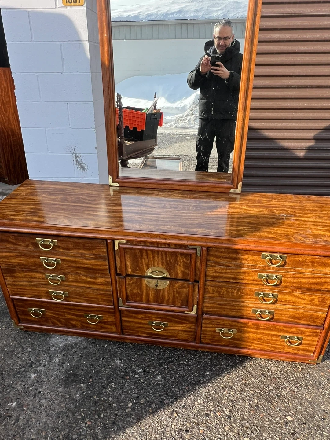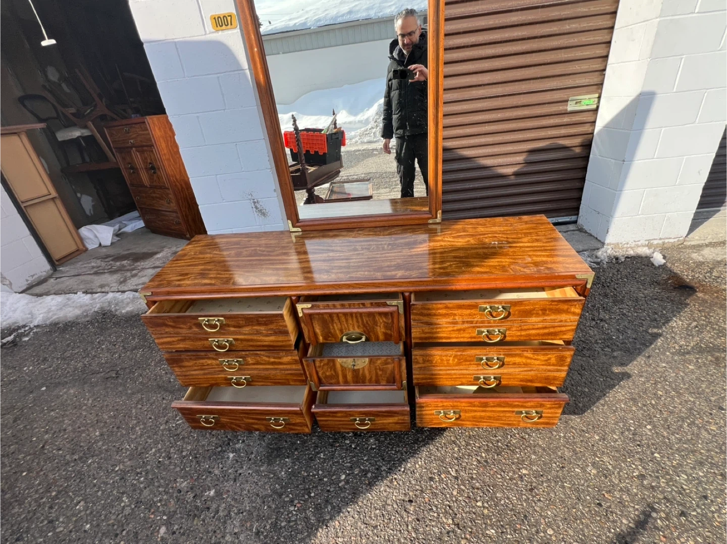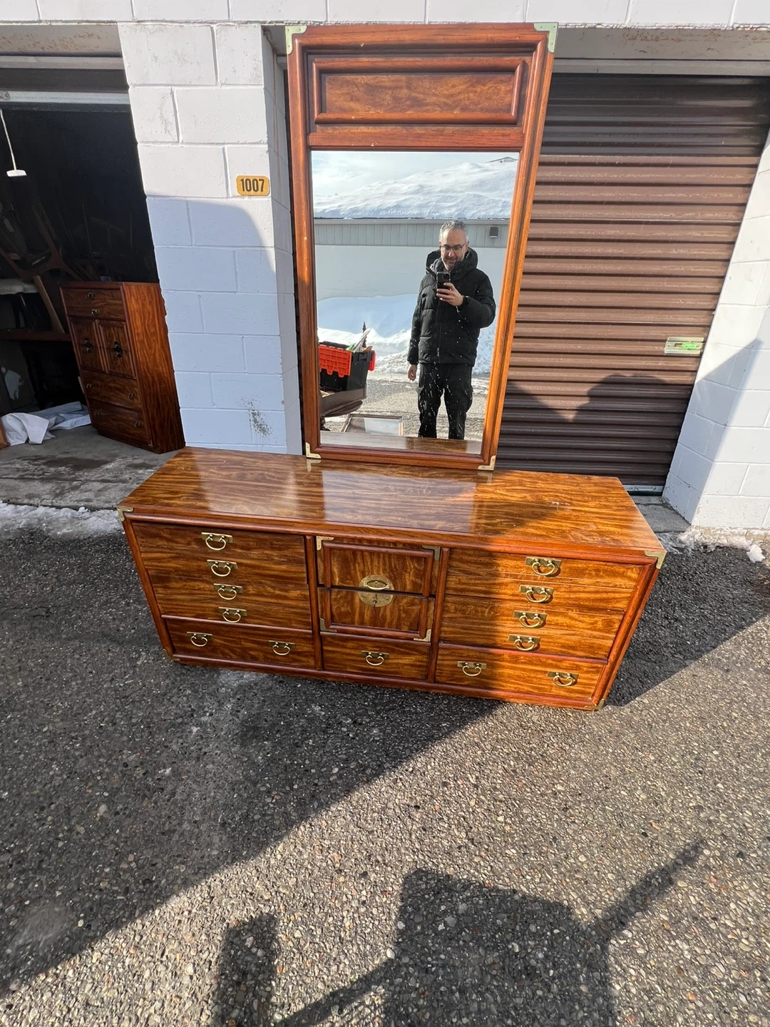 This is a beautiful used wooden dresser with a matching mirror. It's got lots of drawer space for all your storage needs. The wood finish is rich and warm. It's a classic piece that'll add style to any bedroom!