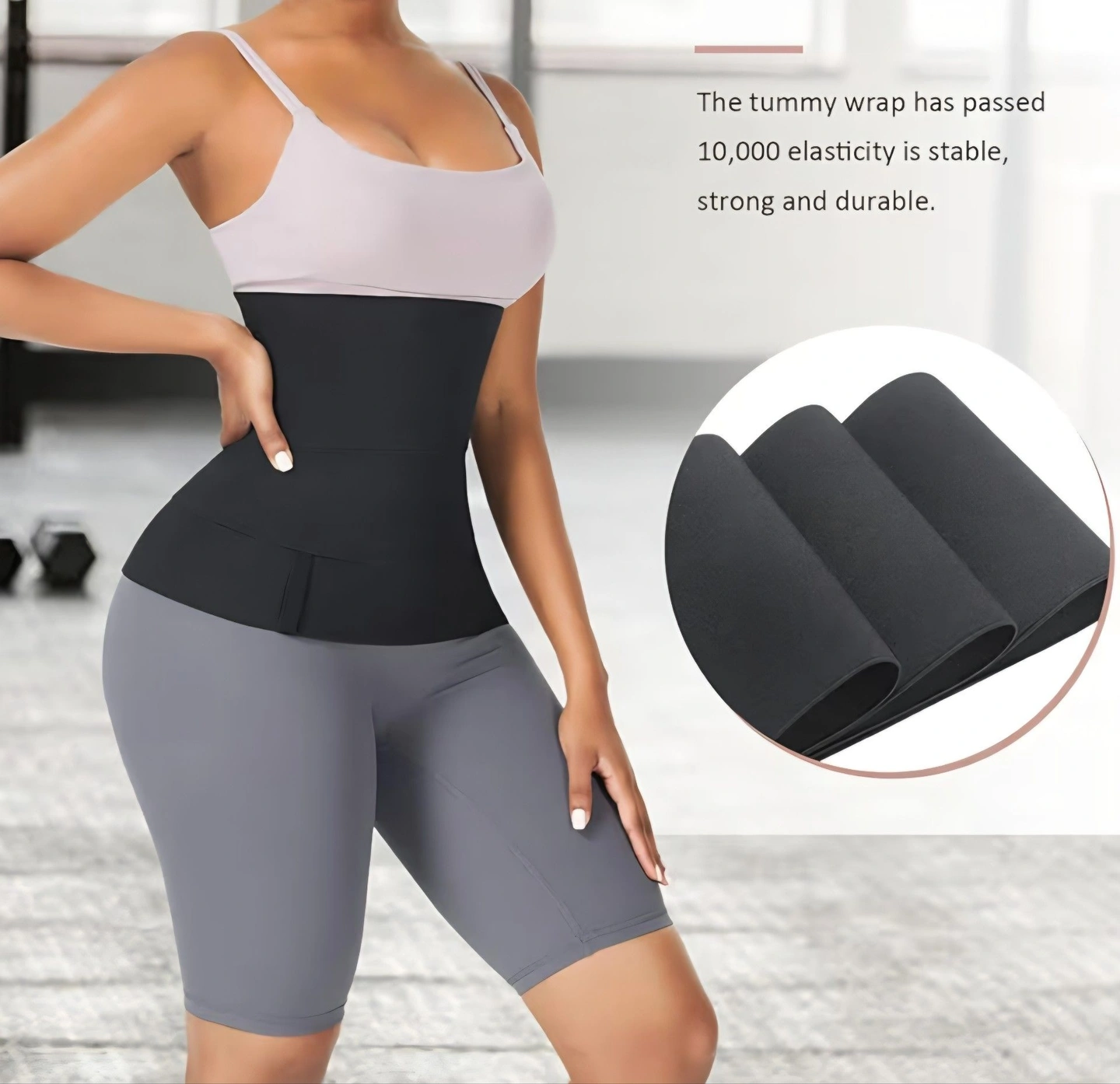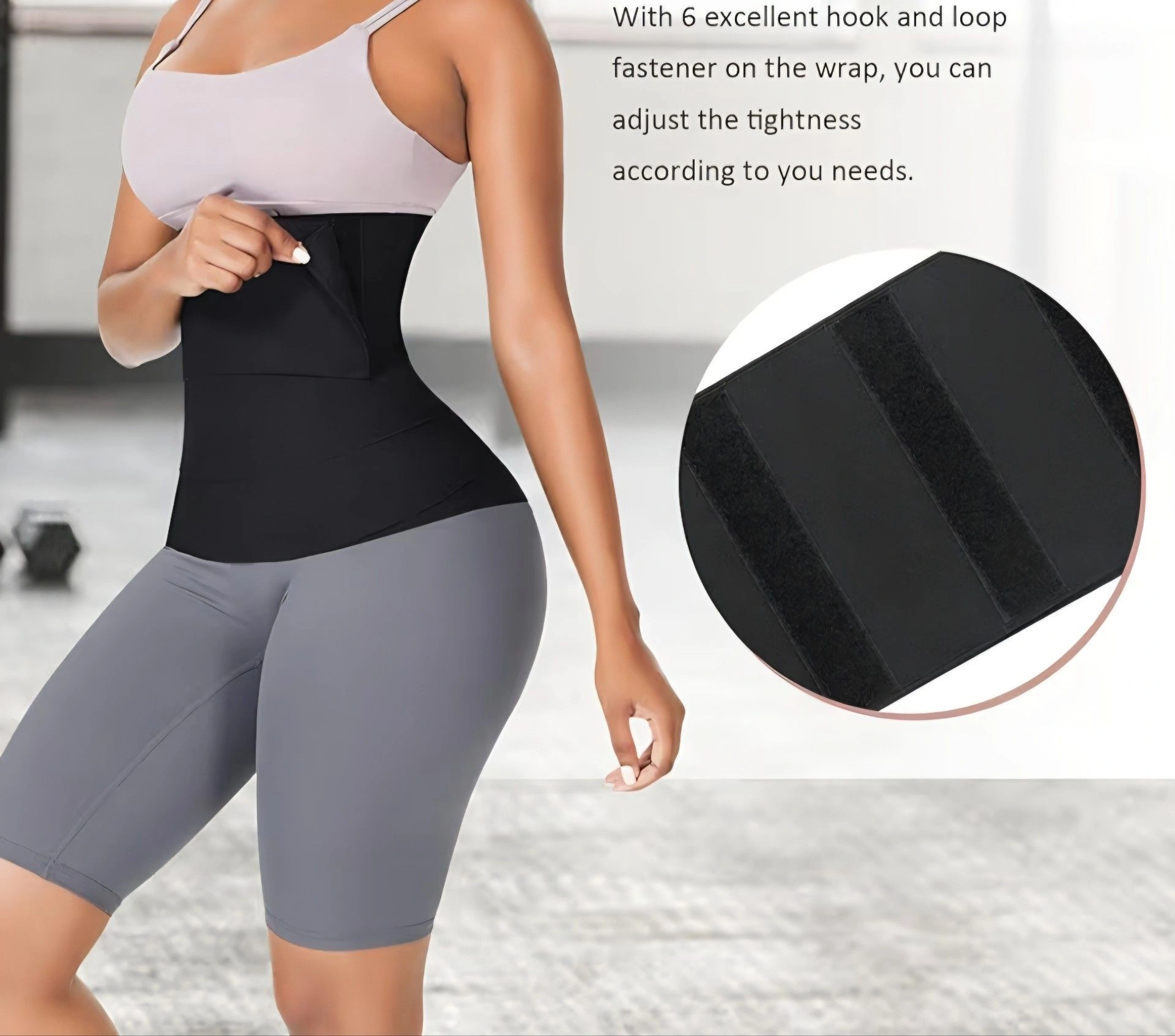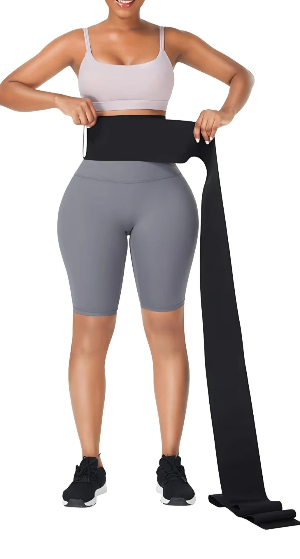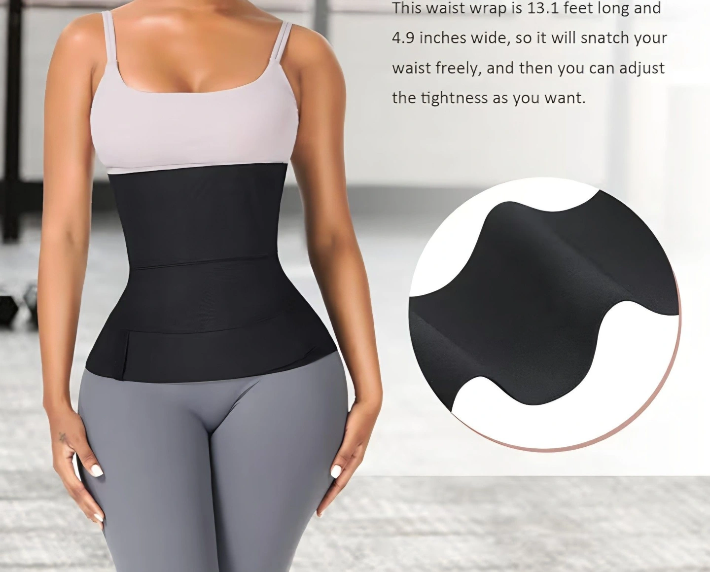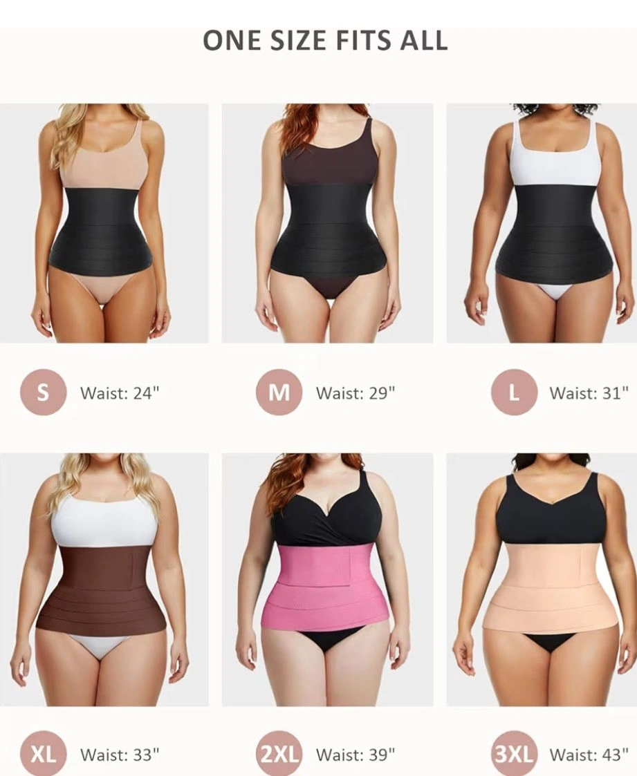 Waist trainer band for women. Features a bandage wrap design for adjustable compression. Suitable for long torsos and helps shape the belly area.