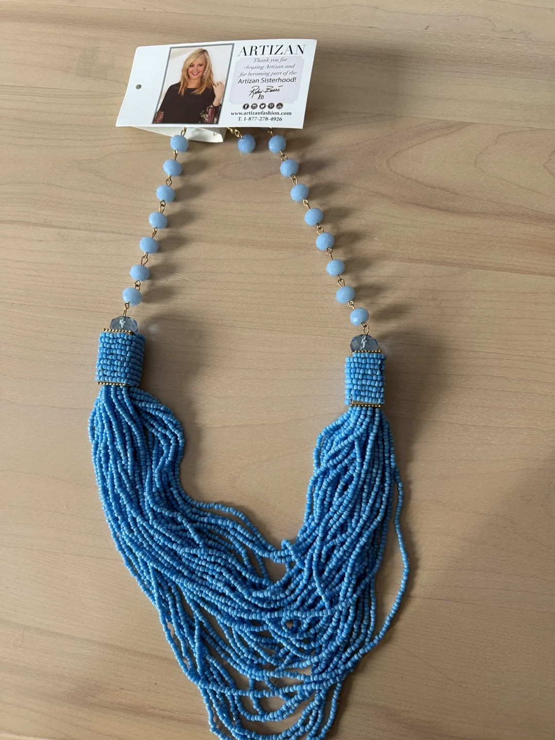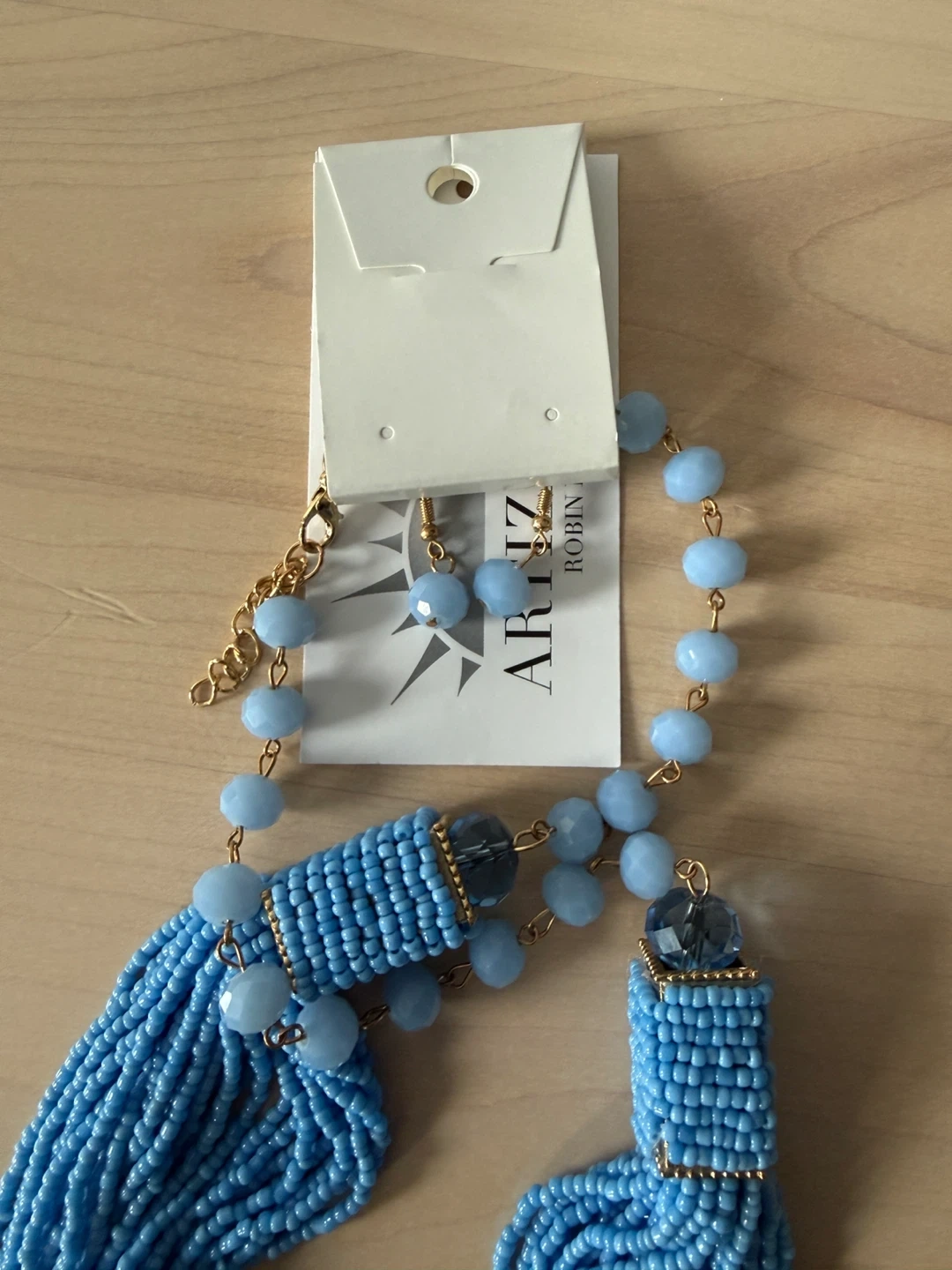 This is a blue beaded tassel necklace with gold-tone accents. It features multiple strands of small blue beads cascading down. The necklace comes with matching dangle earrings. Great for adding a pop of colour to any outfit!
