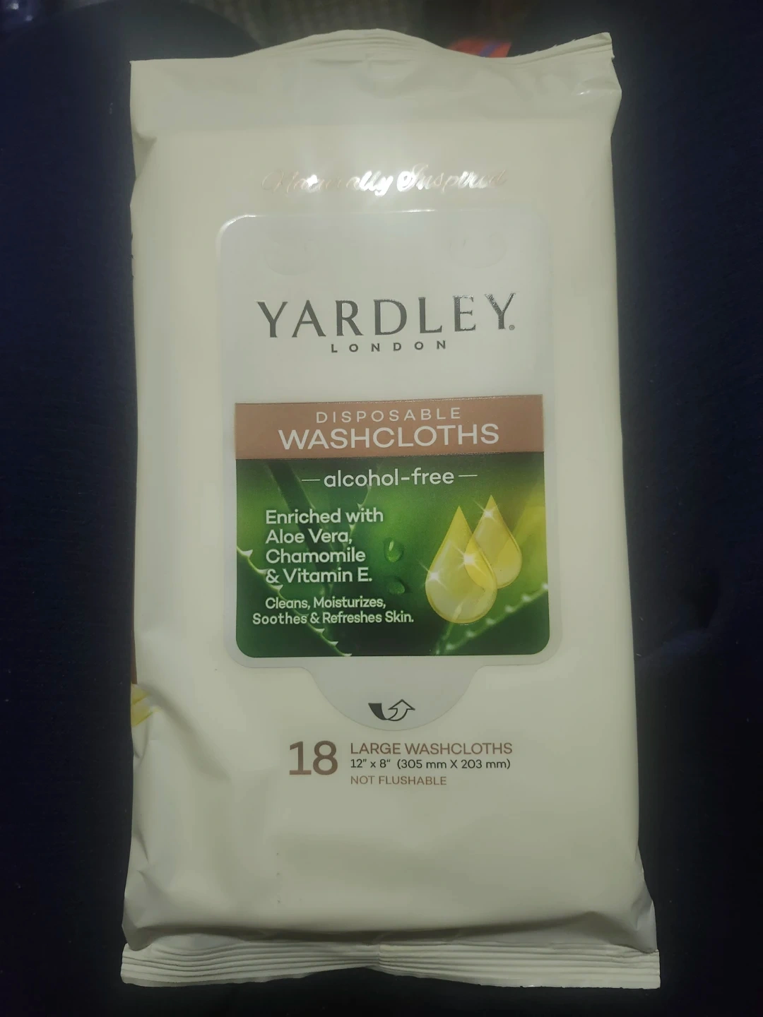 Yardley London alcohol-free disposable washcloths. Enriched with Aloe Vera, Chamomile & Vitamin E. These large washcloths measure 12" x 8". Cleans, moisturizes, soothes & refreshes skin.
