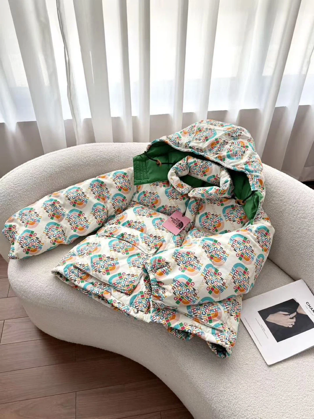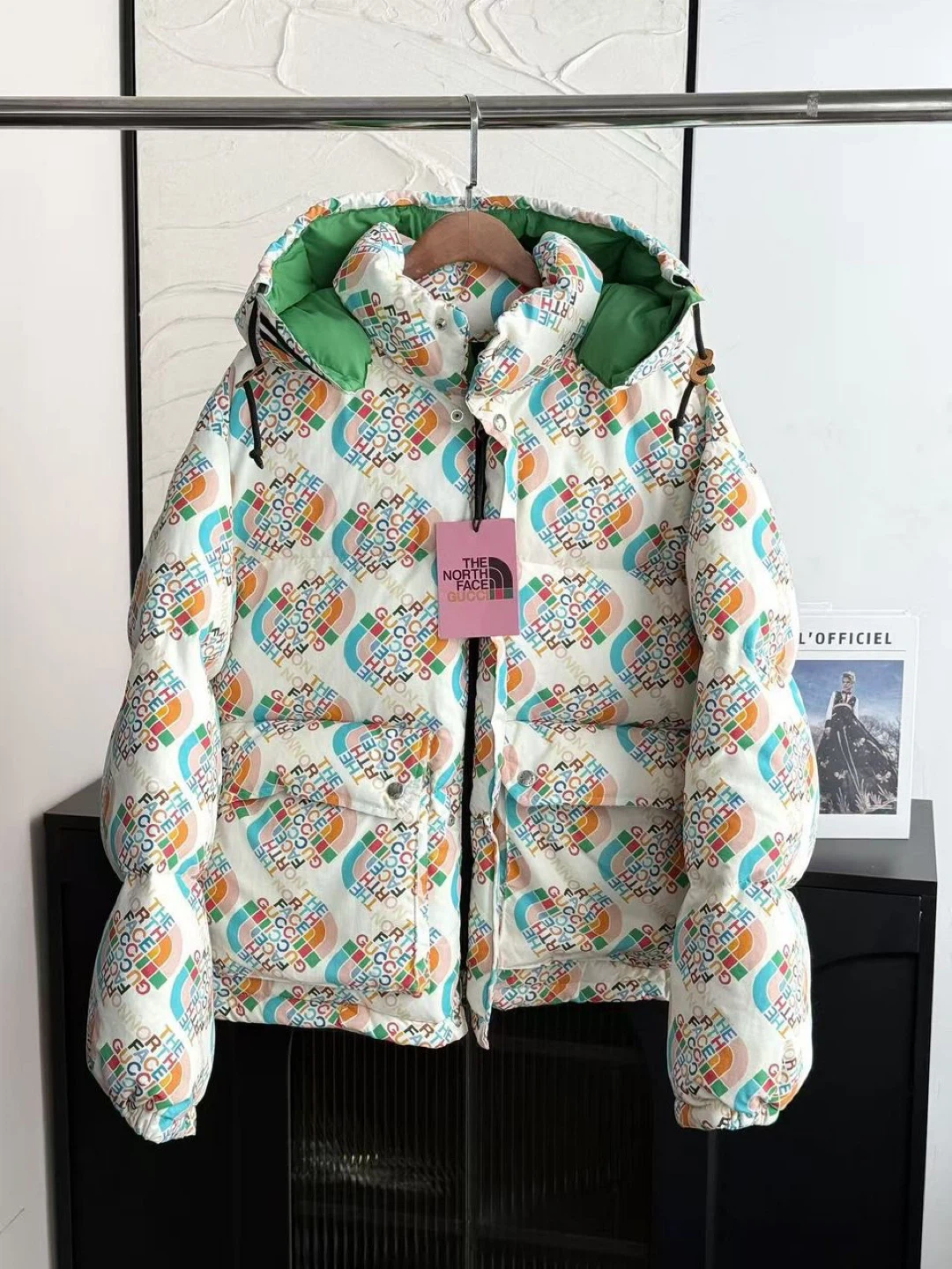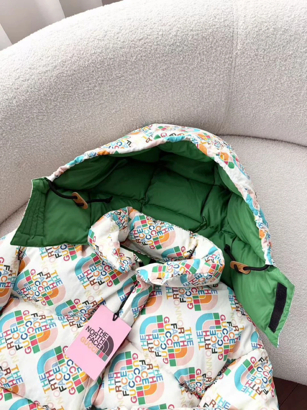 A vibrant puffer jacket featuring the iconic Gucci and The North Face collaboration logo print. It has a full zip closure, a green lining, and adjustable features at the hood and hem. This jacket offers warmth and bold style!