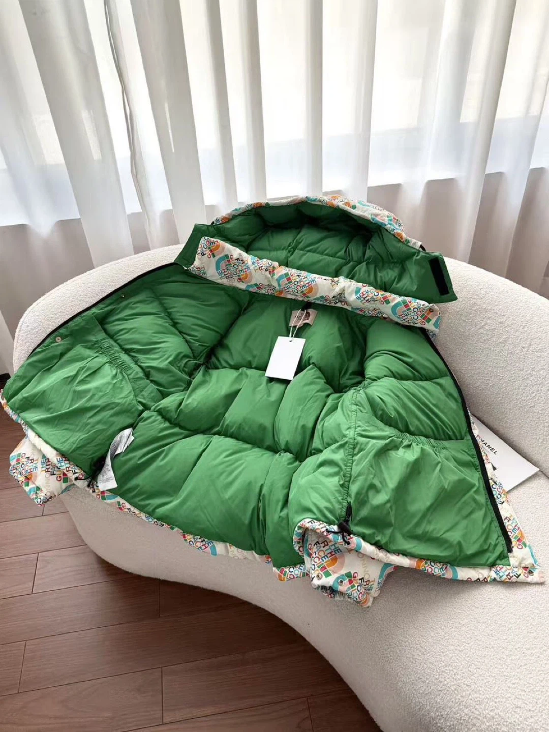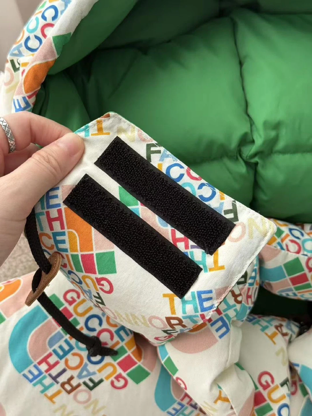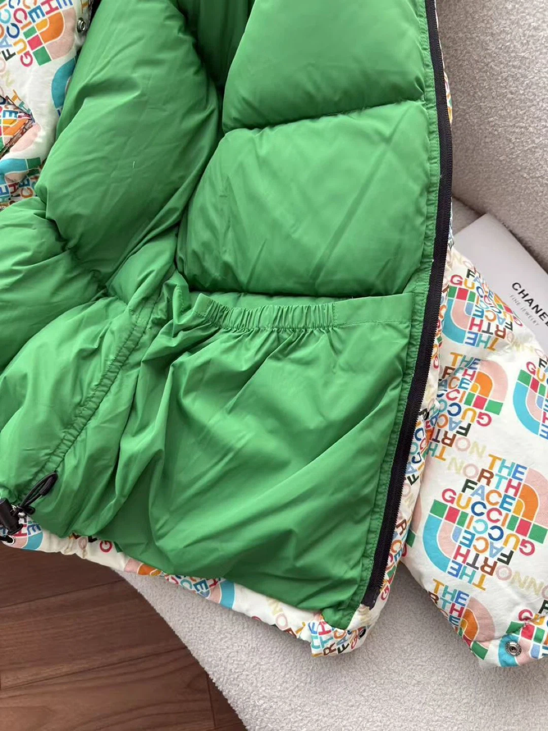 A vibrant puffer jacket featuring the iconic Gucci and The North Face collaboration logo print. It has a full zip closure, a green lining, and adjustable features at the hood and hem. This jacket offers warmth and bold style!
