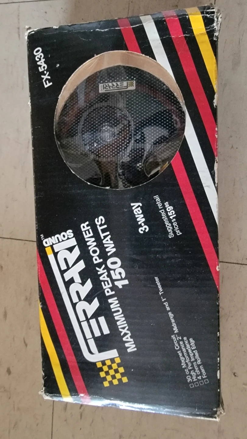 Selling a FERRI Sound 3-Way speaker, model FX-5430. It has a maximum peak power of 150 watts. The box includes details about the speaker's features, such as a 3.0 oz magnet circuit, high performance, and foam rounded edge. The suggested retail price was $159!