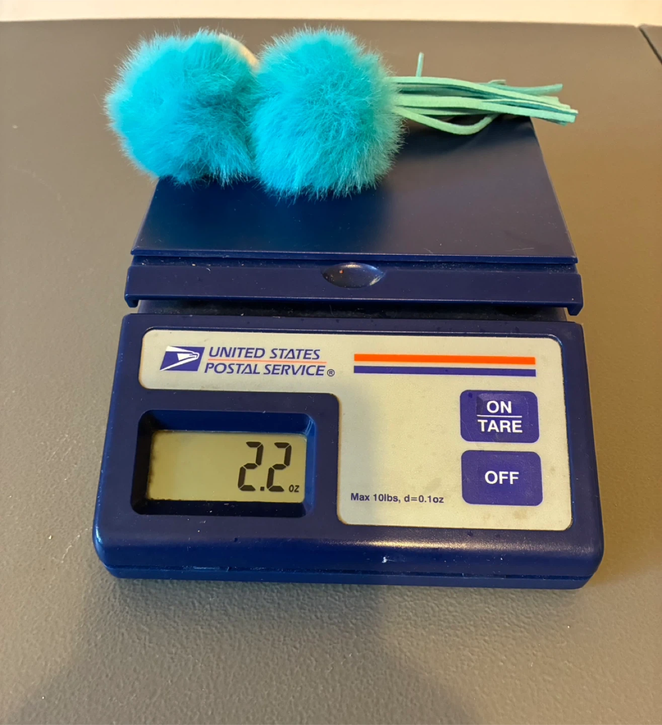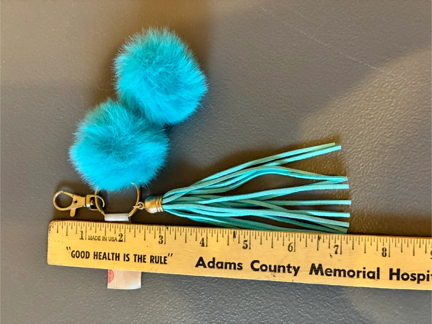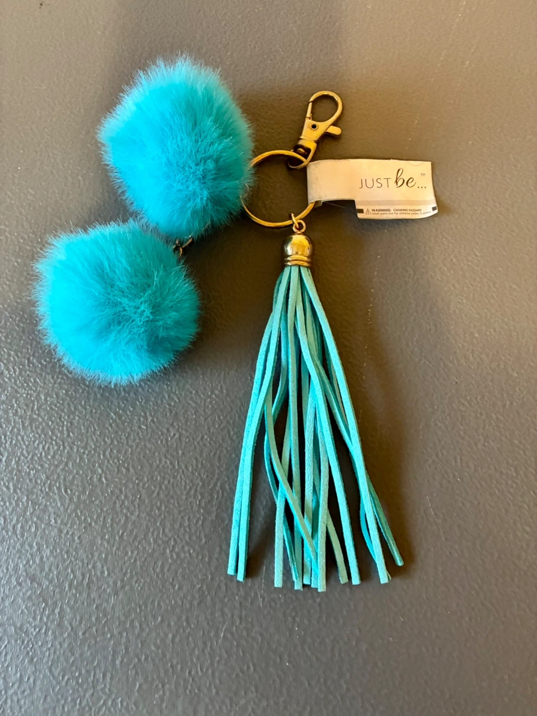 This keychain features two teal faux fur pom poms and a matching tassel. It includes a gold-tone clasp for easy attachment. Faux fur and faux suede materials.