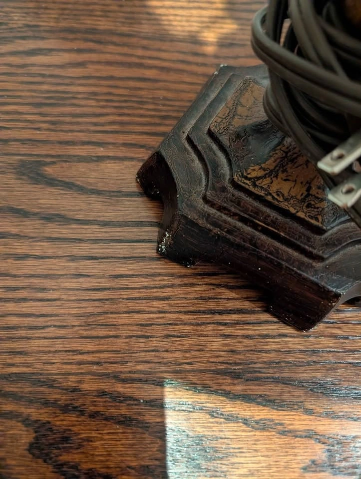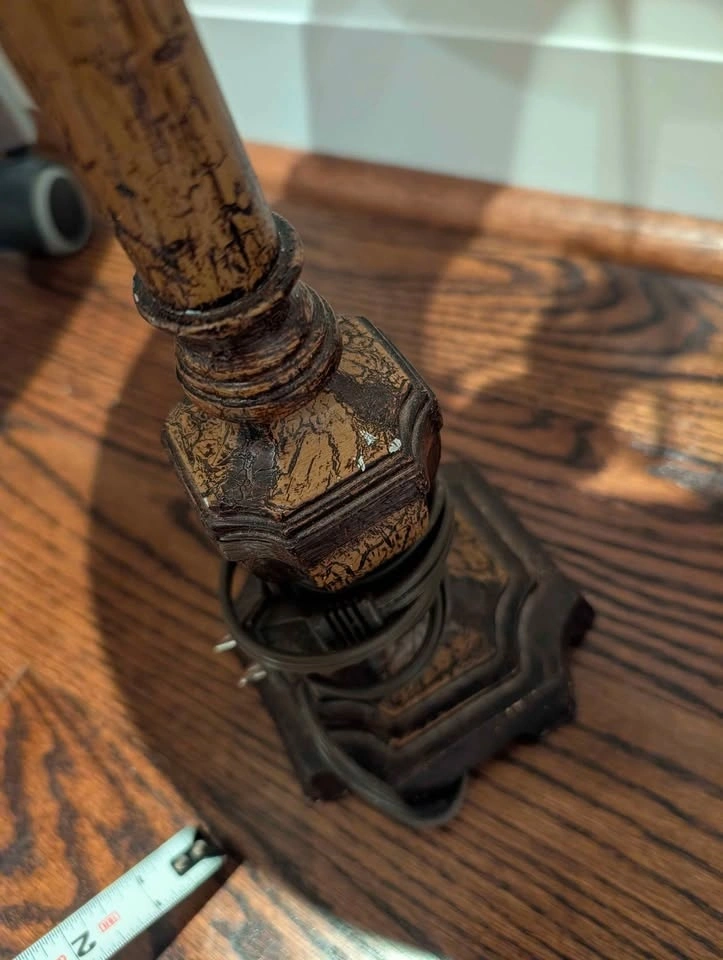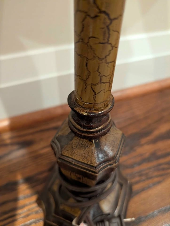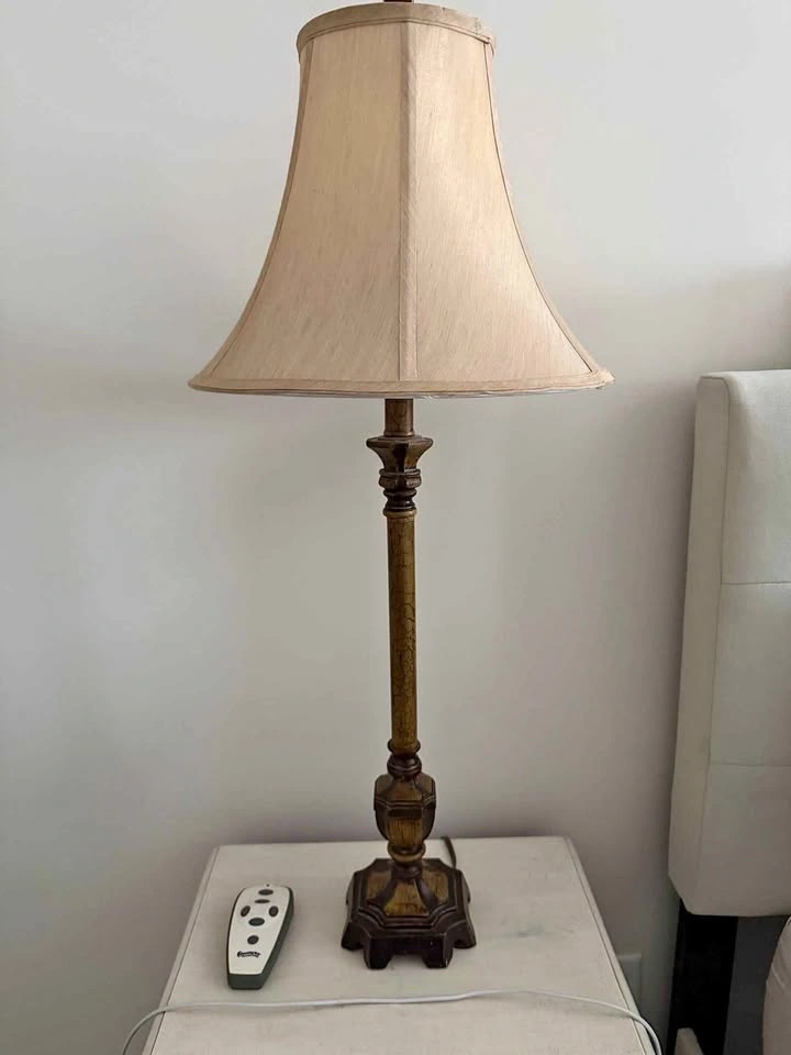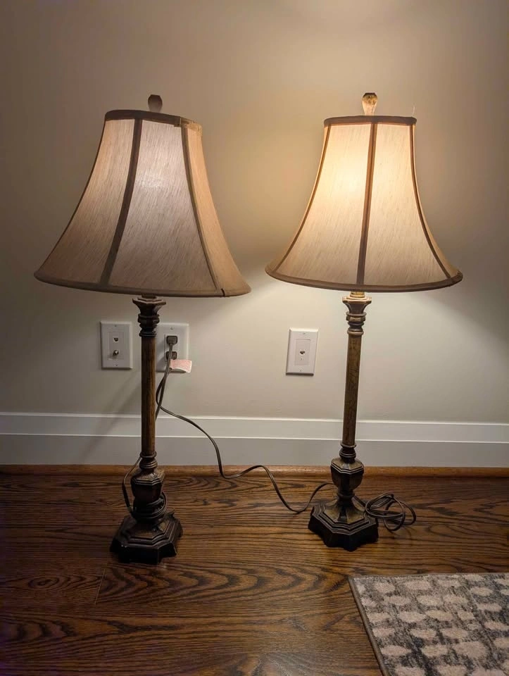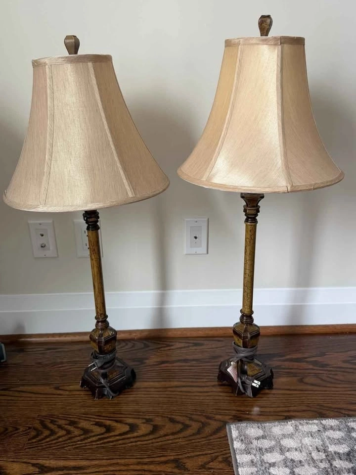 Matching pair of classic vintage-style table lamps with turned wood-style bases and cream raw silk-style shades. Warm wood tones and textured shades give off a soft, ambient glow. Timeless silhouette that suits traditional spaces or adds warmth and contrast to more minimal interiors. • 32” high • Shade: 14.5” wide • Base: 5” wide • Standard Type “A” bulb (60W max) • Sold as a pair Fully functional, with minor cosmetic wear on base corners (see photos). Picking up near St. Clair West & Oakwood or Allen Rd & Eglinton West.