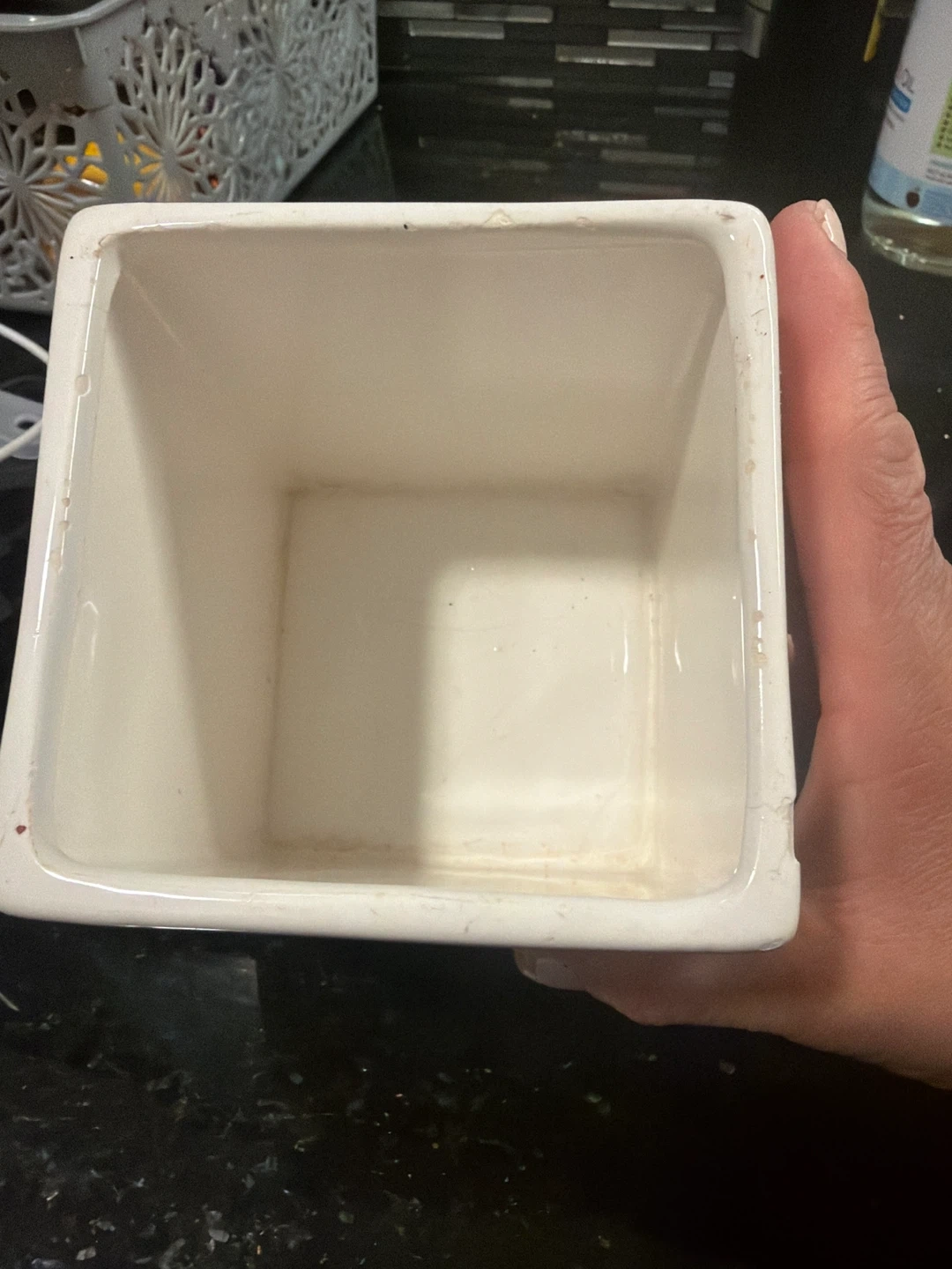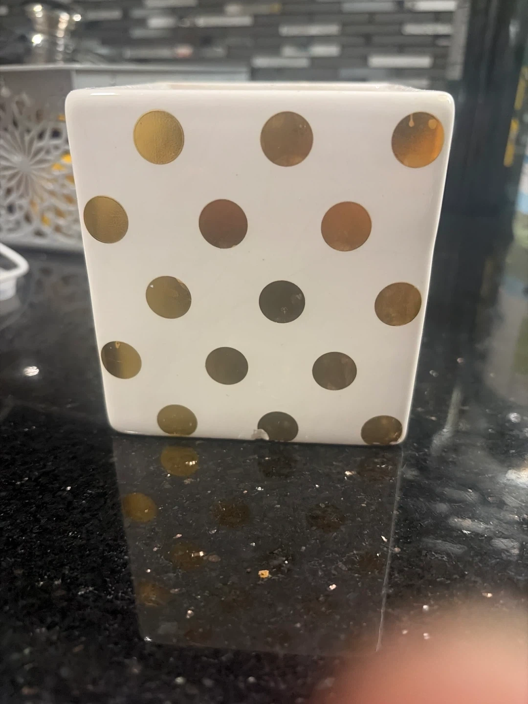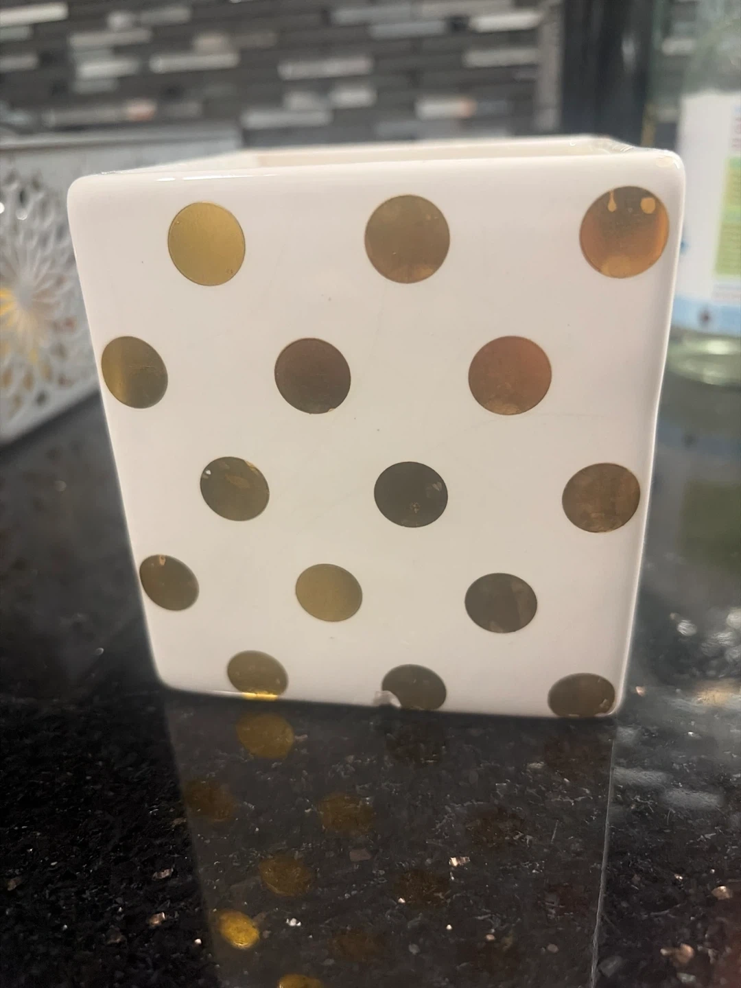 White ceramic pot with a gold polka dot design. It's a square shape with an opening at the top. This pot could be used for small plants or as a decorative holder. Approximately 4 inches tall.