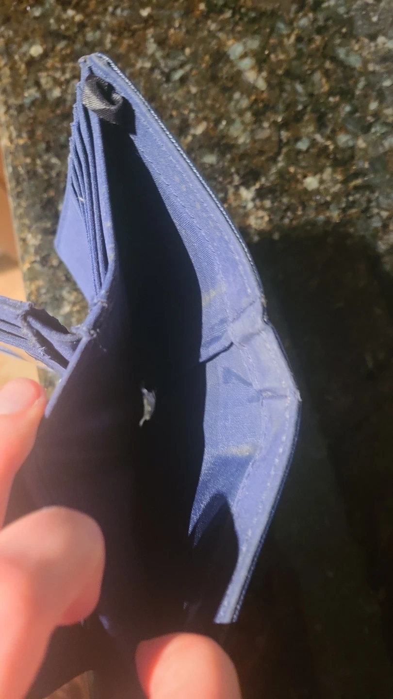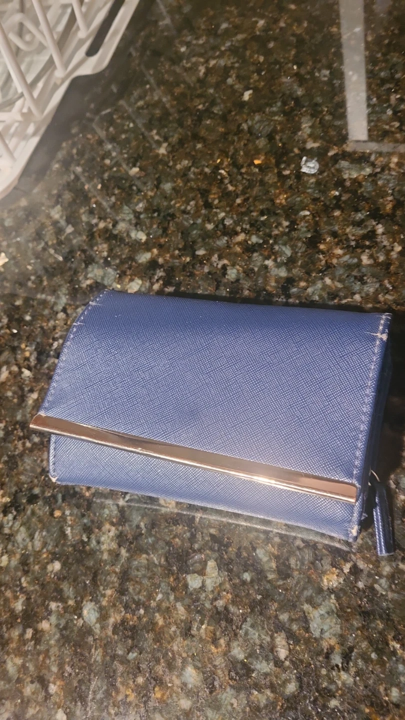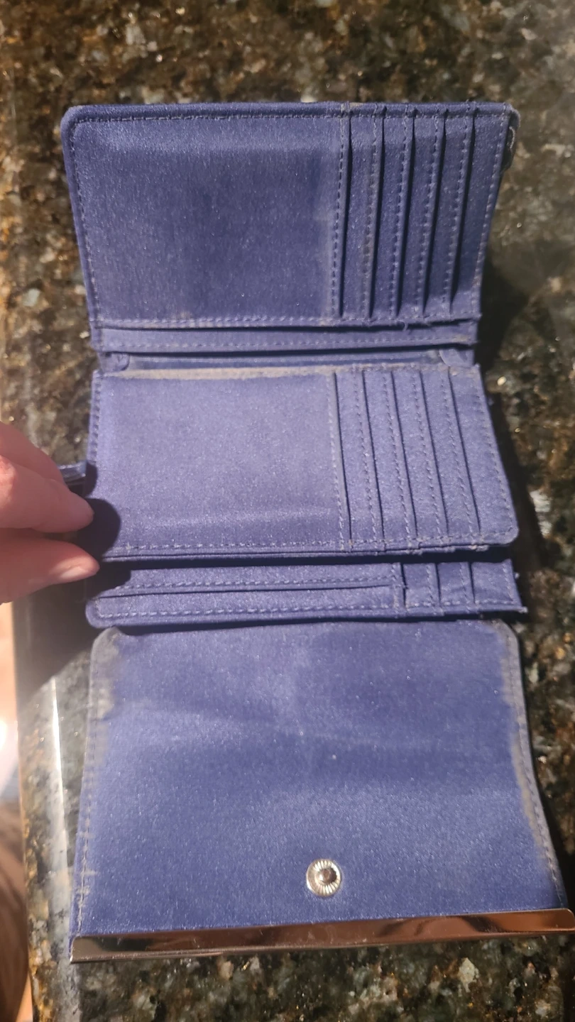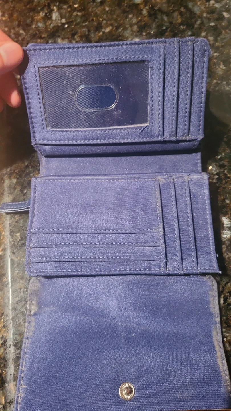 This navy blue tri-fold wallet has multiple card slots and a clear ID window. It also features a zippered coin pocket.