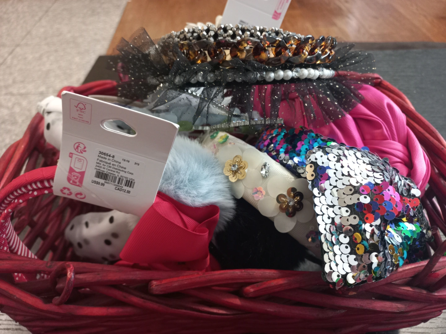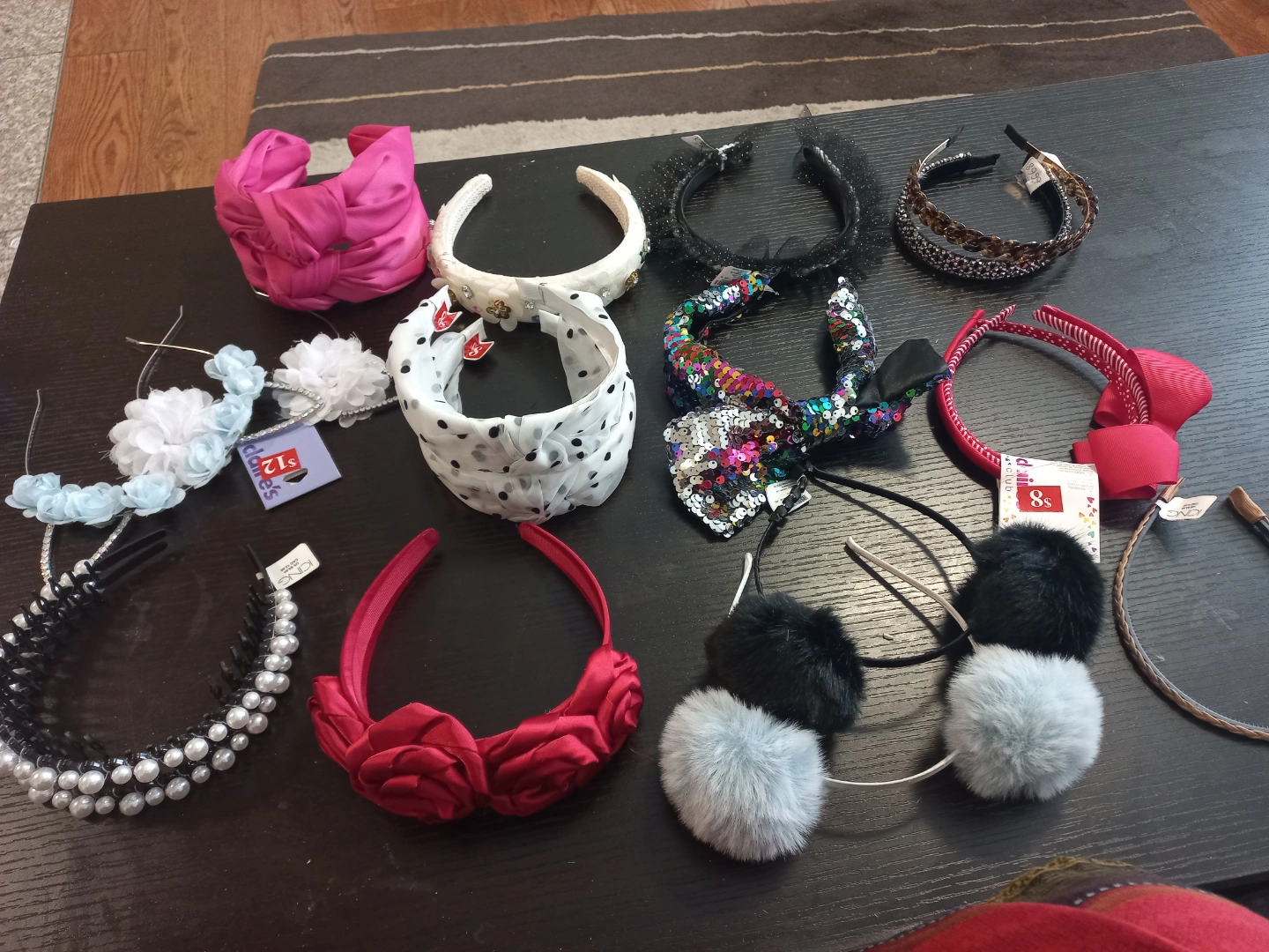 collection of girls' hair accessories. Includes various headbands, scrunchies, bows, and clips. Many different colours and styles. Perfect for adding to a shop's inventory or for a child with lots of hair accessories.