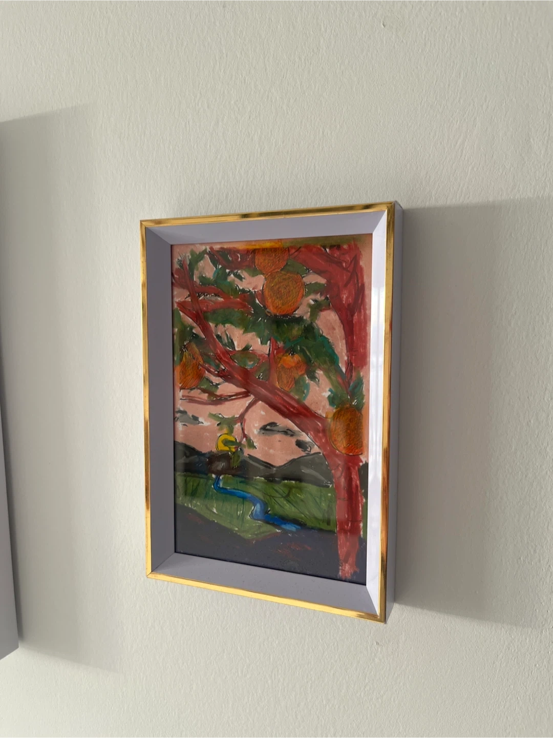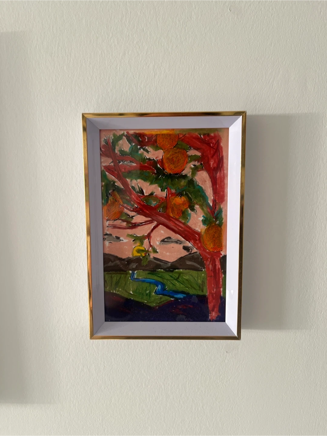 A charming framed painting depicts a vibrant fruit tree with oranges against a soft, dusky sky. The landscape below features rolling hills and a winding blue river. It's ready to add a touch of colour to any room!