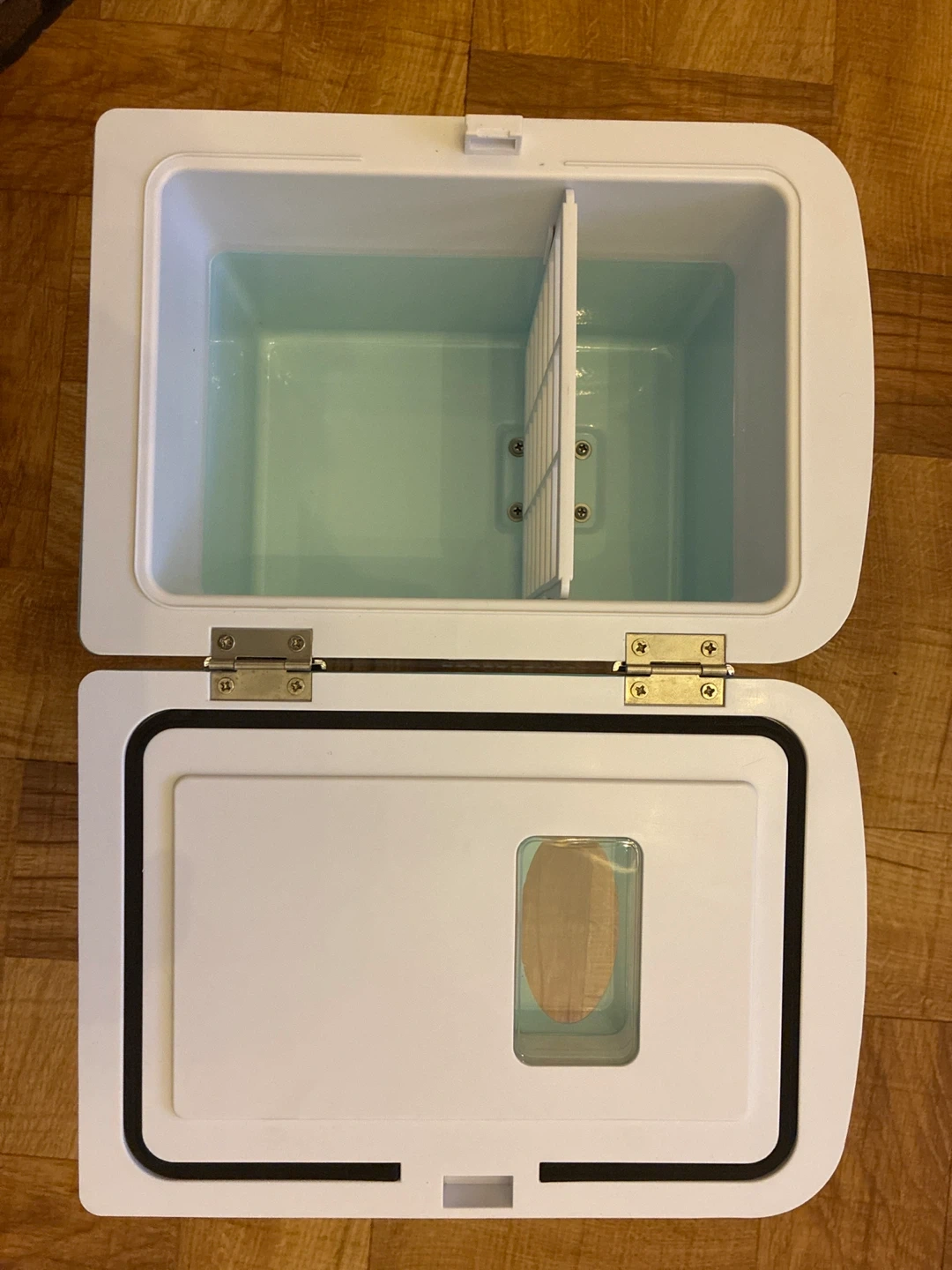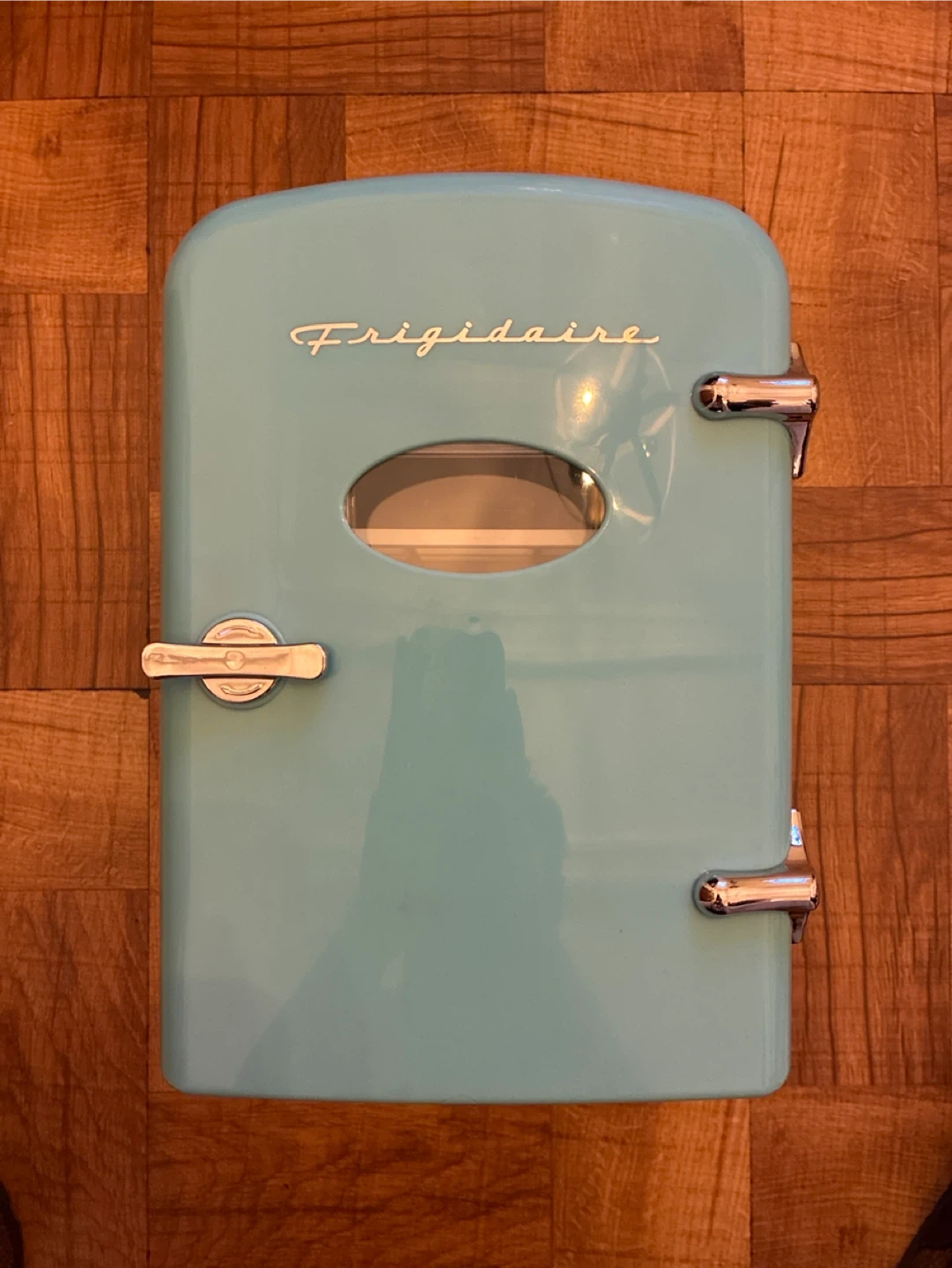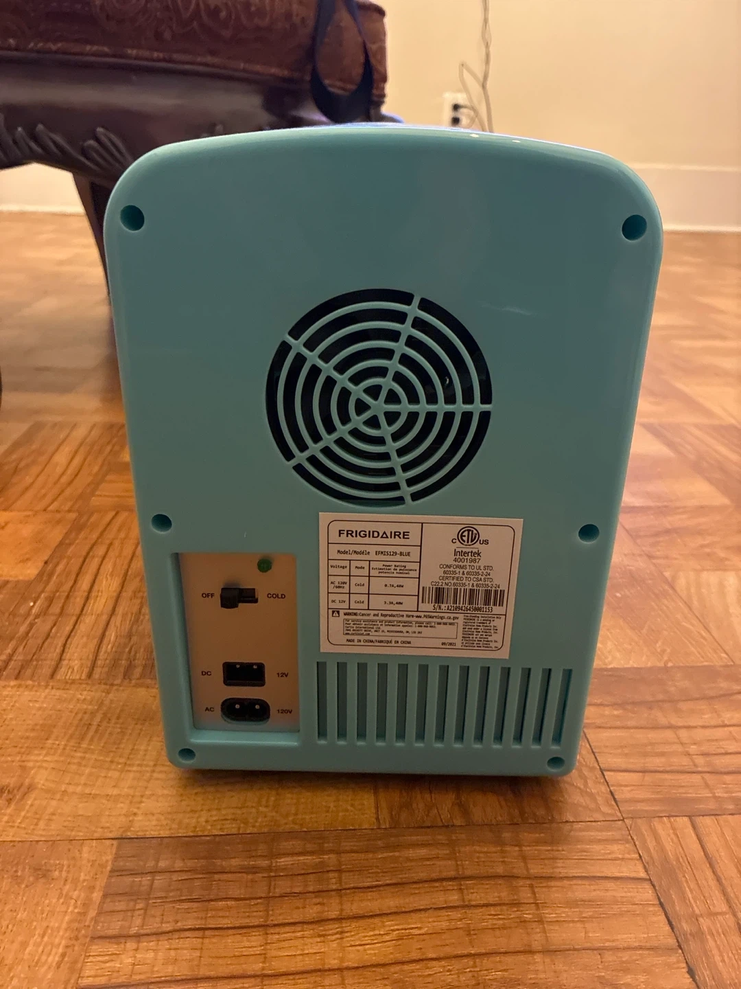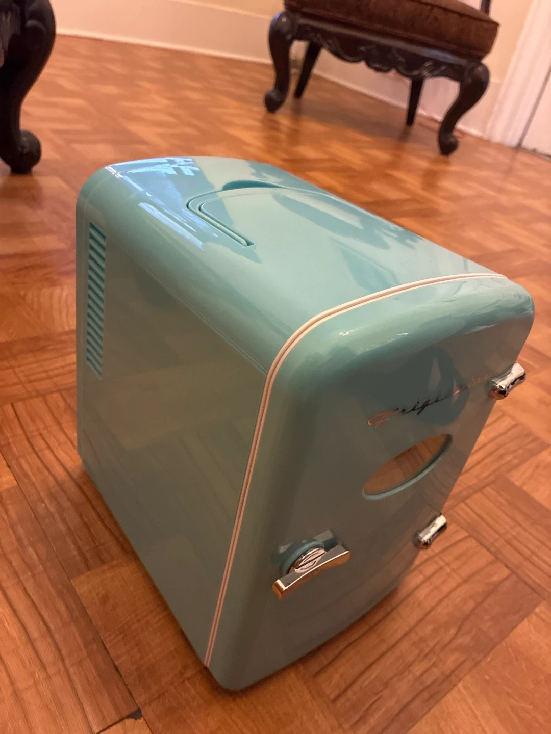 Frigidaire retro mini fridge in a cool blue color. It's a compact 4-liter capacity. Perfect for storing skincare, drinks, or snacks! Comes with AC and DC power cords.