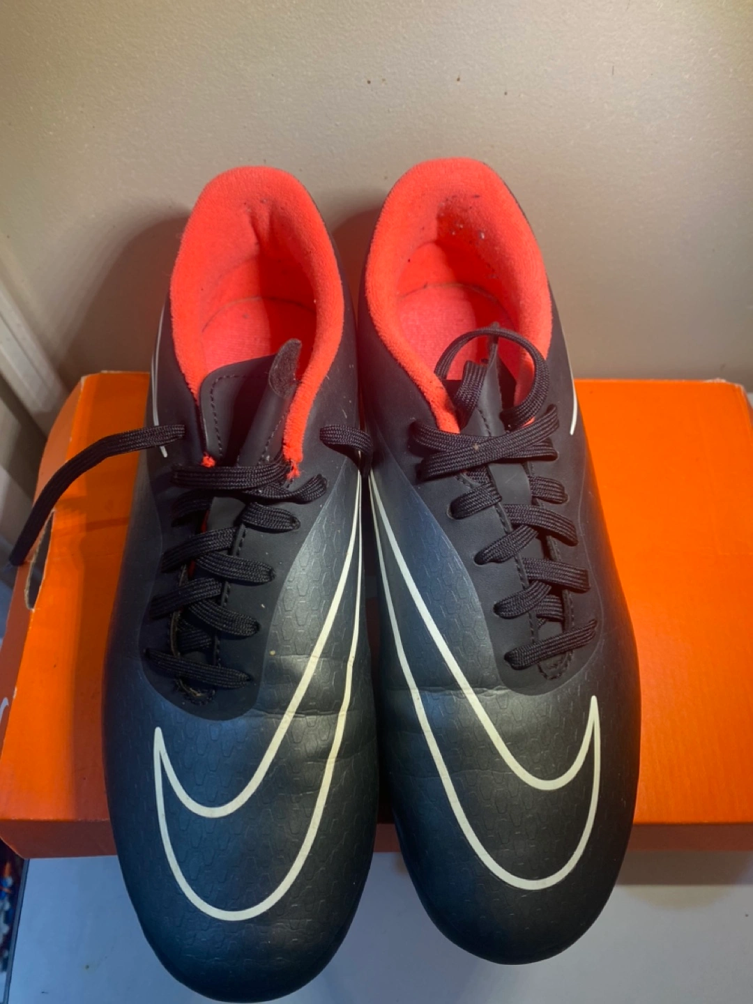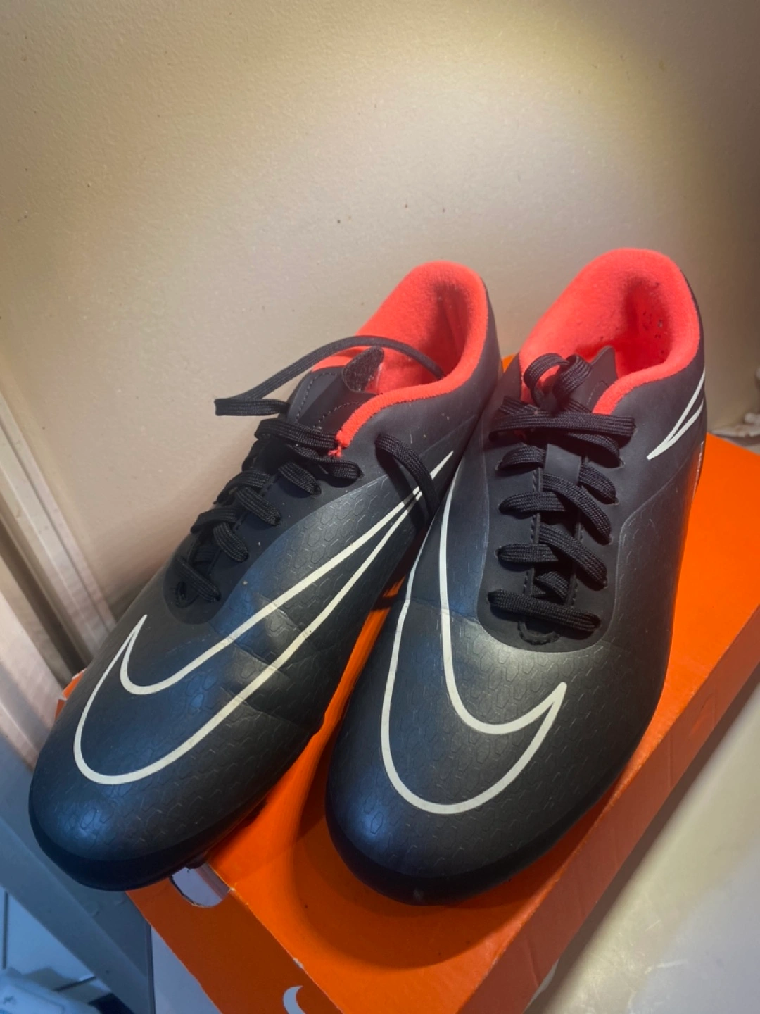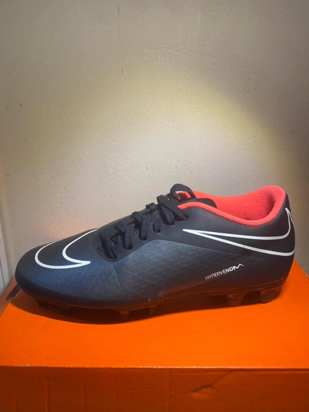 Like new, worn twice . Black and coral Nike Hypervenom Phelon FG soccer cleats. Firm ground cleats. Lace-up closure. Good condition. Size 7.5