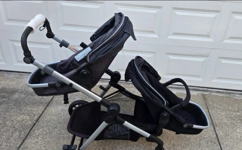 This is a black Evenflo twin double stroller. It's designed for two children. The stroller has adjustable seats and harness systems.