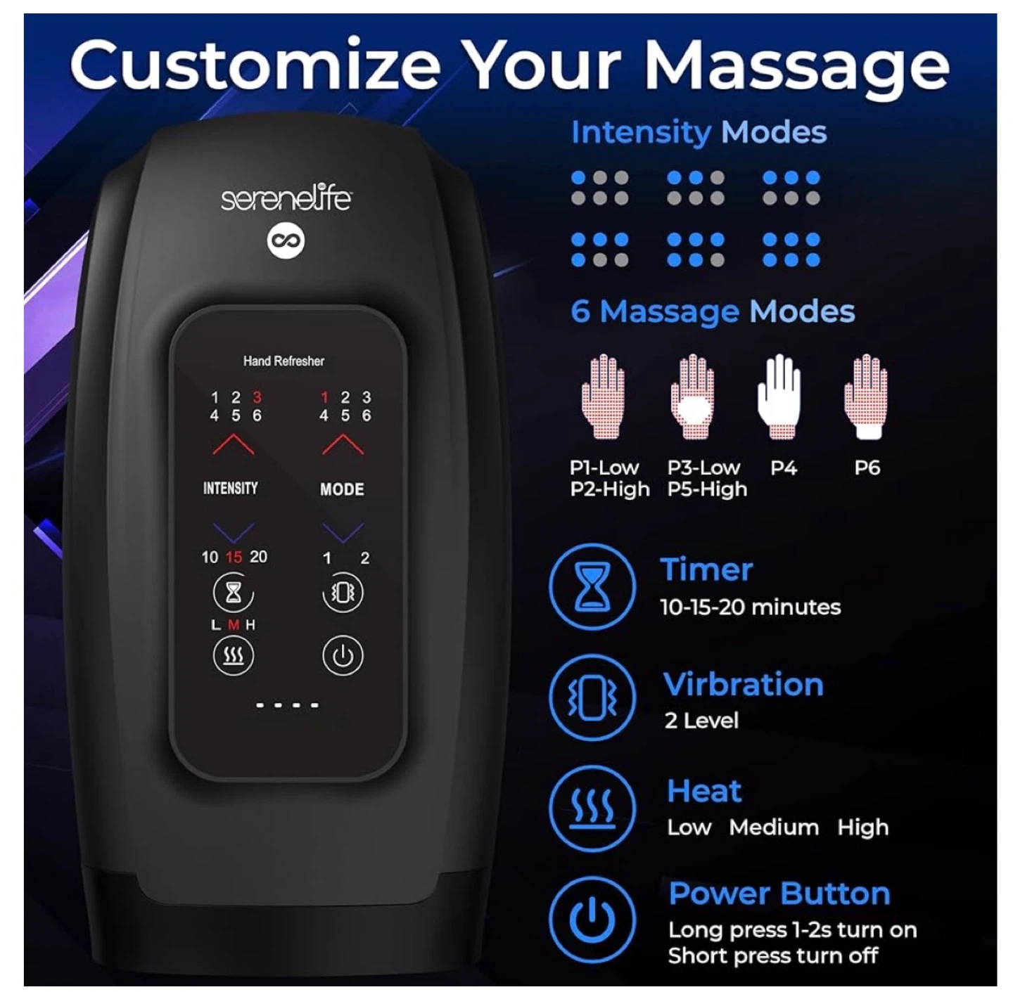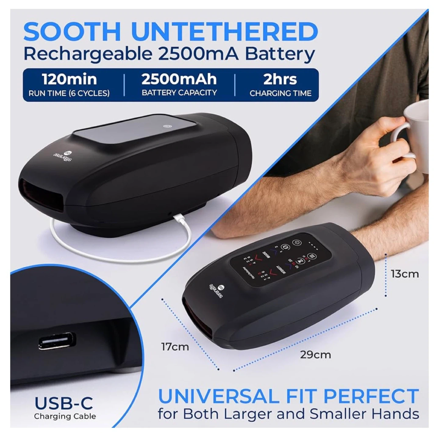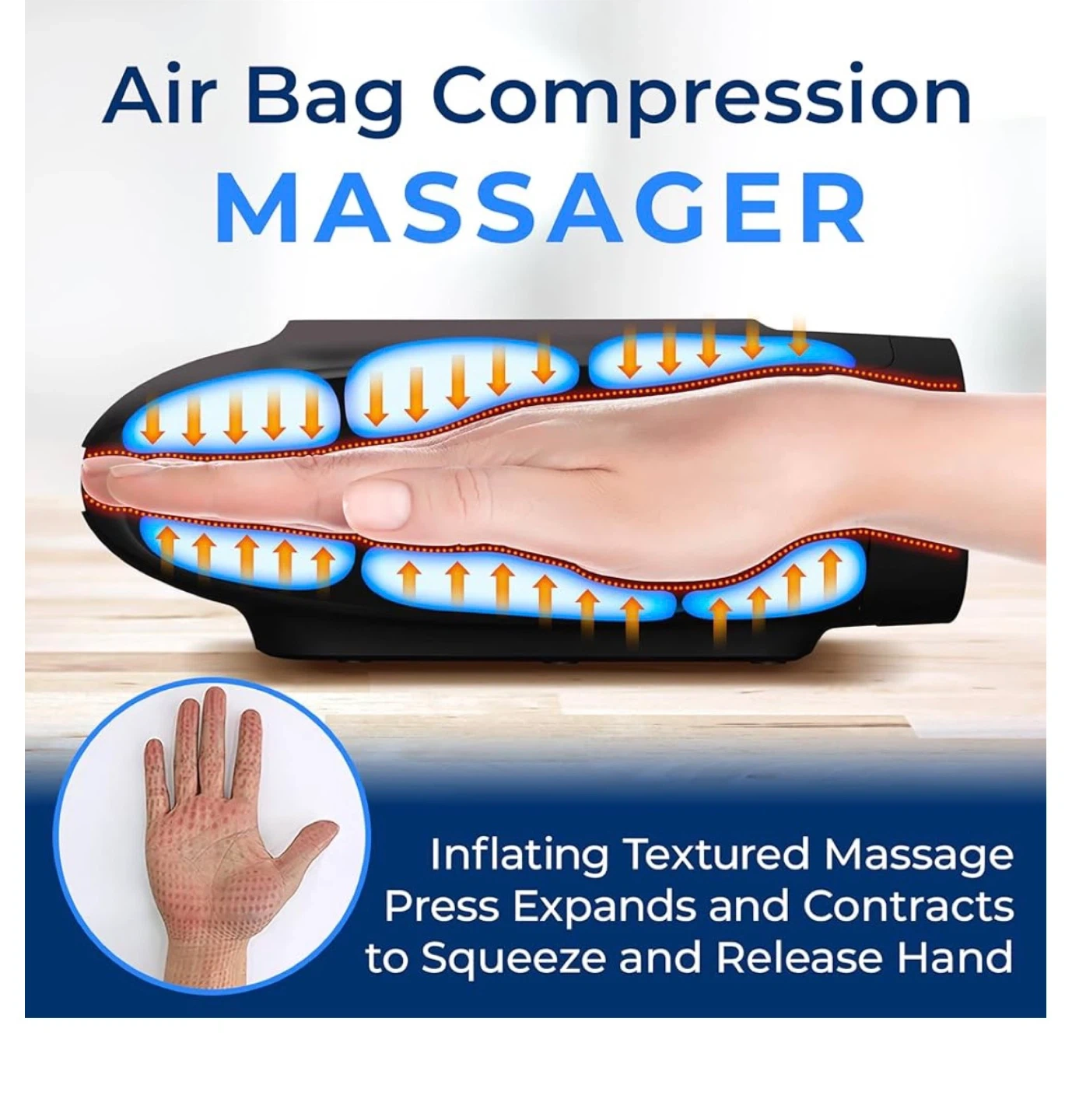 This rechargeable hand massager offers air bag compression and heat. It features a 2500mAh battery with a 120-minute run time and a 2-hour charging time. Universal fit for most hands.