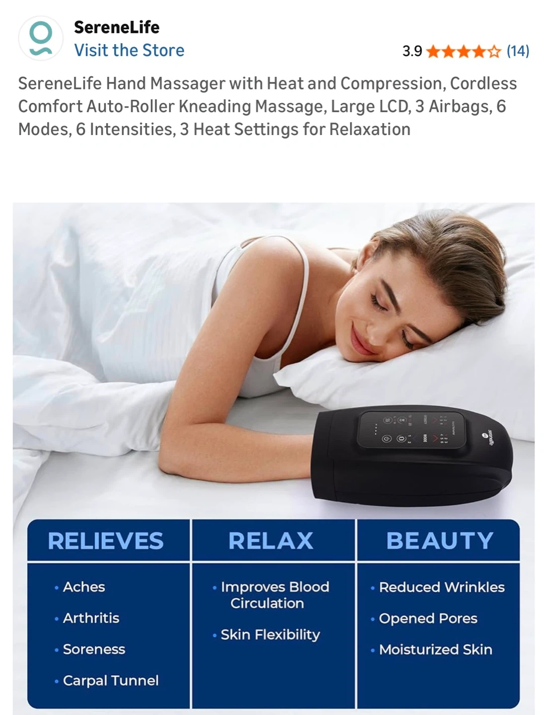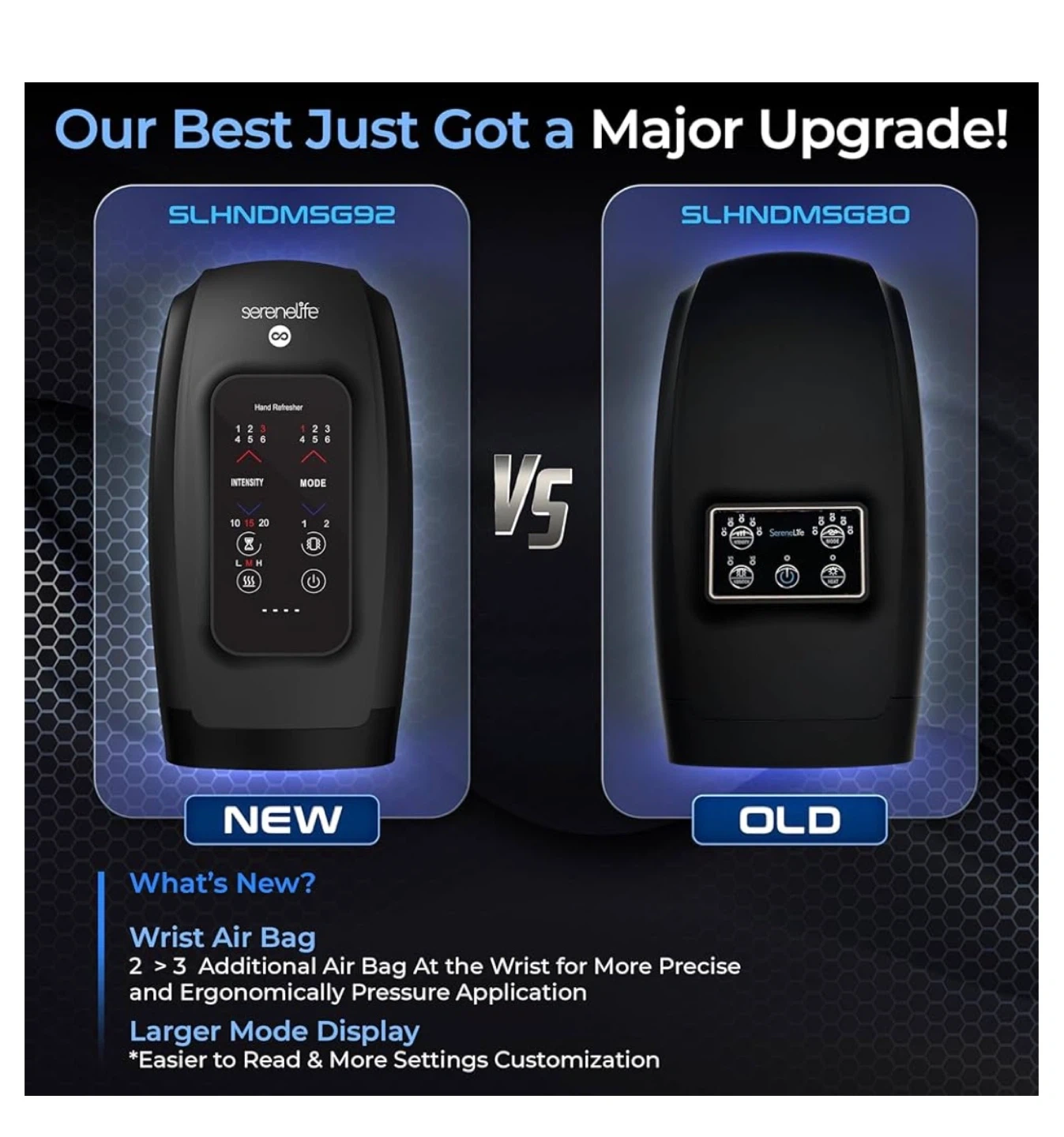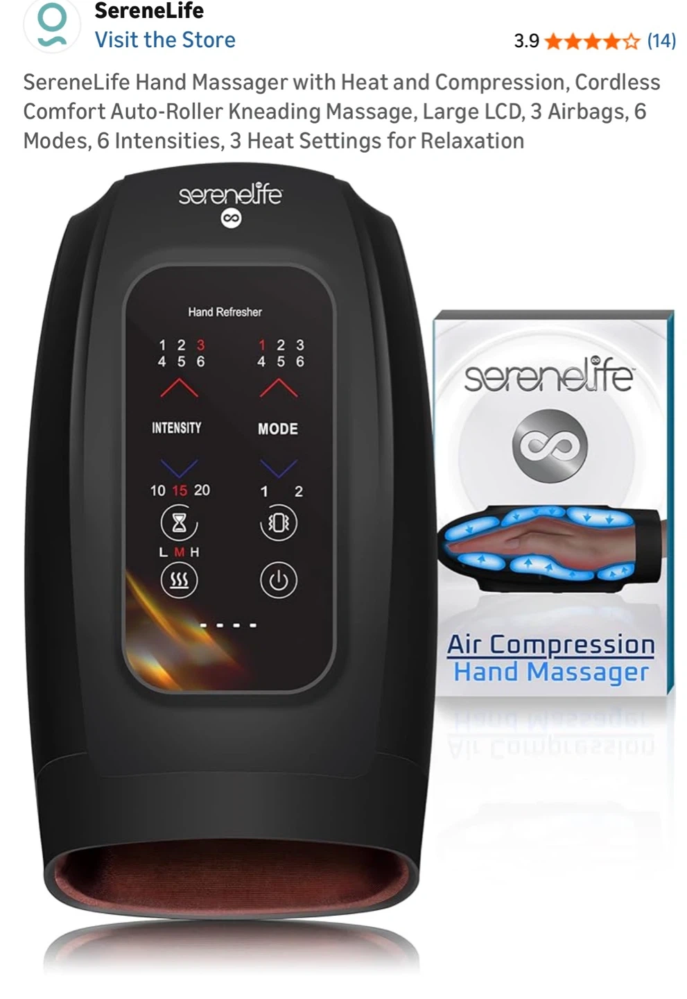 This rechargeable hand massager offers air bag compression and heat. It features a 2500mAh battery with a 120-minute run time and a 2-hour charging time. Universal fit for most hands.