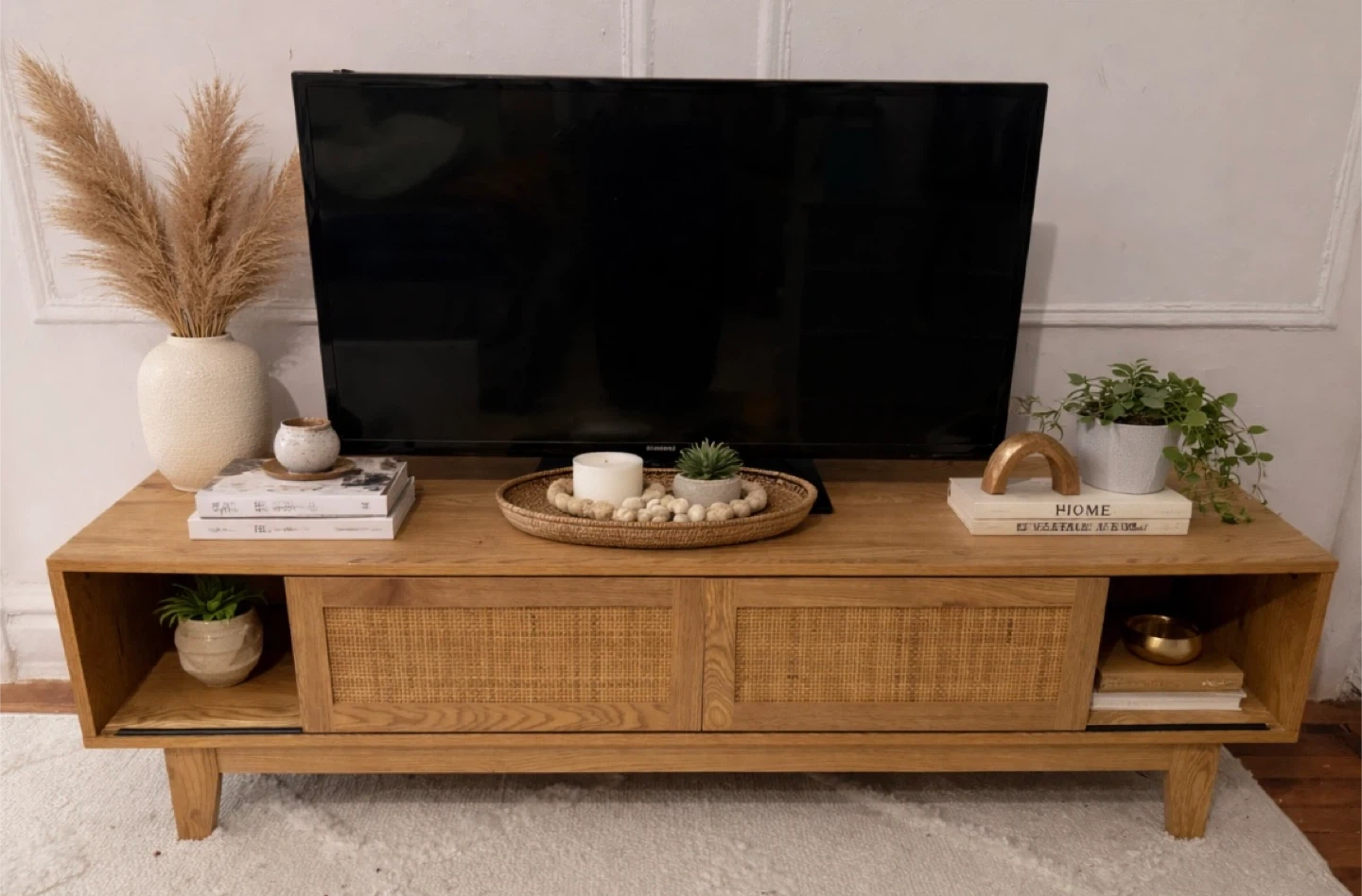 Beautiful modern boho style TV stand with natural wood tones and woven rattan drawer fronts. This piece adds a warm, stylish touch to any living room while also providing great storage for electronics and accessories.