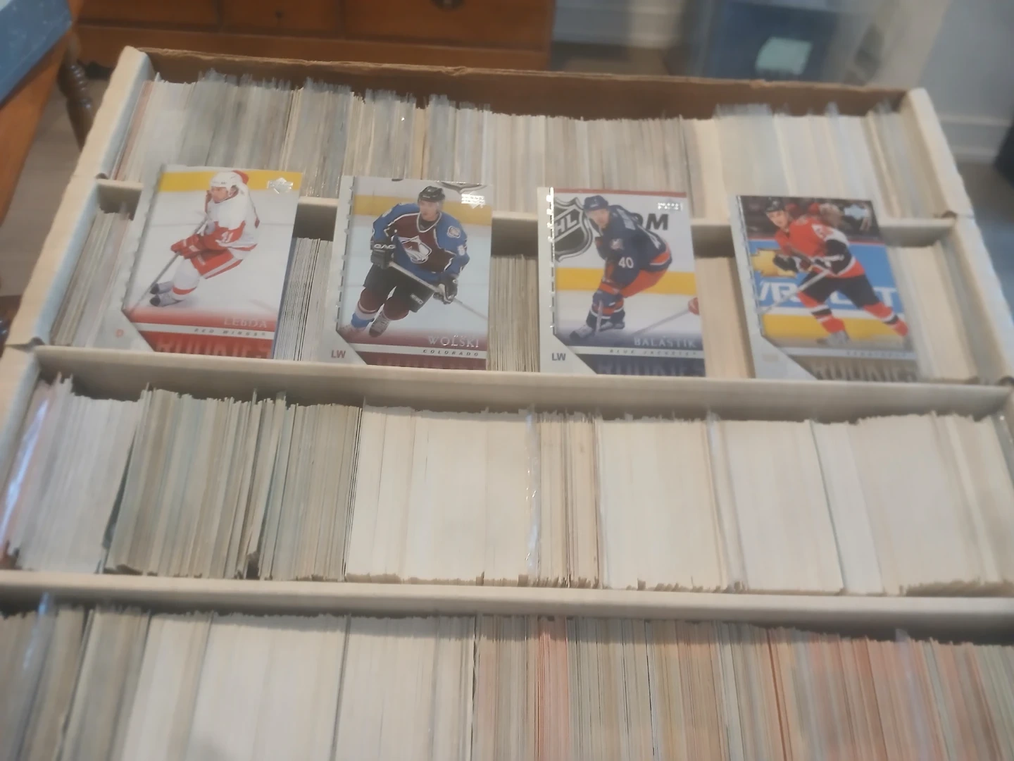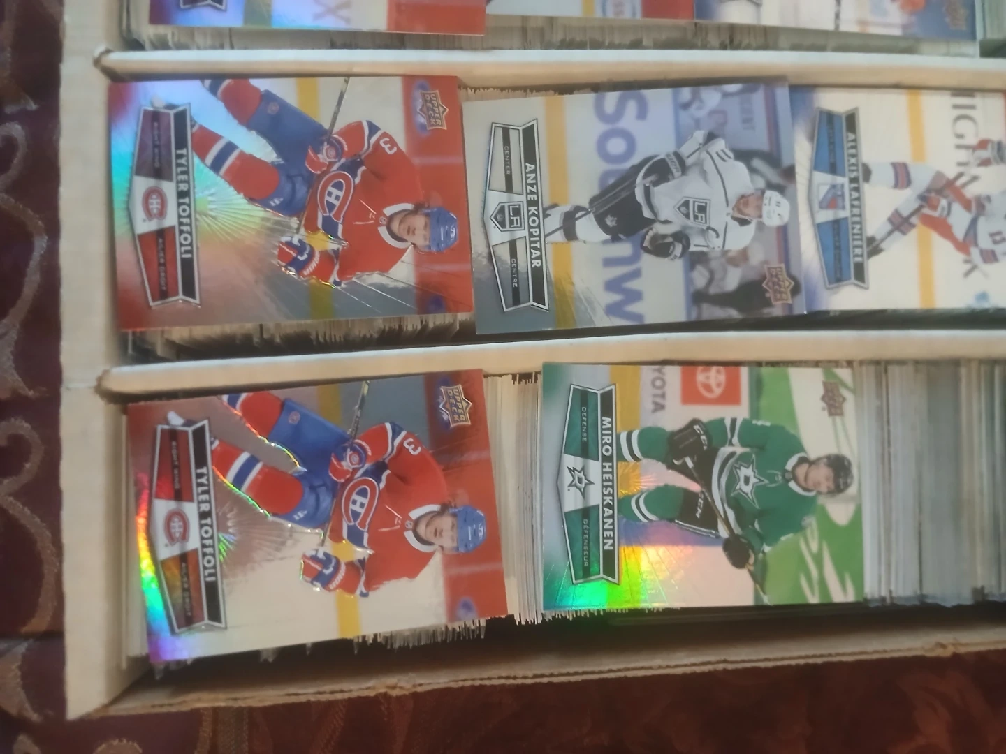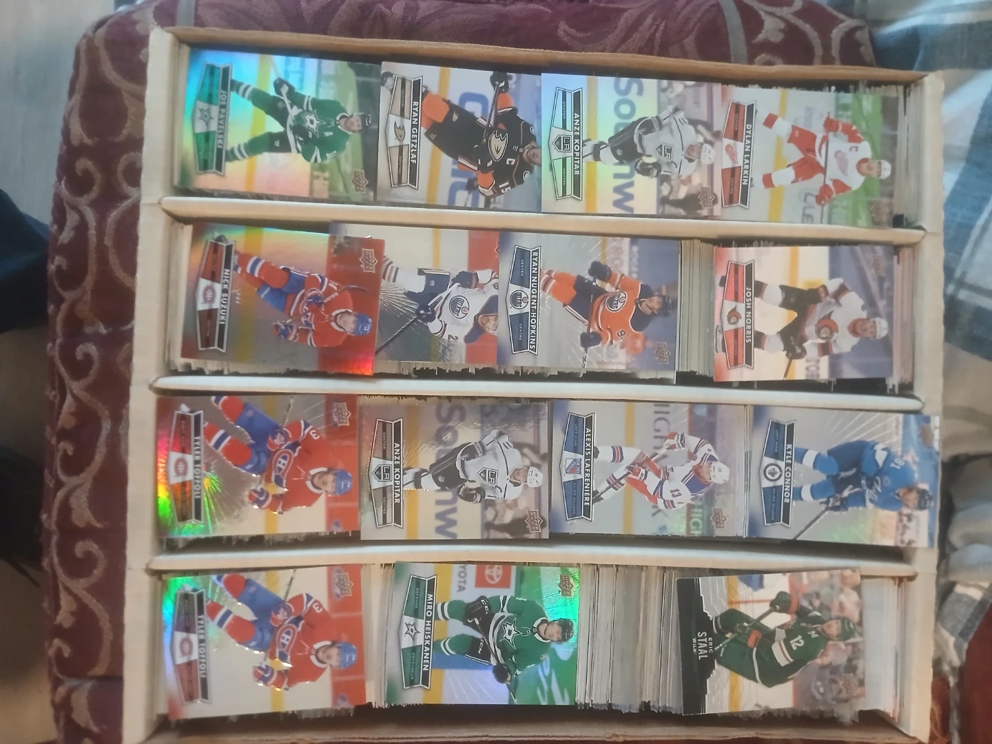 This is a collection of hockey & baseball trading cards. It includes various players and designs. The cards are organized in a cardboard storage box with multiple compartments. The box is full of cards. Cards from the 90s up to 2020 upper deck and young guns from various years