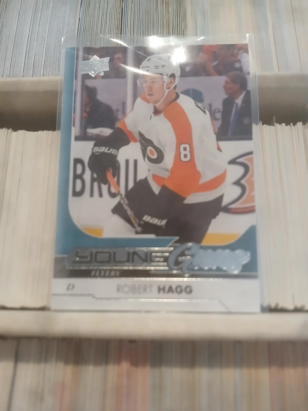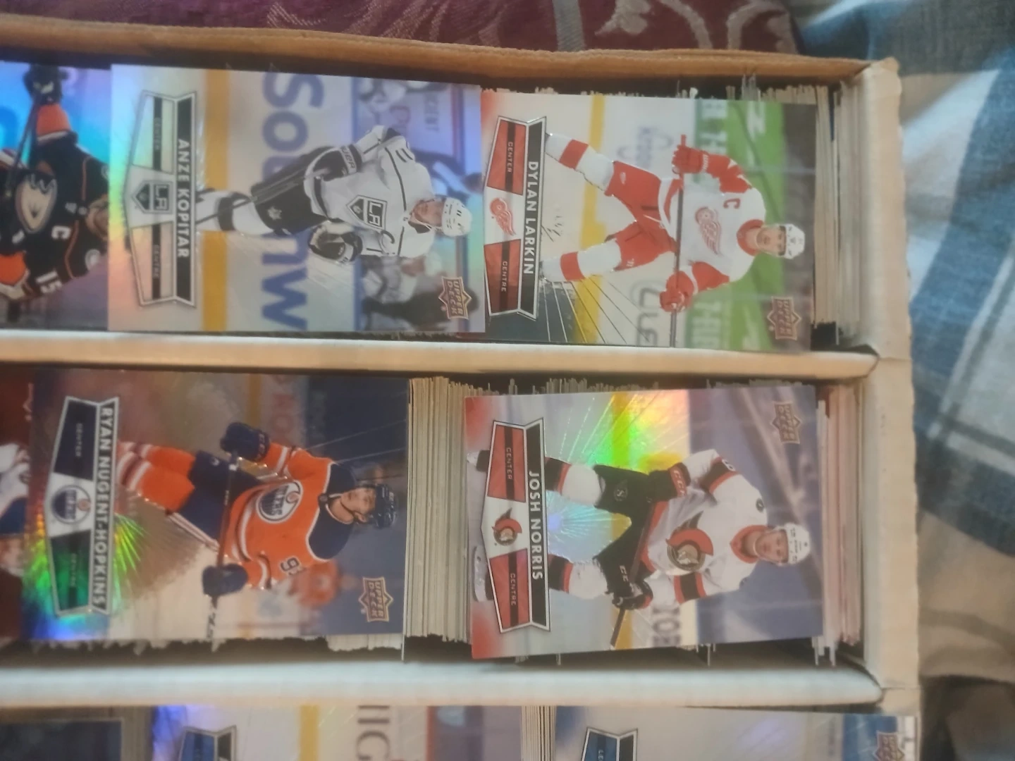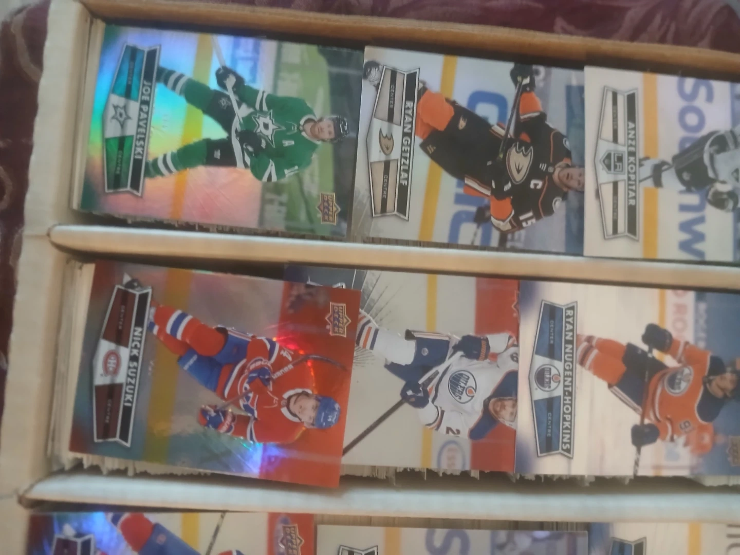 This is a collection of hockey & baseball trading cards. It includes various players and designs. The cards are organized in a cardboard storage box with multiple compartments. The box is full of cards. Cards from the 90s up to 2020 upper deck and young guns from various years
