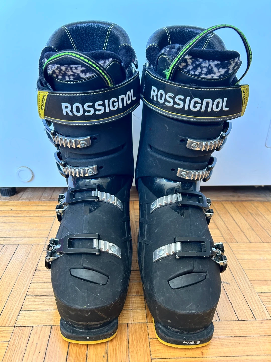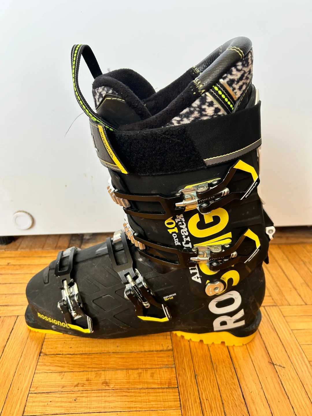 These Rossignol ski boots are designed for all-mountain performance. They feature a black and yellow design with adjustable buckles for a secure fit. The boot liners are black and white patterned. Great for hitting the slopes!The retail price is $550.size 9.