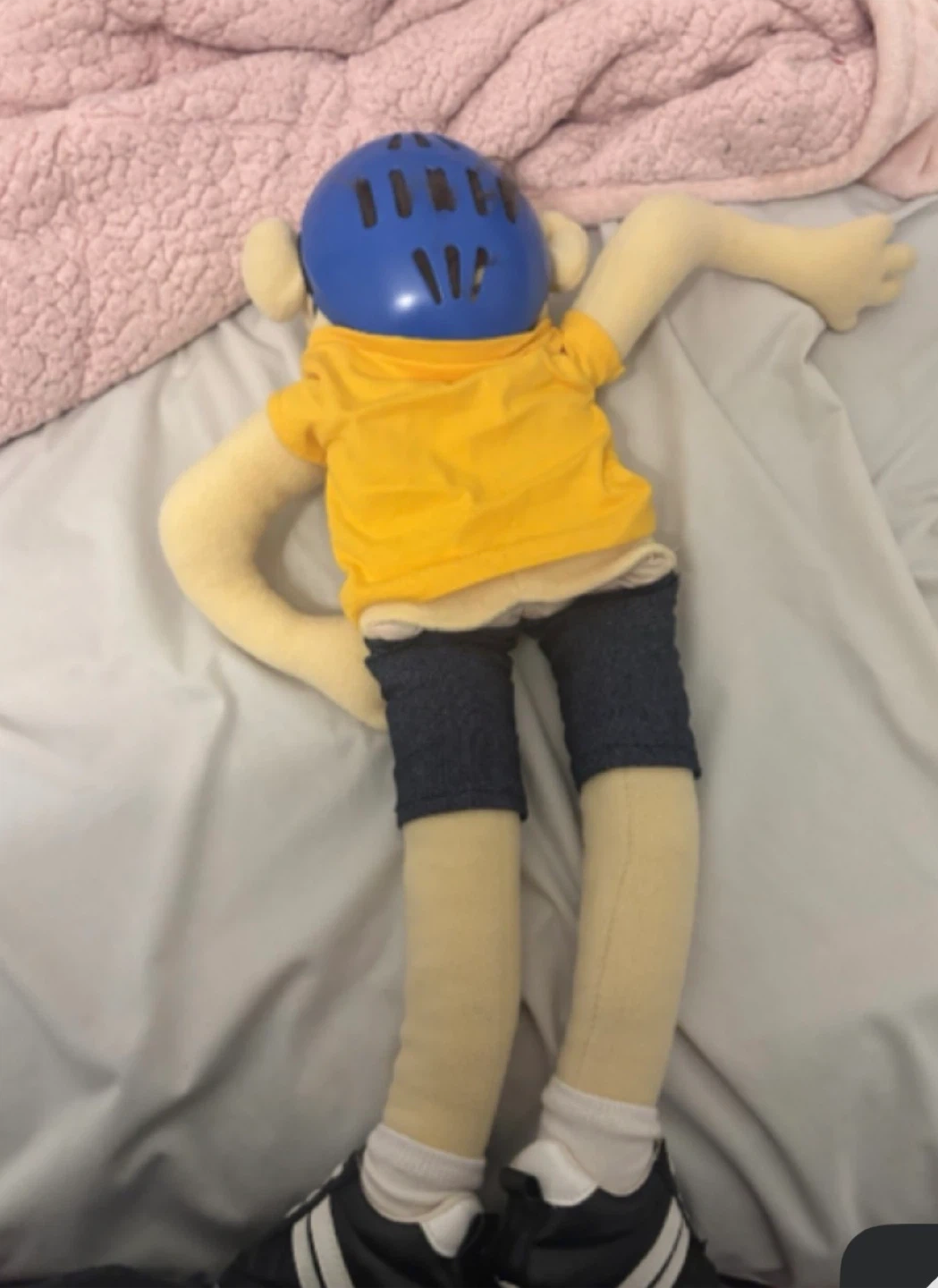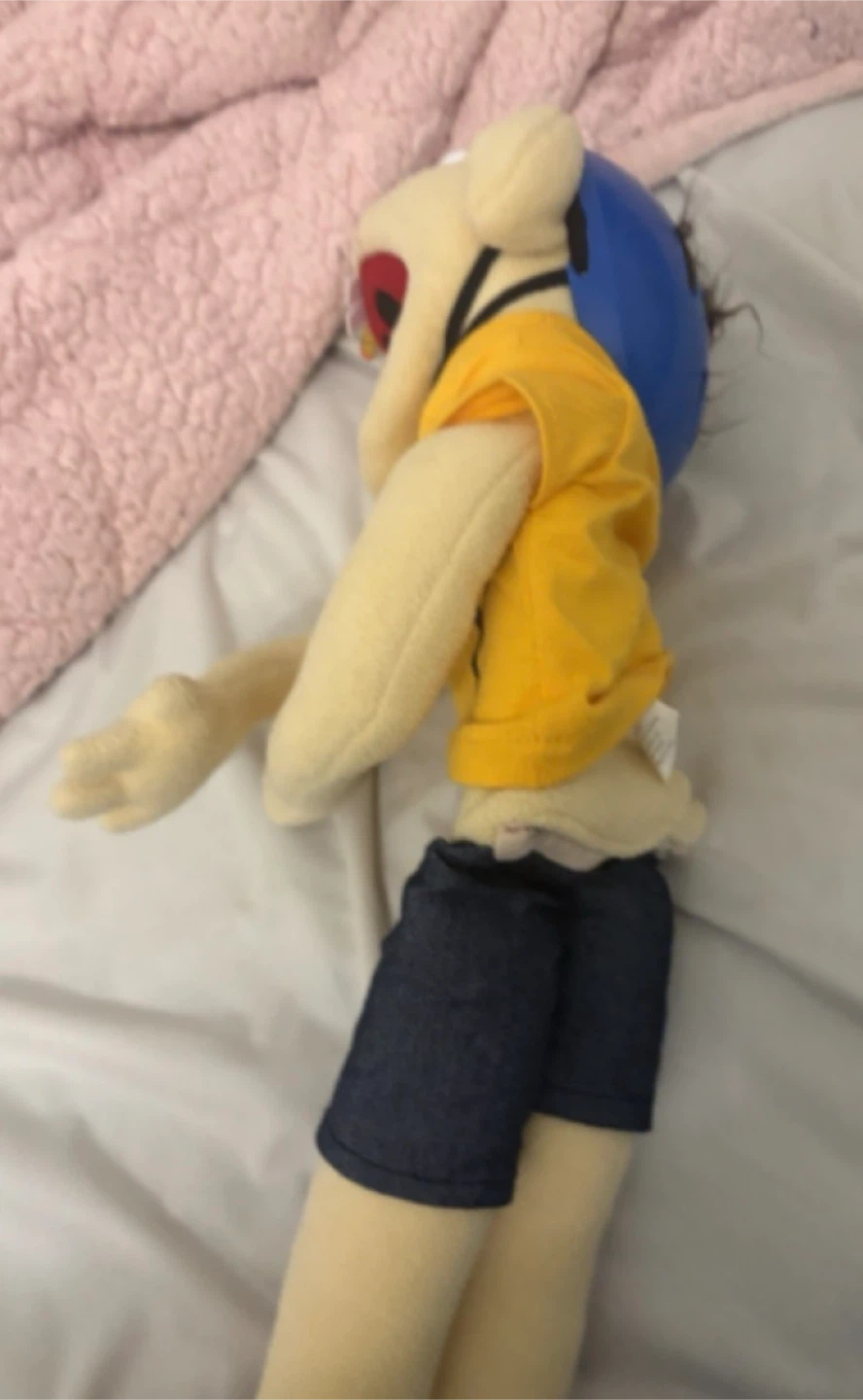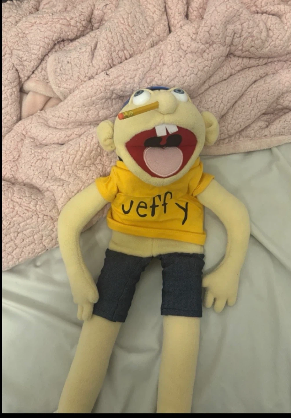 This is a Jeffy plush toy. It's wearing a yellow t-shirt with 'JEFFY' written on it, denim shorts, and a blue helmet. A pencil is stuck in its mouth. It's a fun toy for fans!