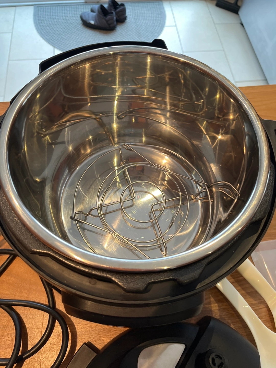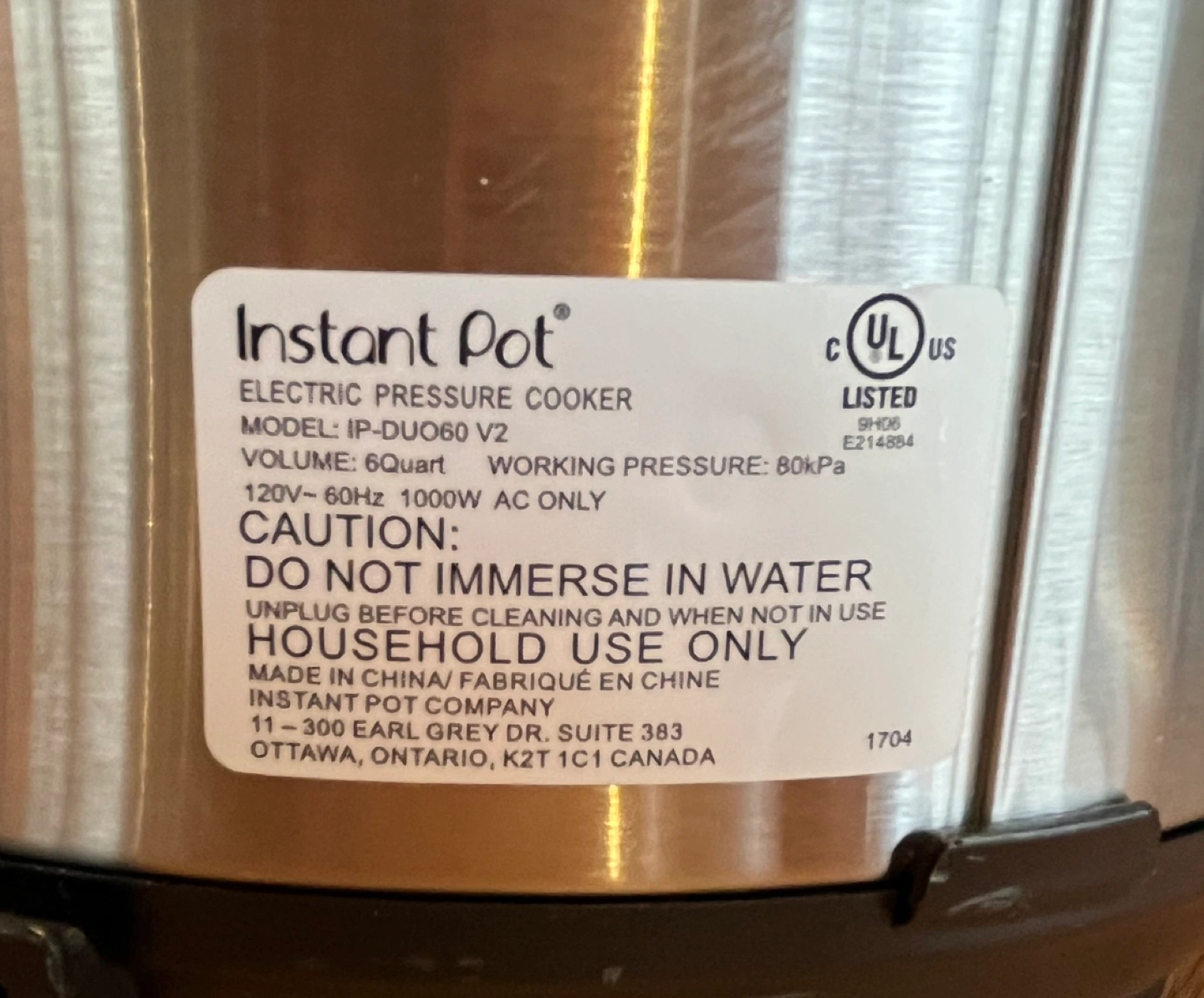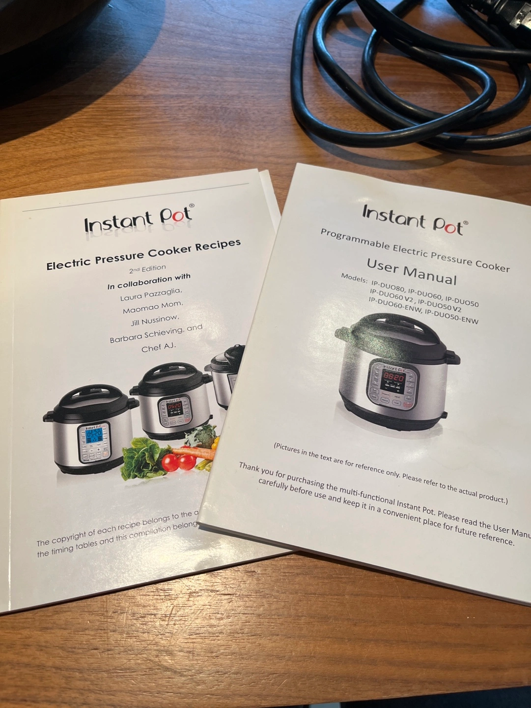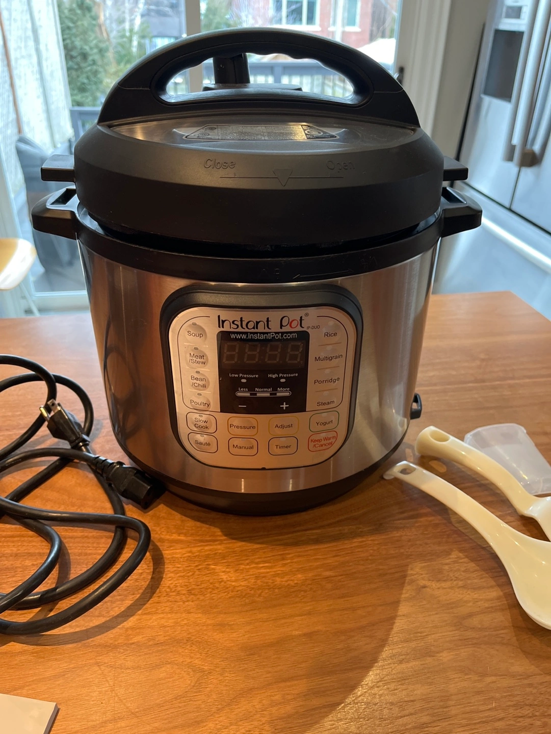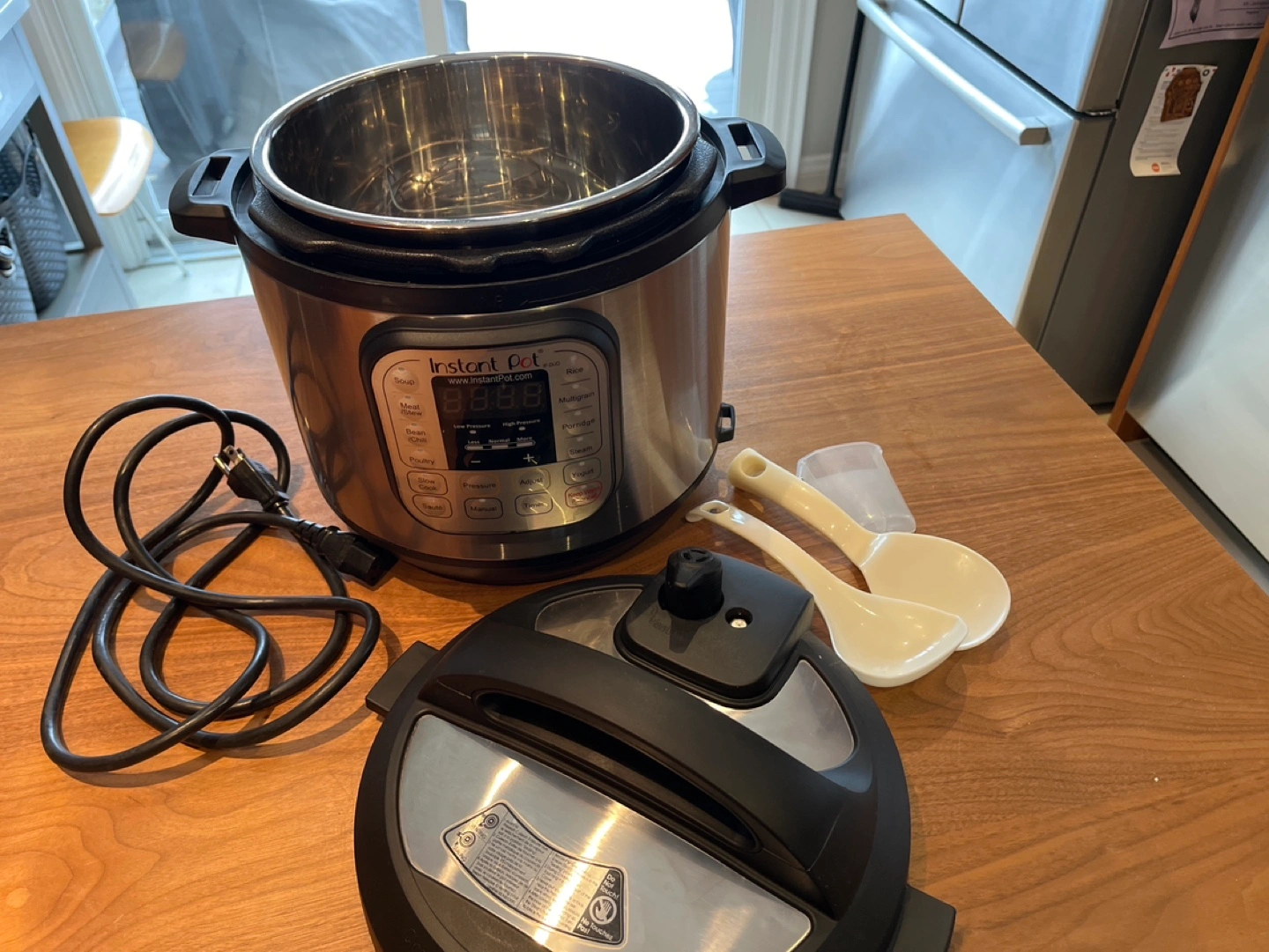 Programmable electric pressure cooker. Model: IP-Duo 60 V2. Size: 6 quart. Includes power cord, inner pot, steaming rack, and two serving spoons. User manual and recipe book included. Like new condition.