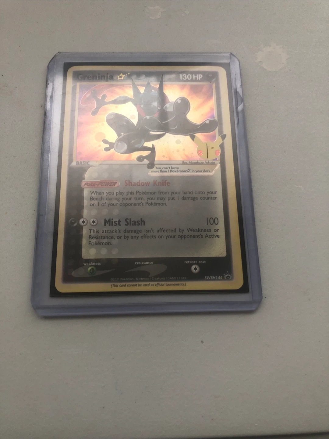 This is a Pokemon Greninja SWSH144 trading card. It has 130 HP and the "Shadow Knife" ability. The "Mist Slash" attack does 100 damage.