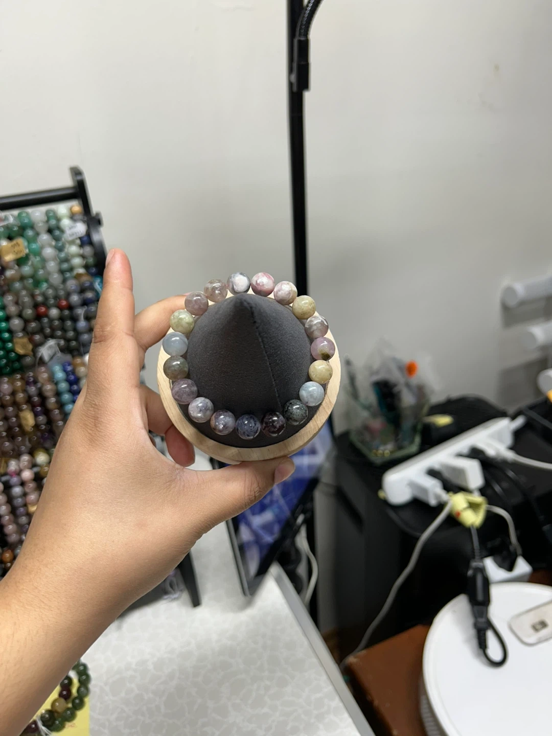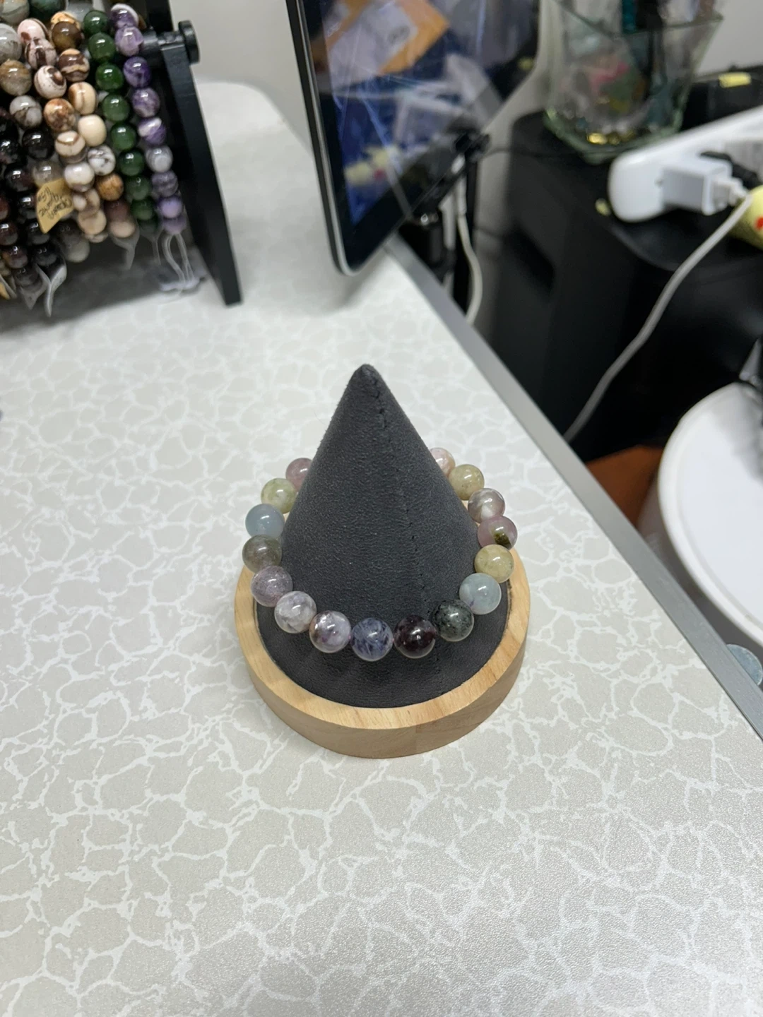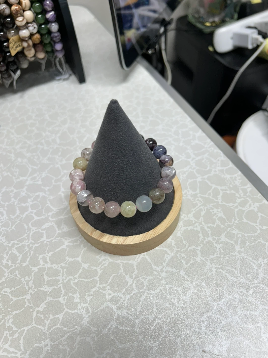 Beautiful bracelet crafted with multi-colored crystal beads. Each bead shows a unique blend of soft colors. It's an elastic bracelet for easy wear. Handmade