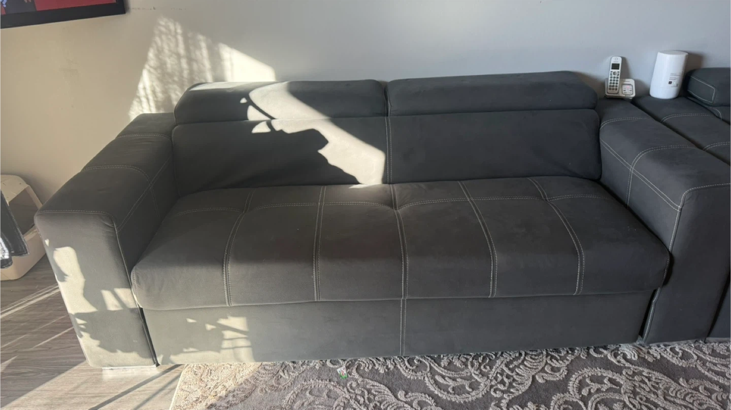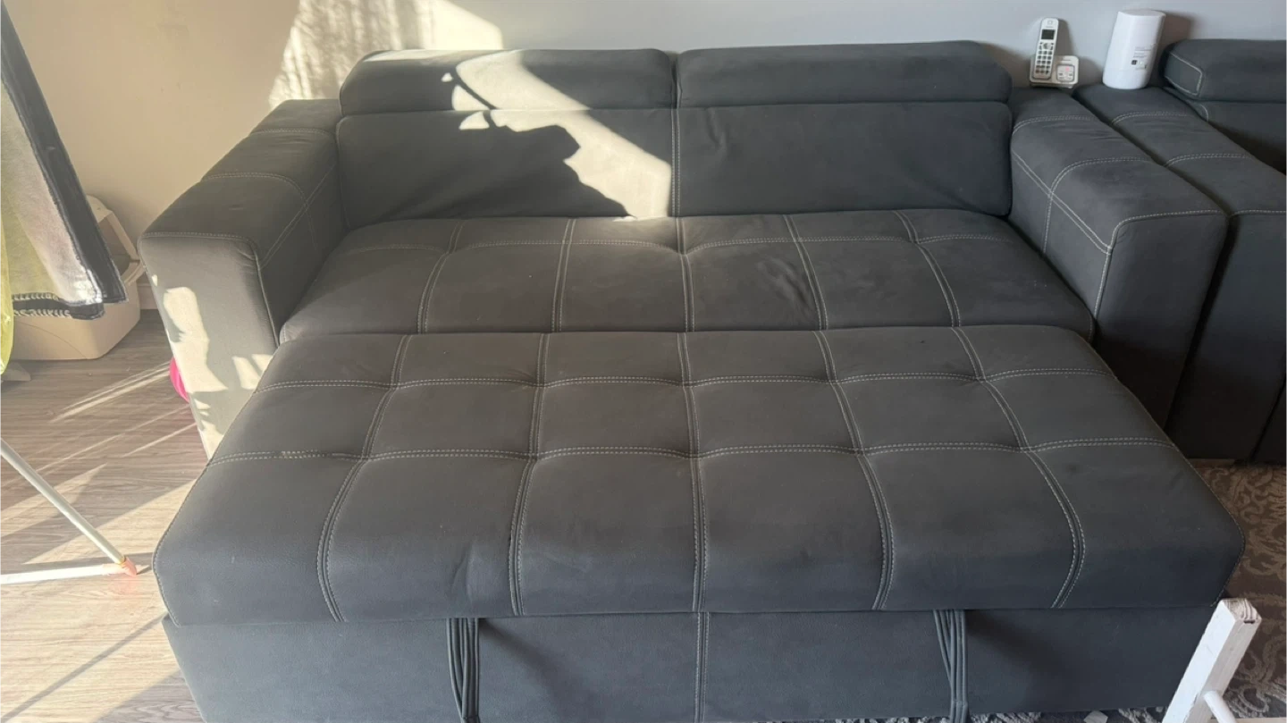 Dark grey sofa bed with a chaise section. It's upholstered in a soft fabric with contrast stitching. This piece offers flexible seating and sleeping options for your living space.