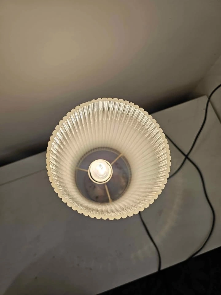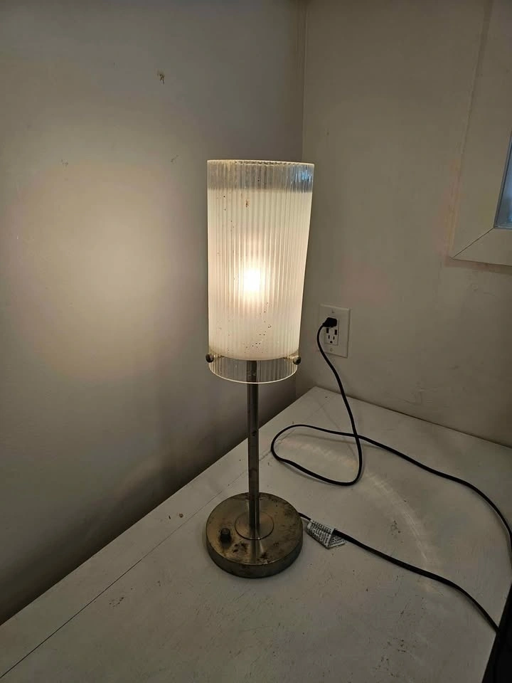 This is a Sompex Bubi table lamp, designed by Paul Secon in the 1970s. It features a brushed metal base and a ribbed glass shade. The lamp is currently listed for sale at CA$786.