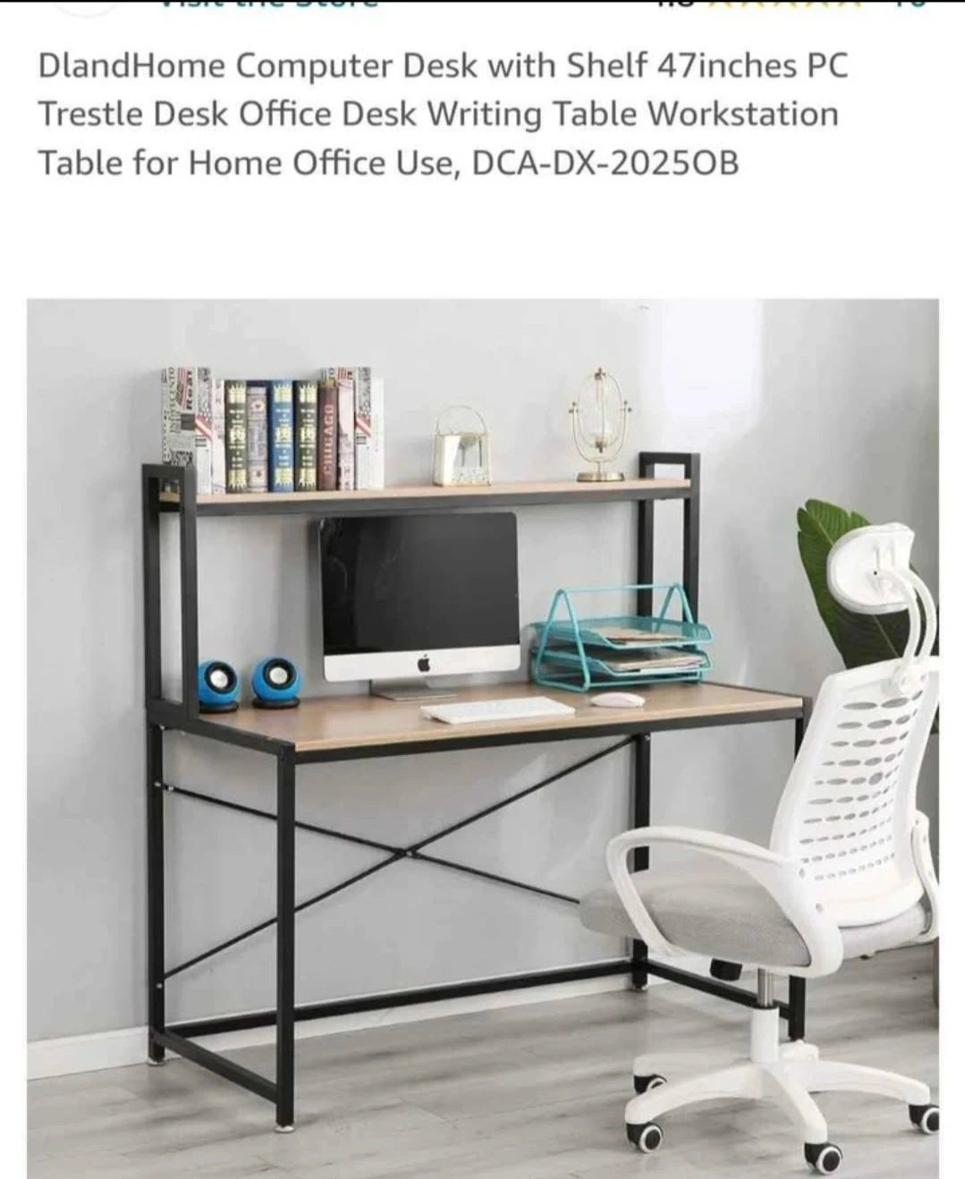 Selling a DlandHome computer desk with a shelf! It's a trestle-style desk, perfect for use as a workstation table in your home office. The model number is DCA-DX-20250B. It's 47 inches wide, with a depth 25 ins or 26 ins giving you plenty of space to work