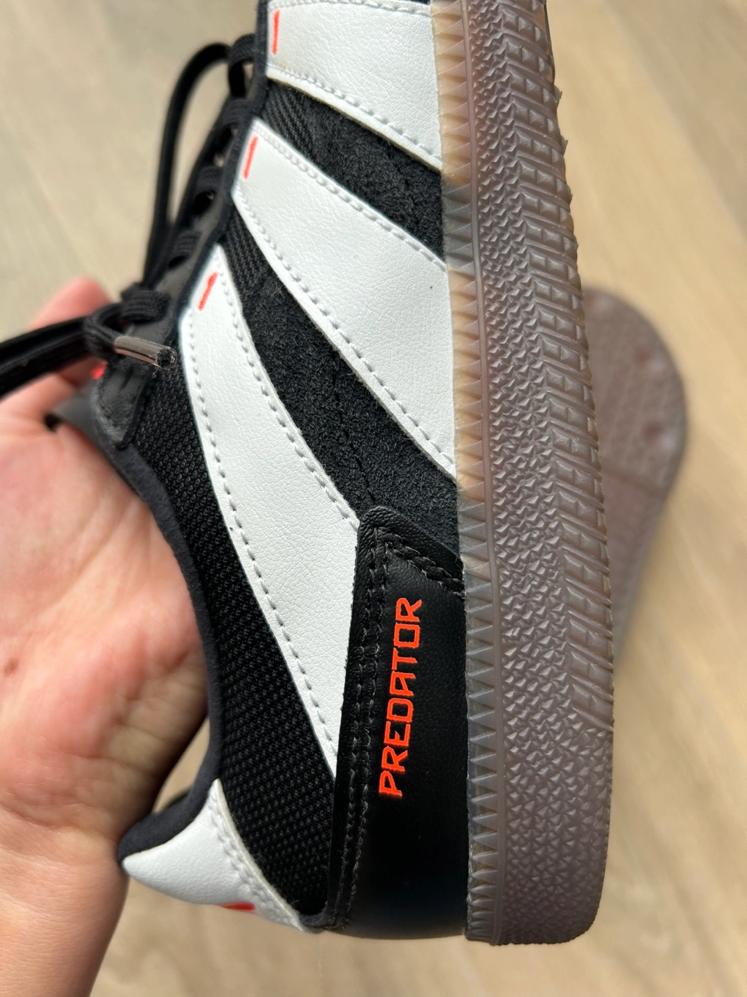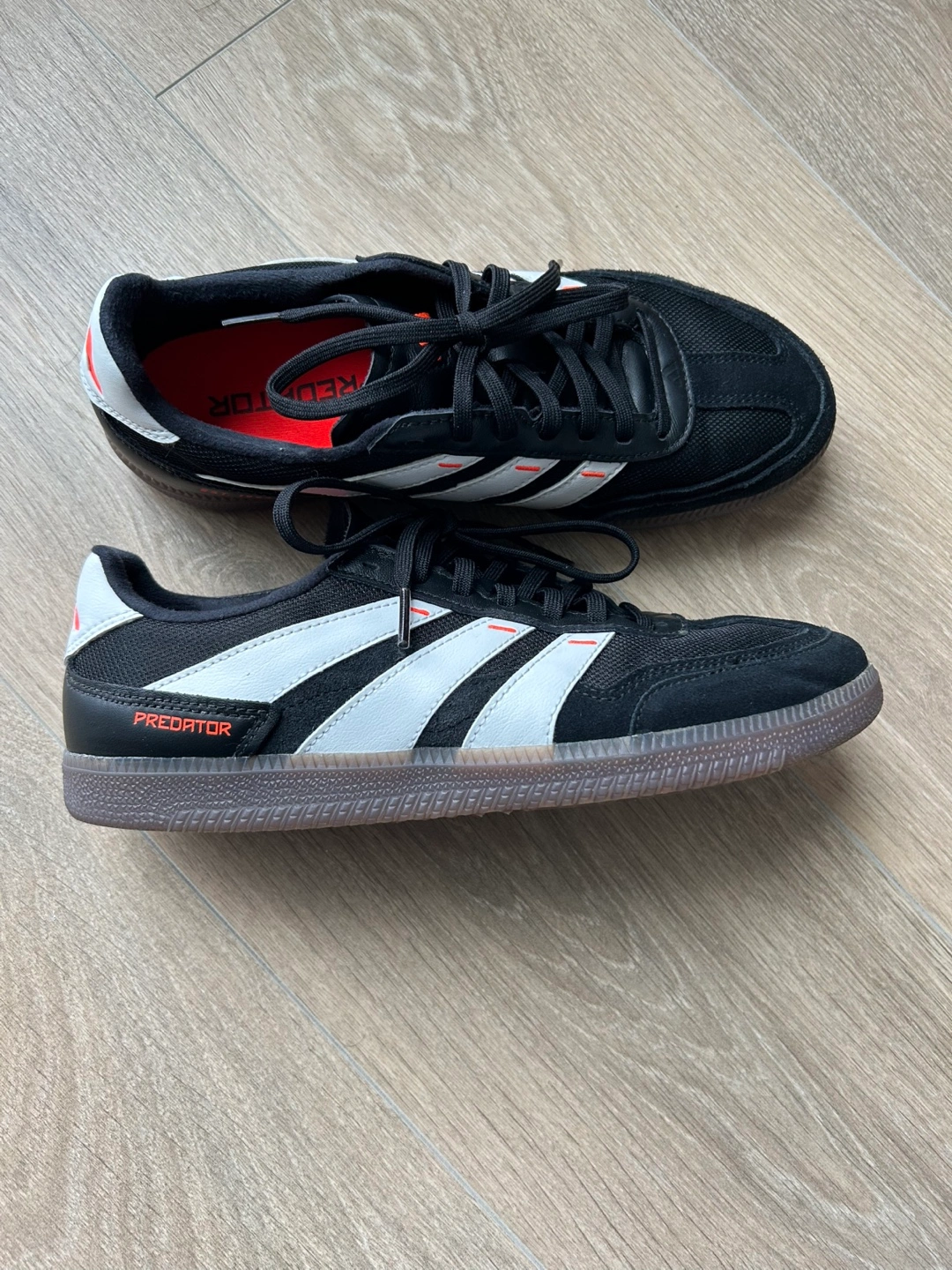 Adidas Predator indoor soccer shoes. Black and white colourway. Features a gum sole. Excellent for indoor courts.