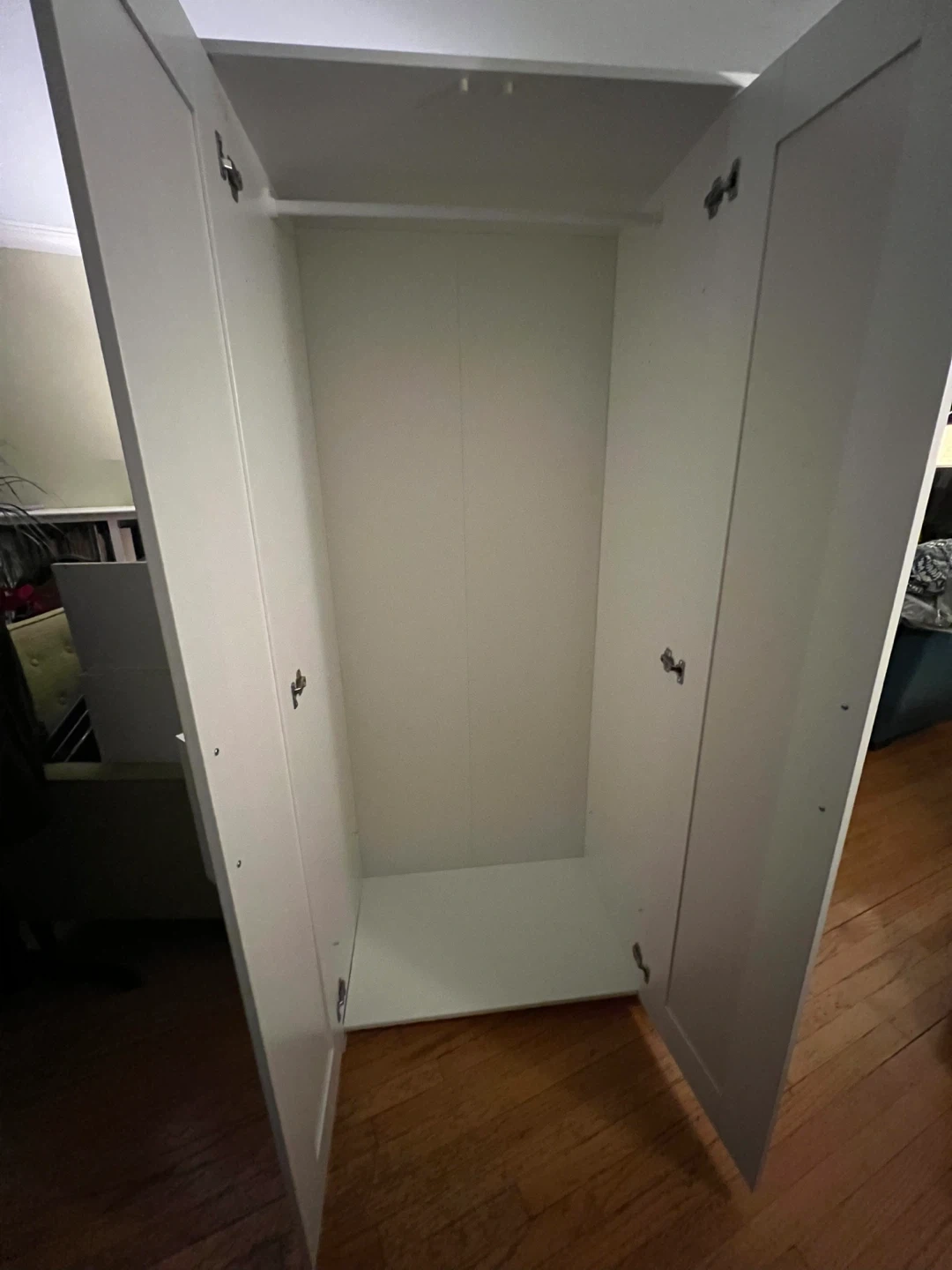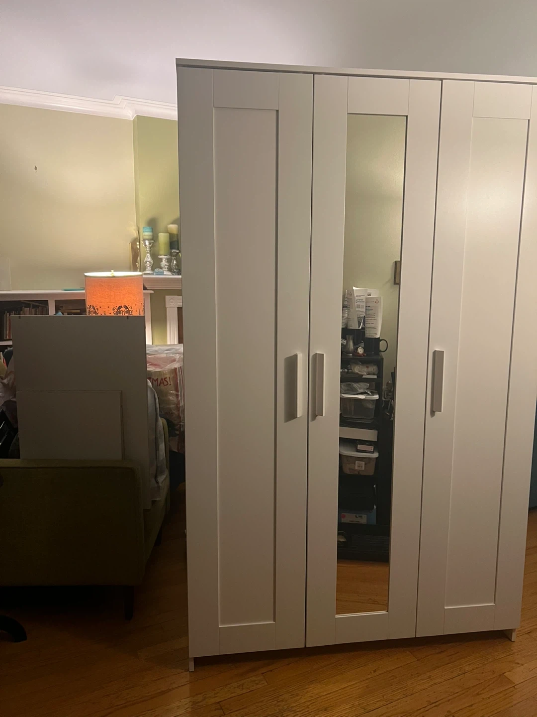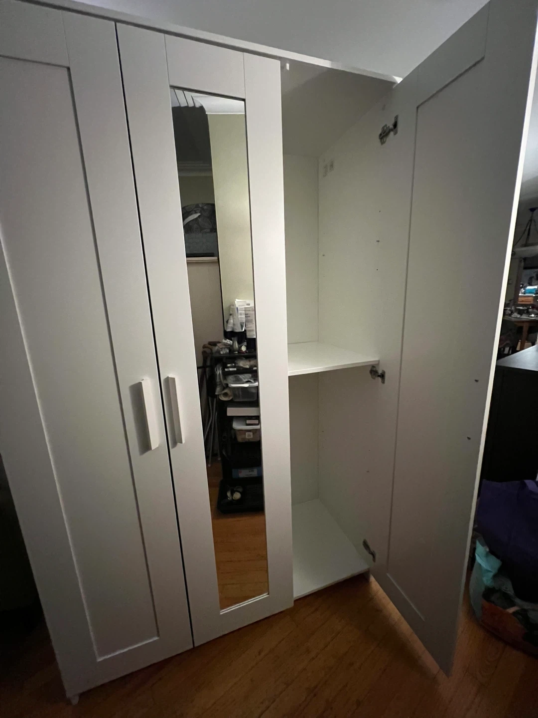 Roomy white wardrobe with full length mirror on one door. Door position can be changed. Used to store costumes for my daughter but she has outgrown it so it needs a new home. Sturdy and heavy, needs two strong people and a dolly to move.