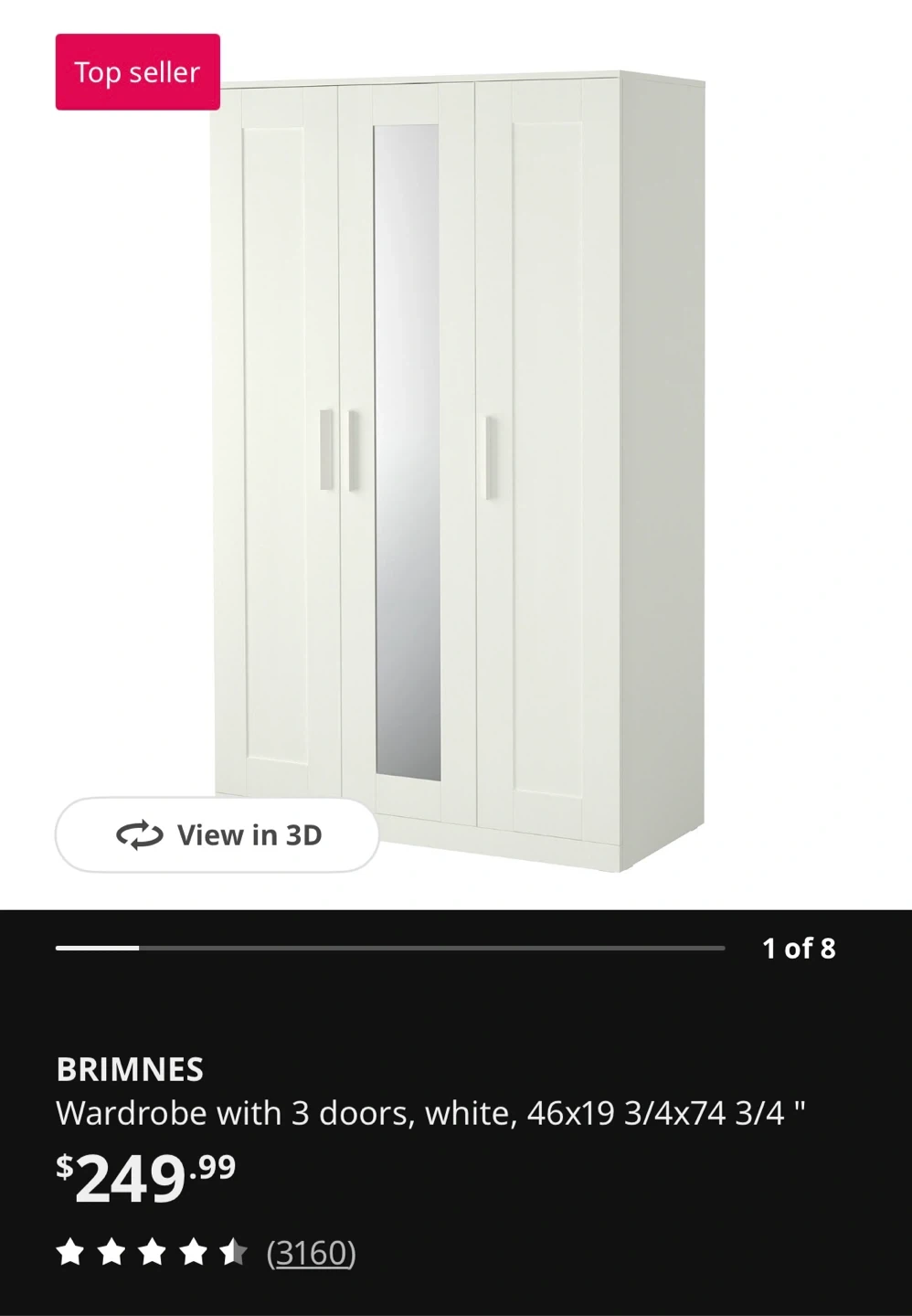 IKEA Brimnes wardrobe, white with three doors, one mirrored