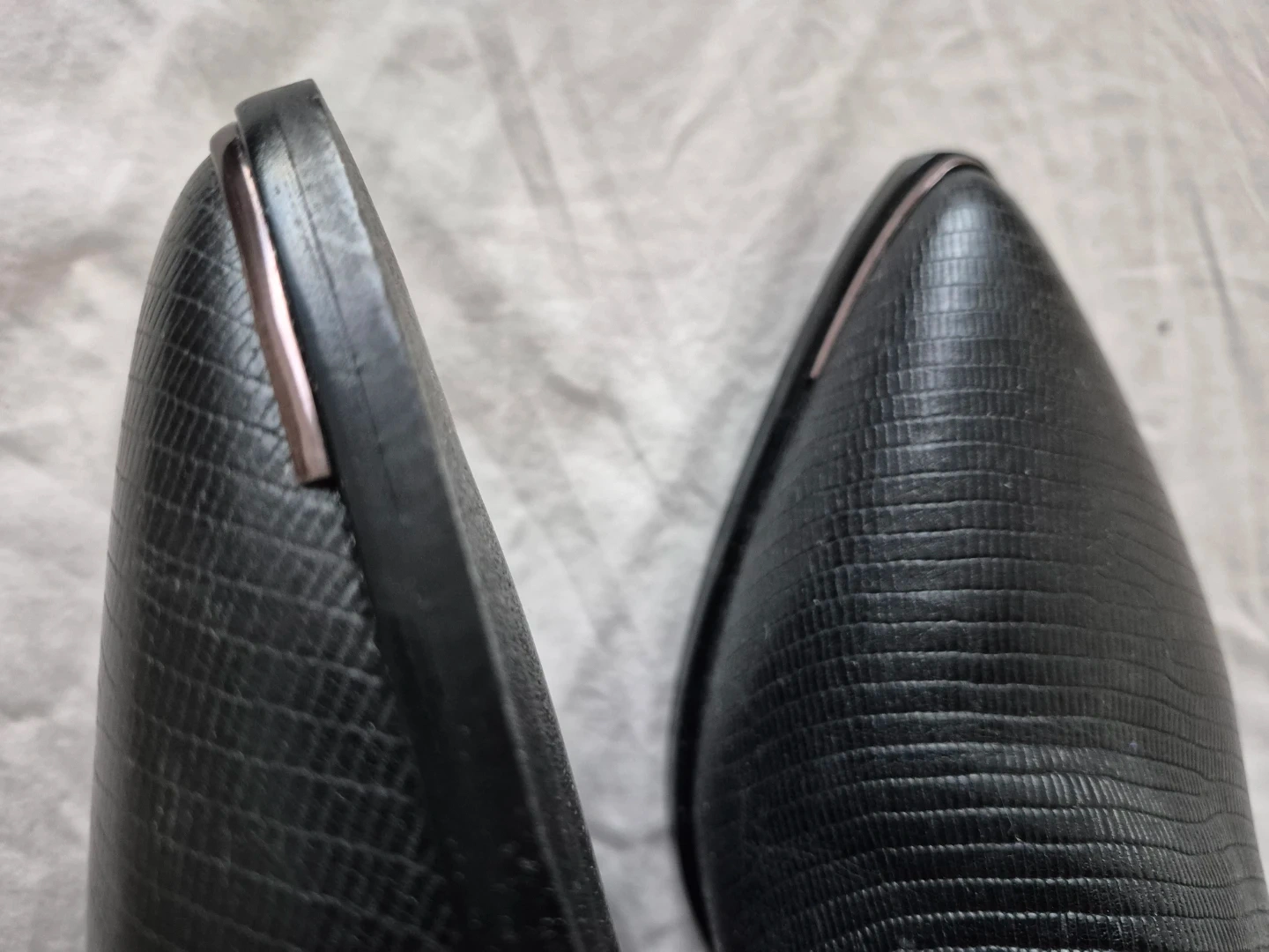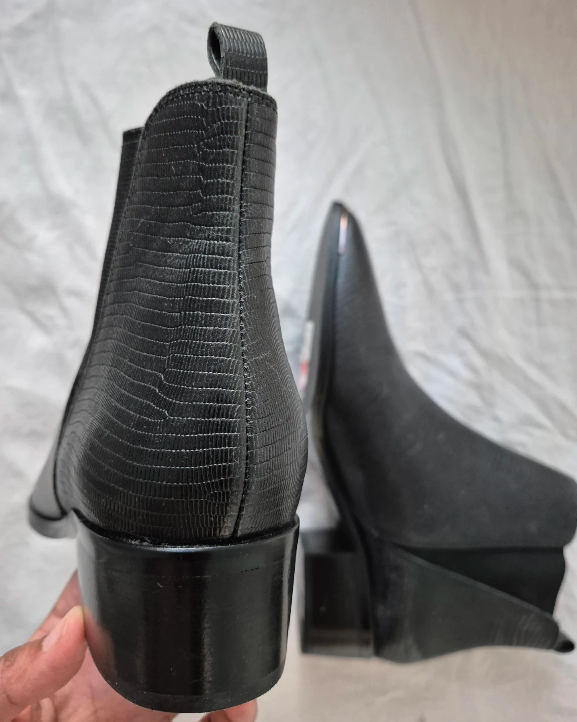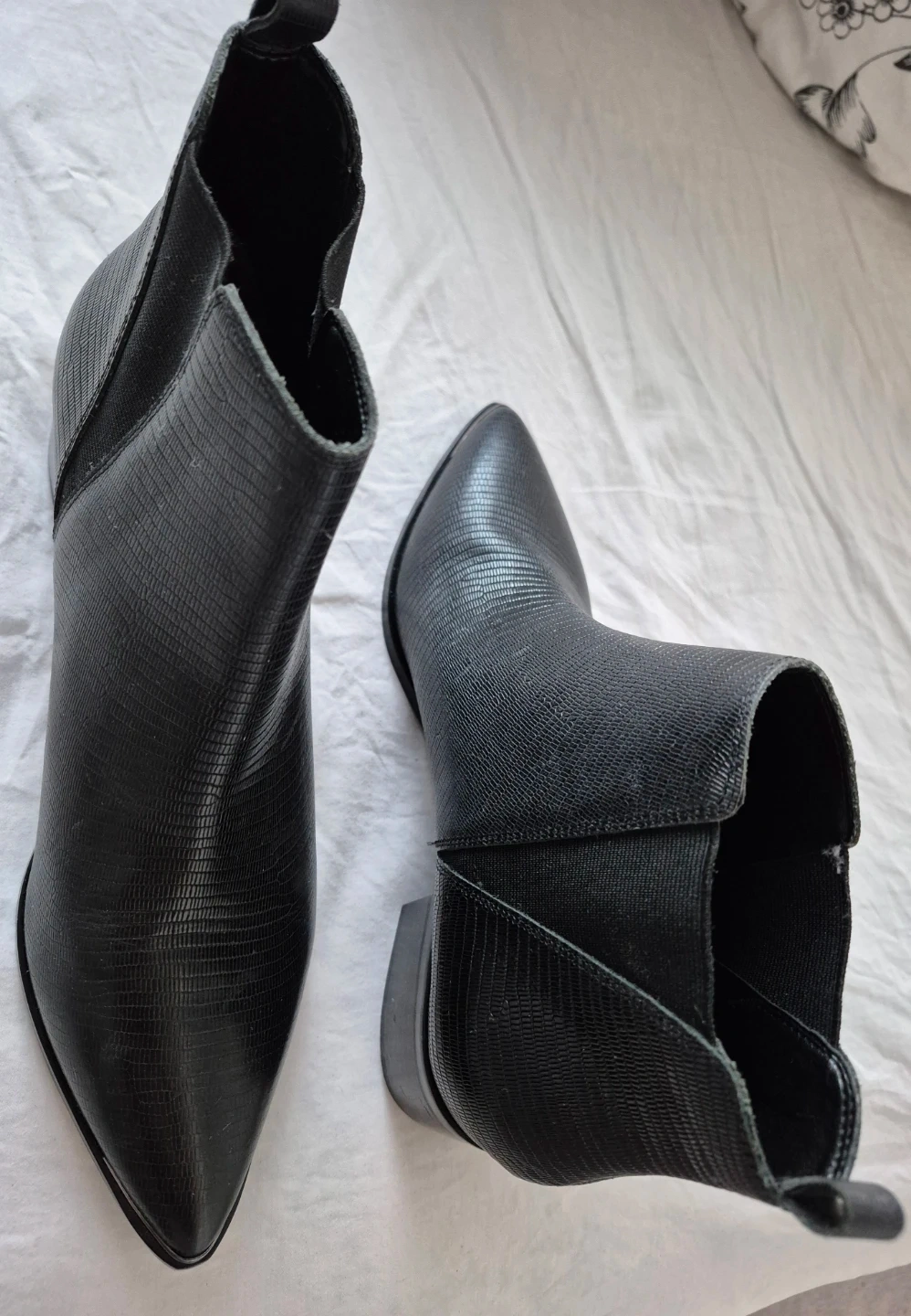 Super stylish black ankle boots with a lizard embossed texture.