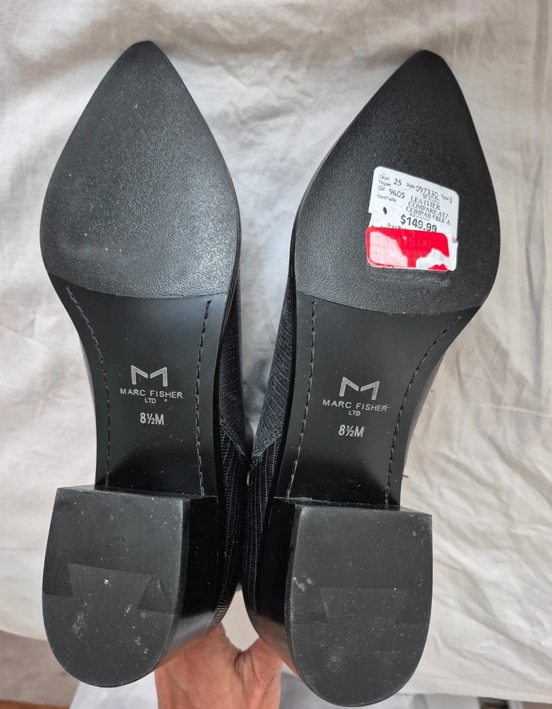 They're a size 8.5M with elastic side panels for an easy fit. The block heel offers a bit of lift.